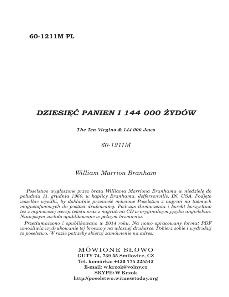 60-1211M PL DZIESIĘĆ PANIEN I 144 000 ŻYDÓW The Ten Virgins & 144 000 Jews 60-1211M William Marrion Branham Poselstwo wygłoszone przez brata Williama Marriona Branhama w niedzielę do południa 11. grudnia 1960, w kaplicy Branhama, Jeffersonville, IN, USA. Podjęto wszelkie wysiłki, by dokładnie przenieść mówione Poselstwo z nagrań na taśmach magnetofonowych do postaci drukowanej. Podczas tłumaczenia i korekt korzystano też z najnowszej wersji tekstu oraz z nagrań na CD w oryginalnym języku angielskim. Niniejszym zostało opublikowane w pełnym brzmieniu. Przetłumaczono i opublikowano w 2014 roku. Na nowo opracowany format PDF umożliwia wydrukowanie tej broszury na własnej drukarce. Pobierz sobie i wydrukuj to poselstwo. W razie potrzeby skieruj zamówienie na adres: MÓWIONE SŁOWO GUTY 74, 739 55 Smilovice, CZ Tel. komórka: +420 775 225542 E-mail: [email protected] SKYPE: W Krzok http://poselstwo.witnesstoday.org 2 Dziesięć panien i 144 000 Żydów Dzień dobry! Tak bardzo cieszę się, że dziś rano mogę być znowu tutaj w usłudze Pańskiej. Na zewnątrz jest dzisiaj zła pogoda, lecz wewnątrz jest naprawdę dobrze. Tym razem możemy powiedzieć, że lepiej jest być wewnątrz i patrzeć się na zewnątrz (nieprawdaż?), niż być na zewnątrz i patrzeć się do wewnątrz. 2 Odpocząłem dobrze ubiegłej nocy i czuję się dziś rano o wiele lepiej. Wczoraj wieczorem przeżyliśmy cudowne chwile, nieprawdaż? Po prostu był to wspaniały czas. Cenię to sobie bardzo. Mieliśmy… To nabożeństwo było podobne do tego, które odbyło się w Shreveport, było po prostu kontynuacją i naśladowaniem Ducha Świętego, który nam towarzyszy. Uhm. Cieszymy się więc bardzo i jesteśmy tak Bogu wdzięczni za Jego dobroć i miłosierdzie, i za wasze… Wy ludzie oddajecie swojego ducha Jemu do współpracy, aby On mógł nas prowadzić i kierować nami. 3 Patrzcie, jeżeli macie oburzających się słuchaczy, to Duch Święty nie będzie nic objawiał. Musicie mieć kogoś, kto z Nim współpracuje. „Oni byli zgromadzeni jednomyślnie na jednym miejscu” i wtedy przyszedł dźwięk szumiącego wiatru z Niebios. Rozumiecie. Lecz kiedy macie… 4 Bez względu na to, jak bardzo bym się modlił, choćbym leżał cały dzień i noc przed Panem pogrążony w modlitwie i zagłębiałbym się w Słowie, i z takim namaszczeniem przyszedłbym tutaj, ale odczułbym, że słuchacze mają pretensje, rozumiecie, to On po prostu – On odszedłby zasmucony i nic by nie objawił. Lecz gdy przyjdę tu pod namaszczeniem i odczuwam, że słuchacze są pod namaszczeniem, wtedy Duch Święty zaczyna działać, zaczyna się tu przechadzać i czyni dla nas wielkie sprawy. Tak, czy rozumiecie to teraz? 5 Nie rozmawiałem jeszcze z pastorem o tym. Słyszałem, że śpiewacie: „Tylko Mu wierz...”, więc wszedłem śpiesznie do środka, by zobaczyć, co on ma… jak wyobraża sobie usługę dzisiaj do południa. Więc, bracie Neville, chciałbym ci powiedzieć, że rozpocznę to małe niedzielne nabożeństwo i jeśli skończę do około jedenastej godziny, ty przejmiesz usługę i zaczniesz głosić, dobrze? Co ty na to? [Brat Neville odpowiada: „Dobrze, nie naruszaj namaszczenia, mów po prostu dalej” – wyd.] O, wierzę, że namaszczenie, które jest tutaj, jest także tam w tyle. On jest… 6 Brat Neville ma zawsze… Obcym, którzy nie byli tutaj jeszcze nigdy, chciałbym powiedzieć, że on jest – nie mówię to przed nim specjalnie, lecz on był zawsze bardzo uprzejmym człowiekiem. On zawsze czyta i przeżywa to miejsce z Pisma: „uważajcie jedni drugich za wyższych od siebie” – zawsze w Chrystusie i zawsze daje drugiemu pierwszeństwo. Już od czasu, kiedy go poznałem, był on takim; nie tylko od czasu, gdy 1 DZIESIĘĆ PANIEN I 144 000 ŻYDÓW 3 on jest tutaj w kaplicy, lecz już od czasu, gdy go poznałem, a było to już wiele lat temu. 7 Przypominam sobie, że po raz pierwszy zobaczyłem brata Neville i poznałem go, kiedy udałem się do metodystycznego kościoła pewnego razu i słuchałem, jak on głosił. Było to w Howard Park, wiele, wiele lat temu. Myślę, że upłynęło już dwadzieścia lat lub więcej od czasu, gdy go poznałem. Wtedy on również pracował; był zatrudniony aż do niedawna w leśnictwie w górach koło Henryville, skąd on pochodzi. Pracował tam, by zarobić na utrzymanie, a prócz tego głosił Słowo Boże. 8 Tak samo ja czyniłem to przez całe moje życie aż do niedawna. A potem rozpoczęliśmy głoszenie i nie mogliśmy wykonywać już nic innego, niż głosić Słowo. Więc tak bardzo cieszę się z tego. Jestem bardzo zadowolony z naszego nowego Kierownika, czy ty nie, br. Neville? Absolutnie tak. Lubię Go na pewno. Tak jest. Jestem po prostu tak bardzo zadowolony z Niego! 9 A więc – myślę, że dziś nie będzie szkółki niedzielnej dla dzieci. Tak jest. Nie będzie szkółki niedzielnej dla dzieci, ponieważ usunęliśmy przepierzenia, by nabożeństwo mogło odbywać się w całym pomieszczeniu aż do tyłu. 10 Dzisiaj wieczorem podejmiemy się tego ostatniego wielkiego wieku – laodycejskiego. Wczoraj wieczorem mówiliśmy na temat filadelfijskiego wieku i doszliśmy aż do początku wieku laodycejskiego, do tego jak się przekrywają. A potem te wielkie tajemnice, które Bóg zaczął nam objawiać – te wielkie tajemnice, które wydarzyły się pomiędzy tymi dwoma epokami – „otwarte drzwi, niewielka moc, zachował Moje Słowo i ma Moje imię”. Jesteśmy bardzo wdzięczni za wszystkie te małe, związane z tym sprawy, które Bóg tak cudownie uczynił realnymi dla nas. 11 Nie zapomnijcie, jeśli między naszymi gośćmi są chorzy, w przyszłą niedzielę będziemy się o nich modlić, za tydzień od dzisiaj. I to będzie, jeśli Pan pozwoli. Czy zwróciliście uwagę, jak to zawsze mówię: „Jeśli Pan pozwoli”? Biblia mówi nam, żebyśmy tak postępowali: „Jeśli Pan pozwoli”. My tego je