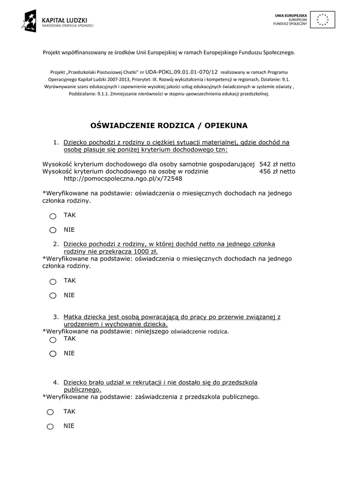 Projekt współfinansowany ze środków Unii Europejskiej w ramach Europejskiego Funduszu Społecznego. Projekt „Przedszkolaki Piastusiowej Chatki” nr UDA-POKL.09.01.01-070/12 realizowany w ramach Programu Operacyjnego Kapitał Ludzki 2007‐2013, Priorytet: IX. Rozwój wykształcenia i kompetencji w regionach, Działanie: 9.1. Wyrównywanie szans edukacyjnych i zapewnienie wysokiej jakości usług edukacyjnych świadczonych w systemie oświaty , Poddziałanie: 9.1.1. Zmniejszanie nierówności w stopniu upowszechnienia edukacji przedszkolnej. OŚWIADCZENIE RODZICA / OPIEKUNA 1. Dziecko pochodzi z rodziny o ciężkiej sytuacji materialnej, gdzie dochód na osobę plasuje się poniżej kryterium dochodowego tzn: Wysokość kryterium dochodowego dla osoby samotnie gospodarującej 542 zł netto Wysokość kryterium dochodowego na osobę w rodzinie 456 zł netto http://pomocspoleczna.ngo.pl/x/72548 *Weryfikowane na podstawie: oświadczenia o miesięcznych dochodach na jednego członka rodziny. TAK NIE 2. Dziecko pochodzi z rodziny, w której dochód netto na jednego członka rodziny nie przekracza 1000 zł. *Weryfikowane na podstawie: oświadczenia o miesięcznych dochodach na jednego członka rodziny. TAK NIE 3. Matka dziecka jest osobą powracającą do pracy po przerwie związanej z urodzeniem i wychowanie dziecka. *Weryfikowane na podstawie: niniejszego oświadczenie rodzica. TAK NIE 4. Dziecko brało udział w rekrutacji i nie dostało się do przedszkola publicznego. *Weryfikowane na podstawie: zaświadczenia z przedszkola publicznego. TAK NIE Projekt współfinansowany ze środków Unii Europejskiej w ramach Europejskiego Funduszu Społecznego. 5. Oboje rodziców dziecka pracuje lub jedno pracuje, a drugie zamierza podjąć pracę. *Weryfikowane na podstawie: niniejszego oświadczenie rodzica. TAK NIE …..……………………………………… MIEJSCOWOŚĆ I DATA ……………………………………….……………………………… CZYTELNY PODPIS RODZICA/OPIEKUNA DZIECKA UCZESTNICZĄCEGO W PROJEKCIE Wypełnia organizator Przyznane punkty: 1 ……….. 2 TAK / NIE 3 ………. 4 …...... 5 ……….. ……………………………………………………… Data i podpis Organizatora *Do grupy kobiet powracających na rynek pracy po przerwie związanej z urodzeniem i wychowaniem dzieci zalicza się kobiety, które w dniu przystąpienia do projektu są zatrudnione na podstawie stosunku pracy lub umowy cywilno-prawnej przez okres nie dłuższy niż rok oraz które przed podjęciem obecnie trwającego stosunku pracy lub umowy cywilno-prawnej przez nieprzerwany okres co najmniej 12 miesięcy charakteryzowały się brakiem stałego zatrudnienia związanego z urodzeniem i wychowaniem dzieci (przy czym do okresu tego nie należy wliczać czasowych umów cywilno-prawnych zawieranych na okres krótszy niż 12 miesięcy, a także okresu trwania urlopu macierzyńskiego lub wychowawczego).
