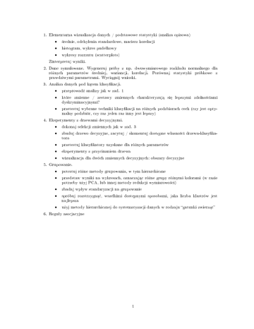 1. Elementarna wizualizacja danych / podstawowe statystyki (analiza opisowa) • ±rednie, odchylenia standardowe, macierz korelacji • histogram, wykres pudeªkowy • wykresy rozrzutu (scatterplots) Zinterpretuj wyniki. 2. Dane symulowane. Wygeneruj próby z np. dwuwymiarowego rozkªadu normalnego dla ró»nych parametrów ±redniej, wariancji, korelacji. Porównaj statystyki próbkowe z prawdziwymi parametrami. Wyci¡gnij wnioski. 3. Analiza danych pod k¡tem klasykacji. • przeprowad¹ analizy jak w zad. 1 • które zmienne / zestawy zmiennych charakteryzuj¡ si¦ lepszymi zdolno±ciami dyskryminacyjnymi? • przetestuj wybrane techniki klasykacji na ró»nych podzbiorach cech (czy jest optymalny podzbiór, czy raz jeden raz inny jest lepszy) 4. Eksperymenty z drzewami decyzyjnymi. • dokonaj selekcji zmiennych jak w zad. 3 • zbuduj drzewo decyzyjne, zacytuj / skomentuj dost¦pne wªasno±ci drzewa-klasykatora • przetestuj klasykatory uzyskane dla ró»nych parametrów • eksperymenty z przycinaniem drzewa • wizualizacja dla dwóch zmiennych decyzyjnych: obszary decyzyjne 5. Grupowanie. • potestuj ró»ne metody grupowania, w tym hierarchiczne • przedstaw wyniki na wykresach, oznaczaj¡c ró»ne grupy ró»nymi kolorami (w razie potrzeby u»yj PCA, lub innej metody redukcji wymiarowo±ci) • zbadaj wpªyw standaryzacji na grupowanie • spróbuj rozstrzygn¡¢, wszelkimi dost¦pnymi sposobami, jaka liczba klastrów jest najlepsza • u»yj metody hierarchicznej do systematyzacji danych w rodzaju gatunki zwierz¡t 6. Reguªy asocjacyjne 1
