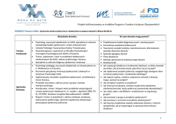 DORADCY FUNDACJI UAM – BEZPŁATNA OFERTA KONSULTACJI I DORADZTWA W RAMACH PROJEKTU WODA NA MŁYN Wizytówka doradcy Tomasz Pasikowski Agnieszka Rosińska Psycholog, nauczyciel akademicki na UAM, specjalista w zakresie metodologii badań społecznych i analiz statystycznych Członek Polskiego Towarzystwa Analizy Transakcyjnej Psychoterapeuta i superwizor w Ośrodku Psychoterapii i Treningów Psychologicznych AION w Poznaniu Trener, superwizor i tutor w projektach badawczych i szkoleniowych dla NGO, sektora publicznego i biznesu Specjalista w zakresie diagnozy społecznej i ewaluacji Psycholog i pedagog, nauczyciel akademicki na Uniwersytecie im. A. Mickiewicza w Poznaniu Kierownik specjalizacji Animacja Społeczności Lokalnych w Instytucie Psychologii UAM Dyplomowany menedżer projektów badawczych, certyfikowany trener biznesu, Prowadzi warsztaty z zakresu pracy z grupą i rozwoju interpersonalnego Koordynator, trener i ekspert wielu projektów wspierających rozwój społeczności lokalnych m. in. Leader+, Agrolinia 2000, PO KL, PO RYBY, działania Urzędów Marszałkowskich i ARiMR Ekspert i trener w projektach z zakresu edukacji, ewaluacji, wykluczenia społecznego, ekonomii społecznej, aktywizacji i partycypacji społecznej publicznej W czym doradcy mogą pomóc? Projektowanie badań diagnostycznych i ewaluacyjnych Konsultacje projektów badawczych Tworzenie narzędzi (ankiety, kwestionariusze, alternatywne sposoby zbierania danych) Sposoby agregacji danych Plany badawcze Metody opracowania statystycznego danych Multikontrakt Jak rozpocząć działania w środowisku lokalnym, w który niewiele się dzieje i jak je kontynuować, gdy dziać się już zaczęło? Jak zaplanować projekt społeczny uwzględniając dostępne dane na temat społeczności i środowiska lokalnego? Jak napisać spójny, czytelny i poprawny wniosek o dotację mając pomysł na projekt? Jak zarządzać ryzykiem w projekcie? Jak stworzyć atrakcyjne, ciekawe wydarzenia (spotkanie, szkolenie/warsztat, akcję społeczną, kawiarenkę obywatelską?) Jak radzić sobie z konfliktami i trudnościami w organizacji, grupie? Jak pracować z grupą w projekcie społecznym? Jak pracować z uczniami w projekcie edukacyjnym? Jak tworzyć projektowe zespoły zadaniowe złożone z różnych specjalistów, jak je wspomagać w sprawnej komunikacji i działaniu? 1 DORADCY FUNDACJI UAM – BEZPŁATNA OFERTA KONSULTACJI I DORADZTWA W RAMACH PROJEKTU WODA NA MŁYN Inga Kawałek Magda Przystałowska Dyrektor biura partnerstwa trójsektorowego Fundacji Partnerstwo Dorzecze Słupi w Krzyni (woj pomorskie). Specjalistka ds. zarządzania projektem oraz planowania strategicznego, autorka i koordynatorka różnego typu projektów (w tym szkoleniowych), Trenerka i coach (Szkoła Coachów Wszechnicy Uniwersytetu Jagiellońskiego) współpracująca z biznesem, sektorem publicznym i organizacjami pozarządowymi; Animatorka pracująca na rzecz lokalnych partnerstw międzysektorowych - szczególnie partnerstw typu Lokalne Grupy Działania i Lokalne Grupy Rybackie; Od 2003 roku trenerka Forum Aktywizacji Obszarów Wiejskich, a od 2010 roku członkini Zarządu FAOW; od 2009 roku Przewodnicząca Pomorskiej Sieci Leader; Posiada doświadczenie w realizacji międzynarodowych projektów kształcenia animatorów partnerstw lokalnych typu Leader Psycholog, ze specjalizacją Animacja Społeczności Lokalnych Aktualnie koordynatorka projektu Woda na Młyn Współautor i koordynator projektów społecznych z zakresu diagnozy społecznej, animacji i aktywizacji społecznej Była animatorką i doradczynią w projekcie Rady Pożytku do STANDARDowego Użytku w ramach POKL Uczestniczka akcji Masz Głos Masz Wybór w działaniu Lepsze Instytucje Prowadzi warsztaty z zakresu działań społecznych Członek zarządu Stowarzyszenia „Zamek” w Biedrusku Przewodnicząca Zarządu Osiedla Biedrusko Planowanie strategiczne rozwoju społeczności i organizacji Budowanie organizacji pozarządowych – w aspekcie miękkim związanym z relacjami między ludźmi (jak budować grupę, jak podejmować działania z ludźmi ze społeczności), ale także w aspekcie formalno–prawnym (przepisy, dokumenty, urzędy)? Partnerstwa międzysektorowe – czy i jak je tworzyć – także z uwzględnieniem aspektów formalno - prawnych Źródła finansowania działalności społecznej – sąd brać pieniądze na działania społeczne Projekty społeczne - tworzenie i realizacja – jak stworzyć projekt i napisać wniosek Polityki rozwojowe- -tworzenie i realizacja Programy operacyjne - zasady, reguły, perspektywy – m. in. program PROW, Leader, FIO Jak animować i aktywizować społeczność lokalną? Planowanie zmiany, odnoszenie działań do diagnozy społeczności. Budowanie organizacji pozarządowych – w aspekcie miękkim związanym z relacjami między ludźmi (jak budować grupę, jak podejmować działania z ludźmi ze społeczności), ale także w aspekcie formalno–prawnym (przepisy, dokumenty, urzędy)? Możliwości pozyskiwania funduszy na działania społeczne – także w ramach współpracy z Jednostką Samorządu Terytorialnego. Jak napisać wniosek o dotację? Koordynacja projektu. Jak ogarnąć faktury, umowy, płatności, sprawozdania, tabele i inne trudne rzeczy na drodze społecznika. Informatyczne narzędzia ułatwiające pracę w projekcie 2 DORADCY FUNDACJI UAM – BEZPŁATNA OFERTA KONSULTACJI I DORADZTWA W RAMACH PROJEKTU WODA NA MŁYN Katarzyna Wiecheć Małgorzata Fidera Psycholog ze specjalizacją Animacja Społeczności Lokalnych, Organizowała i realizowała warsztaty o tematyce psychologicznej z zakresu wychowania, metod nauczania, pracy grupowej, wspierania umiejętności samodzielnego uczenia się Prowadziła zajęcia w ramach Aktywnego Małego Uniwersytetu Latającego przy Instytucie Psychologii UAM Współprowadziła warsztat z zakresu współpracy międzysektorowej i współpracy w zespołach zadaniowych dla NGO i urzędników z Obwodu Lwow