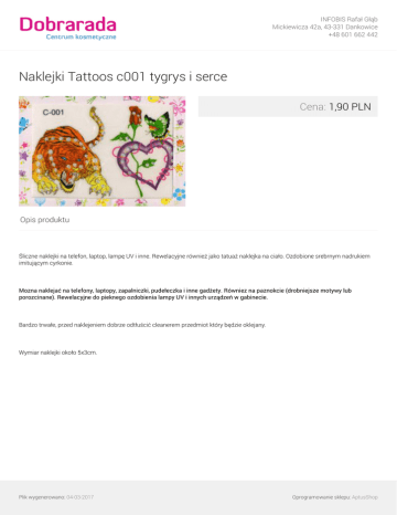 INFOBIS Rafał Głąb Mickiewicza 42a, 43-331 Dankowice +48 601 662 442 Naklejki Tattoos c001 tygrys i serce Cena: 1,90 PLN Opis produktu Śliczne naklejki na telefon, laptop, lampę UV i inne. Rewelacyjne również jako tatuaż naklejka na ciało. Ozdobione srebrnym nadrukiem imitującym cyrkonie. Mozna naklejać na telefony, laptopy, zapalniczki, pudełeczka i inne gadżety. Równiez na paznokcie (drobniejsze motywy lub porozcinane). Rewelacyjne do pieknego ozdobienia lampy UV i innych urządzeń w gabinecie. Bardzo trwałe, przed naklejeniem dobrze odtłuścić cleanerem przedmiot który będzie oklejany. Wymiar naklejki około 5x3cm. Plik wygenerowano: 04-03-2017 Oprogramowanie sklepu: AptusShop INFOBIS Rafał Głąb Mickiewicza 42a, 43-331 Dankowice +48 601 662 442 Galeria Plik wygenerowano: 04-03-2017 Powered by TCPDF (www.tcpdf.org) Oprogramowanie sklepu: AptusShop