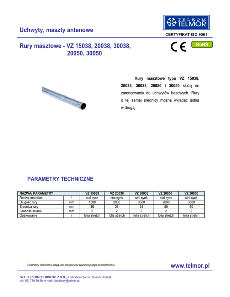 Uchwyty, maszty antenowe CERTYFIKAT ISO 9001 RoHS Rury masztowe - VZ 15038, 20038, 30038, 20050, 30050 Rury masztowe typu VZ 15038, 20038, 30038, 20050 i 30050 służą do zamocowania do uchwytów bazowych. Rury o tej samej średnicy można wkładać jedna w drugą. PARAMETRY TECHNICZNE NAZWA/ PARAMETRY Rodzaj materiału Długość rury Średnica rury Grubość ścianki Opakowanie / mm mm mm / VZ 15038 stal cynk 1500 38 2 folia stretch VZ 20038 stal cynk 2000 38 2 folia stretch Parametry techniczne mogą ulec zmianie bez wcześniejszego powiadomienia. GZT TELKOM-TELMOR SP. Z O.O, ul. Mickiewicza 5/7, 80-425 Gdańsk tel.( 58) 739 59 59, e-mail: [email protected] VZ 30038 stal cynk 3000 38 2 folia stretch VZ 20050 stal cynk 2000 50 2 folia stretch VZ 30050 stal cynk 3000 50 2 folia stretch www.telmor.pl