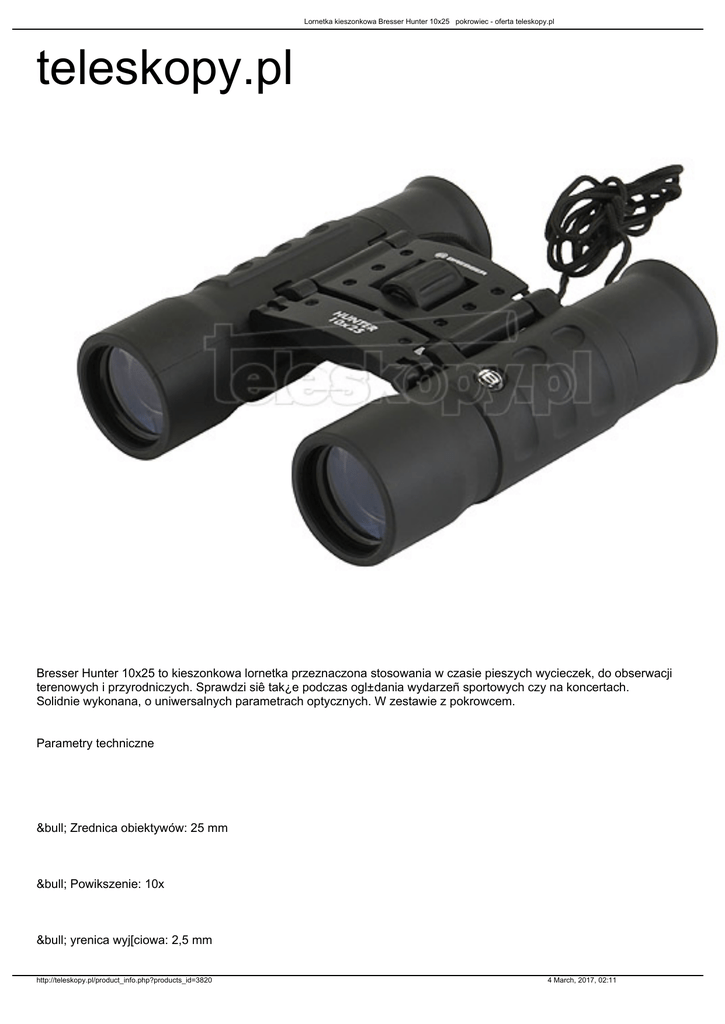 Lornetka kieszonkowa Bresser Hunter 10x25 pokrowiec - oferta teleskopy.pl