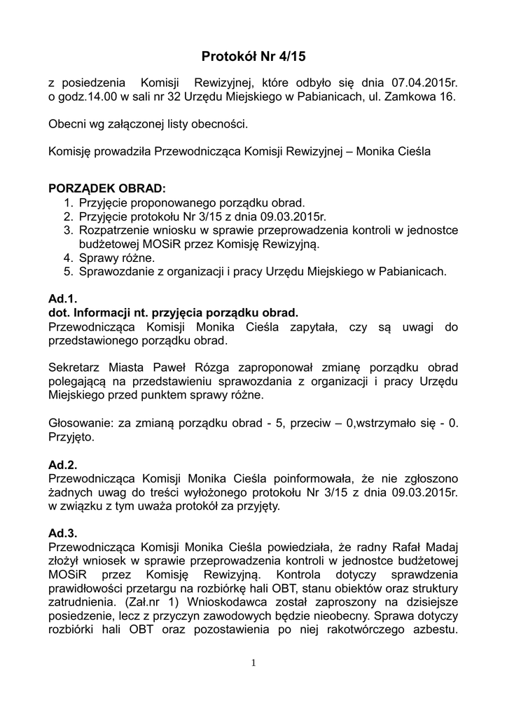 Protokół Nr 4/15 z posiedzenia Komisji Rewizyjnej, które odbyło się dnia 07.04.2015r. o godz.14.00 w sali nr 32 Urzędu Miejskiego w Pabianicach, ul. Zamkowa 16. Obecni wg załączonej listy obecności. Komisję prowadziła Przewodnicząca Komisji Rewizyjnej – Monika Cieśla PORZĄDEK OBRAD: 1. Przyjęcie proponowanego porządku obrad. 2. Przyjęcie protokołu Nr 3/15 z dnia 09.03.2015r. 3. Rozpatrzenie wniosku w sprawie przeprowadzenia kontroli w jednostce budżetowej MOSiR przez Komisję Rewizyjną. 4. Sprawy różne. 5. Sprawozdanie z organizacji i pracy Urzędu Miejskiego w Pabianicach. Ad.1. dot. Informacji nt. przyjęcia porządku obrad. Przewodnicząca Komisji Monika Cieśla zapytała, czy są uwagi do przedstawionego porządku obrad. Sekretarz Miasta Paweł Rózga zaproponował zmianę porządku obrad polegającą na przedstawieniu sprawozdania z organizacji i pracy Urzędu Miejskiego przed punktem sprawy różne. Głosowanie: za zmianą porządku obrad - 5, przeciw – 0,wstrzymało się - 0. Przyjęto. Ad.2. Przewodnicząca Komisji Monika Cieśla poinformowała, że nie zgłoszono żadnych uwag do treści wyłożonego protokołu Nr 3/15 z dnia 09.03.2015r. w związku z tym uważa protokół za przyjęty. Ad.3. Przewodnicząca Komisji Monika Cieśla powiedziała, że radny Rafał Madaj złożył wniosek w sprawie przeprowadzenia kontroli w jednostce budżetowej MOSiR przez Komisję Rewizyjną. Kontrola dotyczy sprawdzenia prawidłowości przetargu na rozbiórkę hali OBT, stanu obiektów oraz struktury zatrudnienia. (Zał.nr 1) Wnioskodawca został zaproszony na dzisiejsze posiedzenie, lecz z przyczyn zawodowych będzie nieobecny. Sprawa dotyczy rozbiórki hali OBT oraz pozostawienia po niej rakotwórczego azbestu. 1 Zapytała, czy została rozpoczęta kontrola przez audytorów Urzędu Miejskiego. Sekretarz Miasta Paweł Rózga poinformował, że audytorom zostało zlecone przeprowadzenie kontroli na obiektach MOSiR. Przewodnicząca Komisji Monika Cieśla powiedziała, że w tej samej sprawie nie mogą toczyć się jednocześnie dwie kontrole. Komisja może zaproponować, aby kontrola rozpoczęła się w późniejszym terminie. Przewodniczący Rady Andrzej Żeligowski zapytał, czy koszty wywozu azbestu pokryła firma czy miasto. Sekretarz Miasta Paweł Rózga powiedział, że obowiązek zlecenia rozebrania hali OBT i wywiezienia azbestu ciąży na firmie, która wygrała przetarg. Jeżeli zleceniobiorca nie wywiąże się z tego zadania i z tego tytułu Urząd musiał ponieść jakieś koszty to jest obowiązek dochodzenia tego roszczenia od tej firmy i są prawne środki w postaci postępowania sądowego. Przewodnicząca Komisji Monika Cieśla poprosiła, aby Pan Prezydent udzielił informację w tej sprawie. Sekretarz Miasta Paweł Rózga powiedział, że jeżeli azbest nie został wywieziony przez wykonawcę i Urząd z tego tytułu poniósł koszty, to są na pewno kary umowne. Radny Zbigniew Grabarz zapytał, kto podpisał odbiór jeżeli nie zostało zakończone zadanie. Sekretarz Miasta Paweł Rózga powiedział, że w tej sprawie zostaną udzielone wyjaśnienia. Przewodnicząca Komisji Monika Cieśla ponowiła wniosek radnego Rafała Madaja w sprawie wprowadzenia do planu pracy kontroli Komisji Rewizyjnej na 2015 rok przeprowadzenie kontroli w Miejskim Ośrodku Sportu i Rekreacji w Pabianicach w zakresie sprawdzenia prawidłowości przeprowadzenia przetargu na rozbiórkę hali OBT, stanu obiektów oraz struktury zatrudnienia, wg stanu na ostatni dzień miesiąca poprzedzający rozpoczęcie tej kontroli. Stan osobowy zostanie ustalony na następnym posiedzeniu Komisji, po podjęciu uchwały przez Radę. Głosowanie: za przyjęciem wniosku – 5, przeciw – 0, wstrzymało się – 0. Przyjęto. 2 Ad.4. Sekretarz Miasta Paweł Rózga powiedział, że organizację Urzędu Miejskiego w Pabianicach reguluje Regulamin Organizacyjny Urzędu Miejskiego w Pabianicach, który zgodnie z art.33 ustawy o samorządzie gminnym nadawany jest przez wójta, burmistrza, prezydenta miasta w drodze zarządzenia. Jest to przepis szczególny, ponieważ w przypadku dwóch innych jednostek samorządu terytorialnego, powiatu i województwa, regulaminy nadaje rada w formie uchwały. W gminie jest to obowiązek Prezydenta Miasta czyli organu wykonawczego. Regulamin funkcjonujący w Urzędzie Miejskim w Pabianicach funkcjonuje od 2004 roku, był wielokrotnie zmieniany, w tej chwili ostateczny kształt został określony Zarządzeniem Nr 10/2015/P w dniu 16 stycznia 2015 roku. Aktualnie funkcjonuje 28 komórek organizacyjnych, w tym działa 15 na prawach wydziału: Kancelaria Prezydenta Miasta, Wydział Budżetu i Finansów, Wydział Podatków i Opłat Lokalnych, Wydział Spraw Społecznych i Gospodarczych, Wydział Edukacji, Kultury i Sportu, Wydział Inwestycji i Eksploatacji, Wydział Ochrony Środowiska, Wydział Gospodarki Nieruchomościami, Wydział Urbanistyki, Wydział Spraw Lokalowych, Wydział Spraw Obywatelskich, Wydział Zarządzania Kryzysowego i Informacji Niejawnych, Urząd Stanu Cywilnego, Biuro Rady Miejskiej, Straż Miejska| i 13 samodzielnych referatów, zespołów i stanowisk pracy: Sekretariat Prezydenta Miasta, Referat Spraw Pracowniczych, Archiwum Zakładowe, Zespół Radców Prawnych, Zespół ds. Audytu i Kontroli Wewnętrznej, Zespół Inżyniera Miasta, Zespół ds. promocji Miasta, Pełnomocnik ds. ochrony informacji niejawnych, Samodzielne stanowisko rzecznika prasowego, Samodzielne stanowisko ds. nadzoru właścicielskiego, Samodzielne stanowisko ds. bezpieczeństwa i higieny pracy, Samodzielne stanowisko ds. zamówień publicznych, Punkt Obsługi Inwestora. Zadania dla poszczególnych komórek organizacyjnych są ujęte w Regulaminie Organizacyjnym Urzędu Miejskiego. Kierownik danej komórki organizacyjnej w zakresach obowiązków przypisuje poszczególne zadania pracownikom. Przewodnicząca Komisji Monika Cieśla zapytała, czy od 1 stycznia 2015 r. nastąpiły