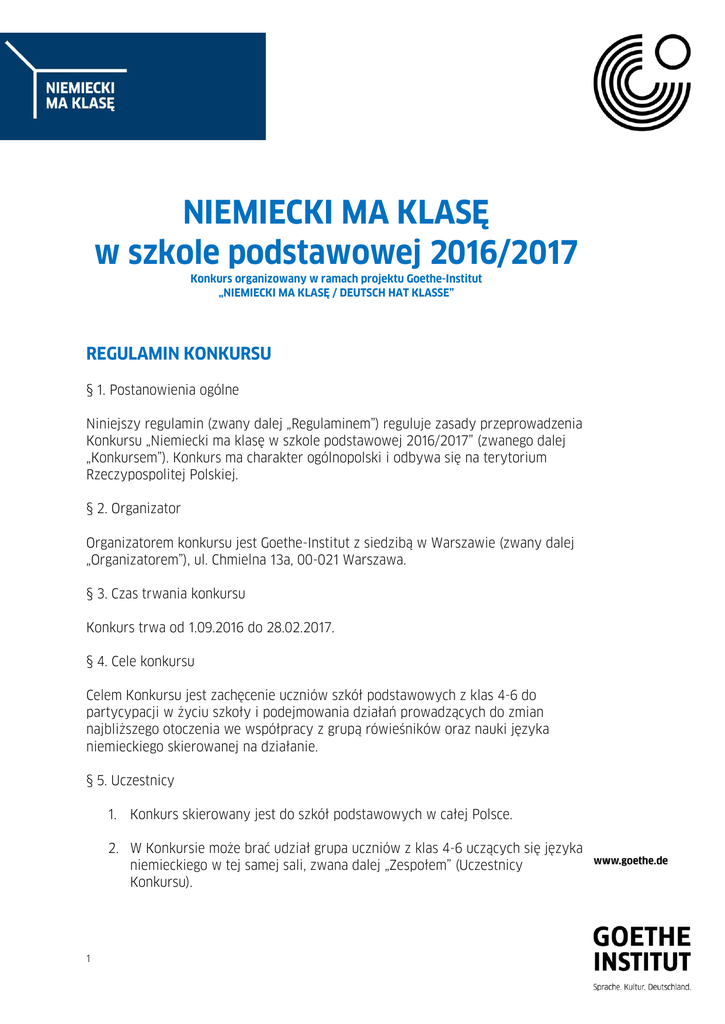 NIEMIECKI MA KLASĘ w szkole podstawowej 2016/2017 Konkurs organizowany w ramach projektu Goethe-Institut „NIEMIECKI MA KLASĘ / DEUTSCH HAT KLASSE” REGULAMIN KONKURSU § 1. Postanowienia ogólne Niniejszy regulamin (zwany dalej „Regulaminem”) reguluje zasady przeprowadzenia Konkursu „Niemiecki ma klasę w szkole podstawowej 2016/2017” (zwanego dalej „Konkursem”). Konkurs ma charakter ogólnopolski i odbywa się na terytorium Rzeczypospolitej Polskiej. § 2. Organizator Organizatorem konkursu jest Goethe-Institut z siedzibą w Warszawie (zwany dalej „Organizatorem”), ul. Chmielna 13a, 00-021 Warszawa. § 3. Czas trwania konkursu Konkurs trwa od 1.09.2016 do 28.02.2017. § 4. Cele konkursu Celem Konkursu jest zachęcenie uczniów szkół podstawowych z klas 4-6 do partycypacji w życiu szkoły i podejmowania działań prowadzących do zmian najbliższego otoczenia we współpracy z grupą rówieśników oraz nauki języka niemieckiego skierowanej na działanie. § 5. Uczestnicy 1. Konkurs skierowany jest do szkół podstawowych w całej Polsce. 2. W Konkursie może brać udział grupa uczniów z klas 4-6 uczących się języka niemieckiego w tej samej sali, zwana dalej „Zespołem” (Uczestnicy Konkursu). 1 Konkurs Goethe-Institut „Niemiecki ma klasę/Deutsch hat Klasse“ 3. W skład Zespołu mogą wejść tylko uczniowie szkoły podstawowej, która dokonała zgłoszenia do udziału w Konkursie. 4. Każdy Zespół musi mieć wyznaczonego Opiekuna (nauczyciela języka niemieckiego), który będzie uczestniczył w pracy Zespołu i prześle dokumentację. 5. Podczas przebiegu Konkursu Zespół może być wspierany przez różne środowiska: innych uczniów spoza zespołu, rodziców, innych nauczycieli niż opiekun, nauczycieli innych przedmiotów, dyrekcję szkoły, środowisko lokalne. 6. Udział w Konkursie musi odbywać się za zgodą dyrektora szkoły. 7. W Konkursie mogą brać udział wyłącznie szkoły, w których nauczanie języka niemieckiego odbywa się bezpłatnie. § 6. Przebieg Konkursu 1. Zgłoszenie do udziału w Konkursie (od 1.09.2016 do 15.10.2016) Opiekunowie nadsyłają drogą elektroniczną do 15.10.2016 wypełniony i podpisany formularz zgłoszeniowy na adres: [email protected] Nazwa pliku formularza powinna mieć następujący format: miejscowość (bez polskich znaków)_nazwaplacówki_anmeldung. Goethe-Institut potwierdza przyjęcie zgłoszenia do Konkursu w ciągu siedmiu dni od daty otrzymania zgłoszenia. 2. Udział w Konkursie: (od nadesłania zgłoszenia do 31.01.2017) Udział w Konkursie składa się z pięciu kroków oraz konferencji nt. „Partycypacji w szkołach podstawowych“ o Kroki 1-3 – Opiekunowie dokonują zmian w sali do języka niemieckiego, przeprowadzają zajęcia lekcyjne i rozmawiają na koniec lekcji z uczniami o tym, jak oni odebrali dokonane zmiany w sali i jak one wpłynęły na nich oraz ich pracę. Przykładowe zmiany to inne ustawienie ławek, np. w podkowę/wyspy/okrąg, lekcja bez ławek, inna pozycja biurka nauczycielskiego itp. Wyniki rozmów i istotne wypowiedzi uczniów należy udokumentować i w późniejszym kroku podsumować. Wskazówka: Krytyczne wypowiedzi uczniów wobec Konkurs Goethe-Institut „Niemiecki ma klasę/Deutsch hat Klasse“ o o o o dokonanych zmian należy traktować na równi z pozytywnymi reakcjami. Kroki 1-3 odbywają się w miesiącach październik, listopad, grudzień 2016 roku. W kroku 4 uczniowie tworzą w grupach plakat nt. „Moja idealna sala lekcyjna“. Krok 5 to dokumentacja Opiekuna, która polega na opisaniu i przedstawieniu w standaryzowanej formie doświadczeń i odczuć uczniów oraz wpływu dokonanych zmian w sali lekcyjnej na własną pracę. Odpowiedni kwestionariusz zostanie przesłany Opiekunom po zgłoszeniu do Konkursu. W lutym 2017 roku odbędzie się konferencja organizowana przez Goethe-Institut nt. „Partycypacji w szkołach podstawowych“, na którą Opiekunowie Zespołów konkursowych zostaną automatycznie zgłoszeni wraz z nadesłaniem zgłoszenia do Konkursu. Wszelkie koszty związane z udziałem w konferencji ponosi Goethe-Institut. 3. Dokumentacja konkursowa Forma dokumentacji Na dokumentację składają się cztery części: 1) Kwestionariusz 2) Plakat uczniów nt. „Moja idealna sala lekcyjna“ 3) Aktualna lista członków zespołu 4) Zgody na przetwarzanie danych osobowych oraz na wykorzystanie wizerunku o których mowa w § 11 pkt. 2 Regulaminu. Plakat musi być sporządzony w języku niemieckim na poziomie językowym odpowiadającym poziomowi językowemu Zespołu. Aktualna lista członków zespołu powinna zostać sporządzona w osobnym pliku tekstowym według wzoru: Imię Nazwisko. Dyplomy dla uczestników konkursu zostaną przygotowane wyłącznie na podstawie tej listy. Kwestionariusz i listę członków zespołu należy przesłać do 31.01.2017 wyłącznie drogą elektroniczną na adres: [email protected] Pliki powinny być zatytułowane według wzoru: miejscowość (bez polskich znaków)_nazwaplacówki_dokumentation. Plakaty wraz z oryginałami zgód na przetwarzanie danych osobowych oraz na wykorzystanie wizerunku należy przesłać pocztą na adres Goethe-Institut w Warszawie do 31.01.2017. Decyduje data stempla pocztowego. Konkurs Goethe-Institut „Niemiecki ma klasę/Deutsch hat Klasse“ Komisja konkursowa podejmuje decyzje na podstawie przesłanej dokumentacji. § 7. Termin składania dokumentacji Termin nadsyłania dokumentacji upływa we wtorek, 31.01.2017. Wszystkie zgłoszenia, które napłyną po 31.01.2017 nie zostaną uwzględnione. § 8. Komisja konkursowa 1. W skład Komisji konkursowej wejdą pracownicy Goethe-Institut, przedstawiciele szkół podstawowych, które brały udział w poprzednich edycjach oraz instytucji współpracujących i partnerskich. 2. Kryteria oceny: 2.1 Kompletność dokumentacji Dokumentacja jest kompletna, kiedy przedłożone zostaną wypełniony kwestionariusz, plakat sporządzony przez uczniów