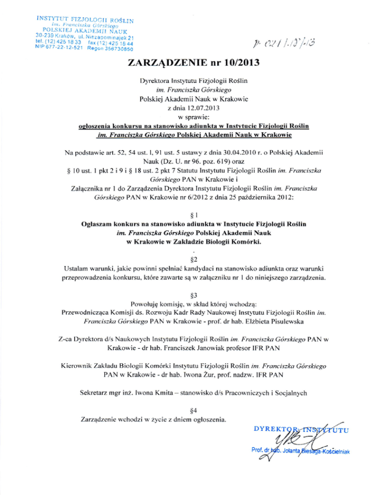 INST!,TUT FIVOLOGlI ROŚLIN Franci zk« Gór~kieg() POLSKIEJ AKADEMII NAUK 30-23~ Kraków, ul. NielilPOrninajek 21 leI. (1,,)4251833 fax(12)4251D44 NIP 677-22-12-521 Regon 356730850 Illl. j)- (~)l /./ J ,!rJ ZARZĄDZENIE nr 10/2013 Dyrektora Instytutu Fizjologii Roślin im. Franciszka Górskiego Polskiej Akademii Nauk w Krakowie z dnia 12.07.2013 w sprawie: ogłoszenia konkursu na stanowisko adiunkta w Instytucie Fizjologii Roślin im. Franciszka Górskiego Polskiej Akademii Nauk w Krakowie Na podstawie art. 52, 54 ust. 1,91 ust. 5 ustawy z dnia 30.04.2010 r. o Polskiej Akademii Nauk (Dz. U. nr 96. poz. 6 I9) oraz § 10 ust. I pkt 2 i 9 i § 18 ust. 2 pkt 7 Statutu Instytutu Fizjologii Roślin im. Franciszka Górskiego PAN w Krakowie i Załącznika nr 1 do Zarządzenia Dyrektora Instytutu Fizjologii Roślin im. Franciszka Górskiego PAN w Krakowie nr 6/20 I2 z dnia 25 października 20 I2: §I Ogłaszam konkurs na stanowisko adiunkta w Instytucie Fizjologii Roślin im. Franciszka Górskiego Polskiej Akademii Nauk w Krakowie w Zakładzie Biologii Komórki. §2 Ustalam warunki, jakie powinni spełniać kandydaci na stanowisko adiunkta oraz warunki przeprowadzenia konkursu, które zawarte są w załączniku nr I do niniejszego zarządzenia. §3 Powołuję komisję, w skład której wchodzą: Przewodnicząca Komisji ds. Rozwoju Kadr Rady Naukowej Instytutu Fizjologii Roślin im. Franciszka Górskiego PAN w Krakowie - prof. dr hab. Elżbieta Pisulewska Z-ca Dyrektora d/s Naukowych Instytutu Fizjologii Roślin im. Franciszka Górskiego PAN w Krakowie - dr hab. Franciszek Janowiak profesor IFR PAN Kierownik Zakładu Biologii Komórki Instytutu Fizjologii Roślin im. Franciszka Górskiego PAN w Krakowie - dr hab. Iwona Żur, prof. nadzw. IFR PAN Sekretarz mgr inż. Iwona Kmita - stanowisko d/s Pracowniczych §4 Zarządzenie wchodzi w życie z dniem ogłoszenia. i Socjalnych ZAŁĄCZNIK nr 1 do Zarządzenia nr 10/2013 Dyrektora Instytutu Fizjologii Roślin im. Franciszka Górskiego Polskiej Akademii Nauk Instytut Fizjologii Roślin im. Franciszka Górskiego Polskiej Akademii Nauk w Krakowie ogłasza konkurs na stanowisko: ADIUNKTA W ZAKŁADZIE BIOLOGII KOMÓRKI Zasady przeprowadzania konkursów na stanowisko adiunkta w IFR PAN określa załącznik nr 1 do Zarządzenia Dyrektora Nr 6/2012 z dnia 25 października 2012 dostępny na stronie internetowej Instytutu: http://ifr-pan.krakow.pl/test/bip/index.php?ver=0&dok=116 OPIS STANOWISKA: Prowadzenie badań naukowych według harmonogramu działalności statutowej Zakładu Biologii Komórki IFR PAN. Przejawianie aktywności badawczej poprzez publikację wyników badań, aktywny udział w konferencjach naukowych celem dynamicznego rozwoju naukowego. Podejmowanie starań o uzyskanie projektów badawczych. Wykazywanie inicjatyw w dążeniu do poprawy organizacji i poziomu prac naukowych prowadzonych w Instytucie oraz inicjowanie działań mających na celu poprawę pozycji Instytutu w rankingu placówek naukowych. Udział w pracach organizacyjno-technicznych związanych z realizacją zadań badawczych Przygotowywanie planów i sprawozdań badawczych. Kandydaci proszeni są o nadsyłanie zgłoszeń udziału w konkursie w formie listownej i elektronicznej do 31 lipca 2013 r. z dopiskiem „Konkurs adiunkt ZBK-IFR/2013” na adres: Instytut Fizjologii Roślin im. Franciszka Górskiego Polskiej Akademii Nauk ul. Niezapominajek 21, 30-239 Kraków, [email protected] WARUNKI DO SPEŁNIENIA: Wymagania i kwalifikacje dla adiunkta: Stopień naukowy doktora nauk rolniczych lub biologicznych. Dorobek naukowy udokumentowany publikacjami w czasopismach recenzowanych i uczestnictwem w konferencjach naukowych. Znajomość problematyki i nowoczesnych metod analitycznych stosowanych w zakresie fizjologii roślin, a zwłaszcza techniki kultur in vitro, analiz proteomicznych i molekularnych. Umiejętność planowania i prowadzenia pracy badawczej oraz doświadczenie w zdobywaniu środków finansowych na badania i w koordynowaniu projektów badawczych. Znajomość języka angielskiego w stopniu pozwalającym na swobodną komunikację w mowie i piśmie (mile widziane certyfikaty potwierdzające znajomość języka). Umiejętność pracy w środowisku Windows oraz znajomość użytkowych programów komputerowych i statystycznych. WYMAGANE DOKUMENTY: - podanie, - życiorys, - kwestionariusz osobowy, - odpis dyplomu uzyskania stopnia doktora nauk biologicznych lub rolniczych, - spis osiągnięć naukowo-badawczych, w tym: odbyte staże, wykaz publikacji, wystąpienia na konferencjach, - opis przebiegu dotychczasowej pracy, - oświadczenie o wyrażeniu zgody na przetwarzanie danych osobowych do celów rekrutacji. Wnioski mogą zawierać także dodatkowe informacje przydatne do oceny kwalifikacji i osiągnięć naukowych kandydata. Przystępujący do konkursu jest zobowiązany do złożenia oświadczenia, iż z chwilą podjęcia pracy Instytut Fizjologii Roślin im. Franciszka Górskiego Polskiej Akademii Nauk będzie jego podstawowym miejscem pracy. Przewidywany termin zatrudnienia: od września 2013 r. Forma zatrudnienia: umowa o pracę na czas określony, cały etat
