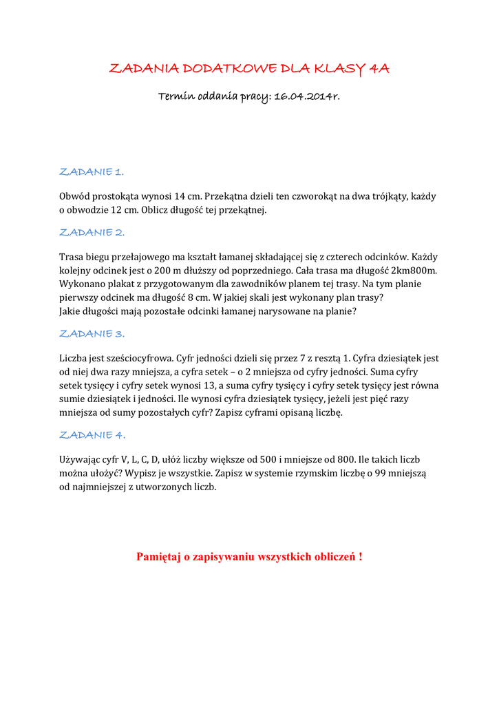 ZADANIA DODATKOWE DLA KLASY 4A Termin oddania pracy: 16.04.2014r. ZADANIE 1. Obwód prostokąta wynosi 14 cm. Przekątna dzieli ten czworokąt na dwa trójkąty, każdy o obwodzie 12 cm. Oblicz długość tej przekątnej. ZADANIE 2. Trasa biegu przełajowego ma kształt łamanej składającej się z czterech odcinków. Każdy kolejny odcinek jest o 200 m dłuższy od poprzedniego. Cała trasa ma długość 2km800m. Wykonano plakat z przygotowanym dla zawodników planem tej trasy. Na tym planie pierwszy odcinek ma długość 8 cm. W jakiej skali jest wykonany plan trasy? Jakie długości mają pozostałe odcinki łamanej narysowane na planie? ZADANIE 3. Liczba jest sześciocyfrowa. Cyfr jedności dzieli się przez 7 z resztą 1. Cyfra dziesiątek jest od niej dwa razy mniejsza, a cyfra setek – o 2 mniejsza od cyfry jedności. Suma cyfry setek tysięcy i cyfry setek wynosi 13, a suma cyfry tysięcy i cyfry setek tysięcy jest równa sumie dziesiątek i jedności. Ile wynosi cyfra dziesiątek tysięcy, jeżeli jest pięć razy mniejsza od sumy pozostałych cyfr? Zapisz cyframi opisaną liczbę. ZADANIE 4. Używając cyfr V, L, C, D, ułóż liczby większe od 500 i mniejsze od 800. Ile takich liczb można ułożyć? Wypisz je wszystkie. Zapisz w systemie rzymskim liczbę o 99 mniejszą od najmniejszej z utworzonych liczb. Pamiętaj o zapisywaniu wszystkich obliczeń ! ZADANIA DODATKOWE DLA KLASY 5A Termin oddania pracy: 16.04.2014r. ZADANIE 1. Puste kratki uzupełnij w taki sposób, aby suma każdej czwórki kolejnych liczb wynosiła 20: 2 5 8 ZADANIE 2. W 1111 roku Mikołaj Starszy miał 345 lat, a jego syn, Mikołaj Młodszy miał 111 lat. W którym roku Mikołaj Starszy będzie dwa razy starszy od Mikołaja Młodszego? ZADANIE 3. W dawnych czasach używano różnych jednostek długości. Na przykład sznur liczył 140 łokci, a pręt 14 stóp. Ponadto sznur liczył 140 stóp. Ile łokci liczył pręt ? ZADANIE 4. W pewnej klasie jest 30 uczniów. Wśród nich jest 5 takich, którzy mają brata i siostrę, oraz 7 takich, którzy nie mają ani brata ani siostry. Ilu uczniów tej klasy ma brata, jeśli wiadomo, że 13 ma siostrę? Pamiętaj o zapisywaniu wszystkich obliczeń! ZADANIA DODATKOWE DLA KLASY 6A Termin oddania pracy: 16.04.2014r. ZADANIE 1. Liczbę 2184 przedstaw w postaci iloczynu trzech kolejnych liczb naturalnych. ZADANIE 2. Pan Nowak jechał samochodem ze stałą przędkością. W ciągu 1 i ¾ godziny przejechał 140 km. Oblicz, ile kilometrów przejechałby, jadąc z tą samą prędkością 2 godziny. ZADANIE 3. Wszystkie numery stron pewnej książki mają razem 420 cyfr. Ile stron ma ta książka? ZADANIE 4. Ile minut na godzinę spieszy się zegar wskazówkowy, który po dokładnym nastawieniu pokaże dobry czas dopiero za 60 dni? Pamiętaj o zapisywaniu wszystkich obliczeń !