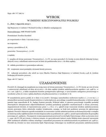 Sygn. akt: I C 796/12 WYROK W IMIENIU RZECZYPOSPOLITEJ POLSKIEJ L., dnia 7 stycznia 2013 r. Sąd Rejonowy w Lubinie I Wydział Cywilny w składzie następującym: Przewodniczący: SSR Witold Cieślik Protokolant: Ewelina Kurdziel po rozpoznaniu w dniu 7 stycznia 2013 r. na rozprawie sprawy z powództwa S. K. przeciwko Towarzystwu (...) w W. o zapłatę I. zasądza od strony pozwanej Towarzystwa (...) w W. na rzecz powoda S. K. kwotę 10.000 złotych (dziesięć tysięcy złotych) wraz z odsetkami ustawowymi od dnia 26 października 2011 r. do dnia zapłaty, II. oddala powództwo w pozostałym zakresie, III. wzajemnie znosi pomiędzy stronami koszty procesu, IV. nakazuje powodowi, aby uiścił na rzecz Skarbu Państwa (Sąd Rejonowy w Lubinie) kwotę 4.48 zł, tytułem brakujących kosztów procesu. Sygn. akt I C 796/12 UZASADNIENIE Powód S. K. domagał się zasądzenia na swoją rzecz od strony pozwanej Towarzystwa (...) w W. kwoty 40 000 zł wraz z ustawowymi odsetkami od dnia 26.10.2011 r. do dnia zapłaty tytułem zadośćuczynienia zgodnie z art. 448 k.c. w zw. z art. 24§1 k.c., a także zasądzenia kosztów postępowania sądowego, w tym kosztów zastępstwa procesowego w wysokości 4 800 zł, wraz z opłatą skarbowa od pełnomocnictwa w wysokości 17 zł. W uzasadnieniu pozwu podał, że w dniu 17.01.2008 r. kierujący samochodem osobowym marki o. (...) o nr rej. (...) nieumyśleni naruszył zasady bezpieczeństwa w ruchu lądowym, powodując wypadek komunikacyjny, w którym zginął pasażer tego samochodu R. K., będący bratem powoda. Wskazał także, iż sprawca powyższego wypadku posiadał obowiązkowe ubezpieczenie odpowiedzialności cywilnej posiadaczy pojazdów mechanicznych u strony pozwanej. Argumentował również, iż reprezentowany przez (...) S.A. w L. zgłosił swoje roszczenie tytułem zadośćuczynienia stronie pozwanej, która odmówiła wypłaty świadczenia, uznając, ze brak jest podstawy prawnej do zgłoszonego żądania. Powód w obszerny sposób uzasadniał, że roszczenie z tytułu zadośćuczynienia za doznaną krzywdę w związku ze śmiercią osoby najbliższej było również dopuszczalne na podstawie art. 448 k.c. przed wprowadzeniem do porządku prawnego art. 446§4 k.c. Na poparcie swojej argumentacji przytoczył wyrok Sądu Najwyższego z dnia 14 stycznia 2010 r., sygn. akt IV CK 307/2009, w którym uznano, że spowodowanie śmierci osoby bliskiej może stanowić naruszenie dóbr osobistych członków rodziny zmarłego i uzasadniać przyznanie im zadośćuczynienia na podstawie art. 448 k.c. Powołał się również na inne orzeczenia Sądu Najwyższego wskazujące na możliwość przyznania zadośćuczynienia za naruszenie dobra osobistego, jakim jest utrata więzi rodzinnej, powodującej cierpienia i ból wskutek śmierci osoby bliskiej na podstawie art. 448 k.c., jak również powołał się na treść uchwały Sądu Najwyższego z dnia 13 lipca 2011 r., sygn. akt III CZP 32/11, z której wynikało, że Sąd może przyznać najbliższemu członkowi rodziny zmarłego zadośćuczynienie pieniężne za doznaną krzywdę na podstawie art. 448 w zw. z art. 24§1 k.c., także wtedy, gdy śmierć nastąpiła przed dniem 3 sierpnia 2008 r. wskutek uszkodzenia ciała lub wywołania rozstroju zdrowia.” Według powoda, powyższa argumentacja wskazuje na to, że po wprowadzeniu art. 446§4 k.c. podstawę dochodzenia zadośćuczynienia za krzywdę doznaną przed dnem 3 sierpnia 2008 r. w następstwie naruszenia deliktem dobra osobistego w postaci szczególnej więzi rodzinnej łączącej osobę zainteresowaną ze zmarłym stanowi art. 448 k.c. w związku z art. 24§1 k.c. Natomiast w zakresie doznanej krzywdy powód podniósł, że jego relacje z bratem były niezwykle silne, mógł on liczyć na brata w każdej sytuacji, był on dla niego ogromnym wsparciem duchowym. Wskazał również, iż ze względu na niewielką różnicę wieku pomiędzy braćmi oraz ich dobre relacje spędzali ze sobą każdą wolną chwilę, mieli wspólnych znajomych, zaś śmierć brata była dla niego wielką tragedia, z którą do chwili obecnej nie może się pogodzić. Strona pozwana Towarzystwo (...) w W. wniosła o oddalenie powództwa oraz o zasądzenie od powoda na jej rzecz kosztów procesu, w tym kosztów zastępstwa procesowego według norm przepisanych oraz opłaty skarbowej od pełnomocnictwa w kwocie 17 zł. W uzasadnieniu w pierwszej kolejności podniosła, że pozew powinien zostać odrzucony z uwagi na błędne oznaczenie strony pozwanej w pozwie. Następnie z ostrożności procesowej przyznała, że w związku z kolizją z dnia 17.01.2008 r. zaangażowana jest jej odpowiedzialność gwarancyjna w ciężar polisy ubezpieczenia odpowiedzialności cywilnej posiadacza pojazdu marki O. (...) o nr rej. (...), jednak odmówiła wypłaty zadośćuczynienia powodowi, gdyż zgodnie ze stanem prawnym, który miał zastosowanie do niniejszej sprawy powodowi nie przysługuje zadośćuczynienie w związku ze śmiercią brata powoda w dniu 17.01.2008 r., bowiem przepis art. 446§4 k.c., który wszedł w życie w dniu 03.08.2008 r., nie ma zastosowania w danej sprawie ze względu na treść art. 3 k.c. i wyrażoną tam zasadę lex retro non agit. Na poparcie swojego stanowiska, że roszczenie powoda oparte na art. 448 w związku z art. 24§1 k.c. nie ma podstaw, strona pozwana powołała się na wyrok Sądu Apelacyjnego w Poznaniu z dnia 15.04.2010 r., sygn. akt I ACa 207/10, w którym zawarto tezę, iż „utrata bliskiej osoby przez zawinione zachowanie sprawcy zdarzenia mieści się na pewno w kategoriach ograniczenia praw niematerialnych człowieka, jednakże nie stanowi takiego naruszenia prawa osobistego – prawa do życia w pełnej rodzinie, które podlega ochronie w aspekcie art. 24 k.c., i co za tym idzie, nie podlega wyrównaniu krzywdy przez zastosowanie art. 448 k.c.” Ponadto strona pozwana argumentowała, że powód nie udowodnił istnienia pomiędzy nim a je