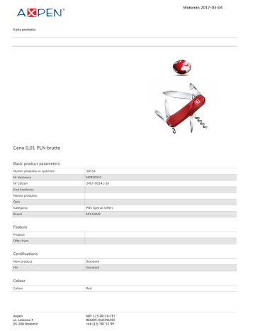Wołomin 2017-03-04 Karta produktu: Cena 0,01 PLN brutto Basic product parameters Numer produktu w systemie 30554 Nr dostawcy NPBS0341 Nr Celcen 2487-00241-26 Kod kreskowy Nazwa produktu Opis Kategoria PBS Special Offers Brand NO NAME Feature Product Offer from Certifications New product Standard Hit Standard Colour Colour Red Axpen ul. Laskowa 4 05-200 Wołomin NIP: 125-00-16-787 REGON: 010346305 +48 (22) 787 55 99 Wołomin 2017-03-04 Serdecznie zapraszamy do współpracy Axpen zespół. Axpen ul. Laskowa 4 05-200 Wołomin NIP: 125-00-16-787 REGON: 010346305 +48 (22) 787 55 99