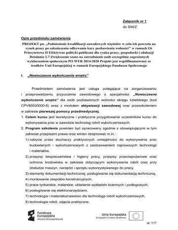 Załącznik nr 1 do SIWZ Opis przedmiotu zamówienia PROJEKT pn. ,,Podniesienie kwalifikacji zawodowych więźniów w celu ich powrotu na rynek pracy po zakończeniu odbywania kary pozbawienia wolności’’ w ramach Oś Priorytetowa II Efektywne polityki publiczne dla rynku pracy, gospodarki i edukacji Działania 2.7 Zwiększenie szans na zatrudnienie osób szczególnie zagrożonych wykluczeniem społecznym PO WER 2014-2020 Projekt jest współfinansowany ze środków Unii Europejskiej w ramach Europejskiego Funduszu Społecznego I. i „Nowoczesne wykończenie wnętrz” Przedmiotem zamówienia jest usługa przeprowadzeniu przyuczenia zawodowego polegająca o na specjalności zorganizowaniu „Nowoczesne wykończenie wnętrz” dla osób pozbawionych wolności okręgu lubelskiego (kod CPV80530000-8) wraz z modułem aktywizacji zawodowej oraz przeszkoleniem w zakresie pierwszej pomocy przedmedycznej. 1. Celem kursu jest teoretyczne i praktyczne przygotowanie uczestników kursu do wykonywania prac w zawodzie technolog robót wykończeniowych. 2. Program szkolenia powinien być opracowany zgodnie z obowiązującymi w tym zakresie przepisami prawa oraz winien obejmować m.in.: 1) nabycie przez słuchaczy praktycznych umiejętności do wykonywania prac budowlanych i wykończeniowych z zastosowaniem najnowszych technologii i materiałów, 2) przepisy bezpieczeństwa i higieny pracy, przepisy przeciwpożarowe oraz ochrona środowiska w zakresie dotyczącym wykonywania robót oraz przy obsłudze maszyn, narzędzi i sprzętu wykorzystywanego do pracy, 3) elementy dokumentacji technicznej, posługiwanie się dokumentacją techniczną, 4) montowanie zespołów konstrukcyjnych, 5) prace tynkarskie, malarskie, układanie wykładzin ściennych i podłogowych, 6) posługiwanie się elektronarzędziami, 7) technologia i materiałoznawstwo dla technologa robót wykończeniowych, 8) technologia robót, zajęcia praktyczne. str. 1/17 Moduł aktywizacja zawodowa Wykonawca zawodowej. zapewni Szkolenie przeszkolenie z zakresu osadzonych aktywizacji w zakresie zawodowej aktywizacji musi zostać przeprowadzone w okresie trwania danego kursu zawodowego. W programie szkolenia obligatoryjnie powinna znaleźć się poniższa tematyka: a) analiza mocnych i słabych stron; b) formy pośrednictwa pracy / poznanie zasad poszukiwania pracy; c) poradnictwo zawodowe (w tym informacja o zawodach, rynku pracy, możliwościach szkolenia i kształcenia, porady ułatwiające wybór, zmianę kwalifikacji, testy określające preferencje i predyspozycje zawodowe, opracowywanie własnych planów zatrudnienia); d) przygotowanie dokumentów aplikacyjnych, zasady pisania dokumentów aplikacyjnych, sposoby prowadzenia rozmów kwalifikacyjnych, przygotowywanie do autoprezentacji. Szkolenie w zakresie pierwszej pomocy przedmedycznej Wykonawca zapewni przeszkolenie osadzonych w zakresie udzielania pierwszej pomocy przedmedycznej. Szkolenie z zakresu pierwszej pomocy przedmedycznej musi zostać przeprowadzone w okresie trwania danego kursu zawodowego. W programie szkolenia obligatoryjnie powinna się znaleźć poniższa tematyka: - podtopienie, - zakrztuszenie, - krwotok oraz poważne rany, - oparzenia, - porażenie prądem, - urazy głowy i kręgosłupa, - inne urazy kostno-stawowe, - epilepsja (padaczka), - ból w klatce piersiowej, zaburzenia pracy serca, - omdlenie, - resuscytacja krążeniowo-oddechowa, - stosowanie defibrylatora zewnętrznego AED. str. 2/17 Wykonawca może poszerzyć program o inne zagadnienia, których znajomość jest niezbędna przy udzielaniu pierwszej pomocy. Kadra szkoleniowa w zakresie pierwszej pomocy przedmedycznej: Wykonawca zapewnia prowadzenie zajęć przez wykwalifikowaną kadrę, posiadającą odpowiednie wykształcenie kierunkowe oraz zobowiązuje się do przeprowadzenia szkolenia z zakresu pierwszej pomocy przedmedycznej zgodnie z zapisami rozporządzenia Ministra Pracy i Polityki Społecznej z dnia 14 maja 2014 roku w sprawie szczegółowych warunków realizacji oraz trybu i sposobów prowadzenia usług rynku pracy (Dz. U. z 2014 r. poz. 667). Wykonawca zapewnia uczestnikom szkolenia niezbędne materiały i pomoce dydaktyczne, a w szczególności zapewni dostęp osób szkolonych do między innymi: co najmniej jednego „fantomu – typu torsa reanimacyjnego BLS”, co najmniej jednego defibrylatora zewnętrznego AED, niezbędnych w celu nabycia przez osoby szkolone umiejętności praktycznych. 3. Liczba osób do przeszkolenia – 10 osób. 4. Liczba godzin szkolenia ogółem - 150 godzin dla jednego uczestnika w tym: - 30 godzin zajęcia teoretyczne, - 80 godzin zajęcia praktyczne, - 20 godzin zajęcia z modułu aktywizacji zawodowej, - 20 godzin zajęć z w zakresie pierwszej pomocy przedmedycznej. 5. Zajęcia będą prowadzane w dni powszednie od poniedziałku do soboty i w ciągu dnia nie mogą przekroczyć 8 godzin, 1 godzina zajęć trwa 45 minut. 6. Wykonawca zapewnia wszystkie materiały dydaktyczne, biurowe i piśmiennicze dla 10 osób biorących udział w szkoleniu (np.: teczki, zeszyty, długopisy, skrypty) oznakowane logotypami. 7. Wykonawca zapewni uczestnikom szkolenia odzież roboczą i ochronną zgodnie z obowiązującymi przepisami BHP, w tym m.in. rozporządzeniem Ministra Pracy i Polityki Socjalnej z dnia 26 września 1997 r. w sprawie ogólnych przepisów bezpieczeństwa i higieny pracy (Dz.U. z 2003 r., Nr169, poz. 1650 ), dostosowaną do pory roku oraz wykonywanej pracy . 8. Wykonawca na podstawie listy sporządzonej przez Zamawiającego dokona ubezpieczenia NW uczestników kursu. str. 3/17 9. Wykonawca zobowiązany jest do prowadzenia dokumentacji przebiegu szkolenia (tj. między innymi: dziennik zajęć, protokół z egzaminu, ankiety oceny szkolenia i wykładowców, listy odbioru materiałów dydaktycznych, listy obecności, listy wydanych zaświadczeń i certyfikatów o ukończeniu kursu, protokół odbioru usługi). 10. Wykonawca zapewnia materiały niezbędne do przep