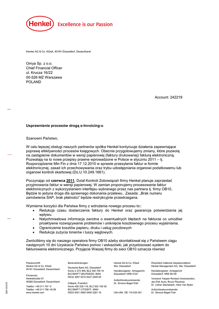 Omya Sp. z o.o. Chief Financial Officer ul. Krucza 16/22 00-526 MZ Warszawa POLAND Account: 242219 04.04.2011 FO-PTP/ +49 211-7 97 ?? ?? +49 211-7 98 ?? ?? Usprawnienie procesów drogą e-Invoicing-u Szanowni Państwo, W celu lepszej obsługi naszych partnerów spółka Henkel kontynuuje działania zapewniające poprawę efektywności procesów księgowych. Obecnie przygotowujemy zmiany, które pozwolą na zastąpienie dokumentów w wersji papierowej (faktury drukowanej) fakturą elektroniczną. Pozwalają na to nowe przepisy prawne wprowadzone w Polsce w styczniu 2011 – tj. Rozporządzenie Min Fin z dnia 17.12.2010 w sprawie przesyłania faktur w formie elektronicznej, zasad ich przechowywania oraz trybu udostępniania organowi podatkowemu lub organowi kontroli skarbowej (Dz.U.10.249.1661). Poczynając od czerwca 2011, Dział Kontroli Zobowiązań firmy Henkel planuje zaprzestać przyjmowania faktur w wersji papierowej. W zamian proponujemy procesowanie faktur elektronicznych z wykorzystaniem interfejsu wybranego przez nas partnera tj. firmy OB10, Będzie to jedyna droga dla sprawnego dokonania przelewu.. Zasada: „Brak numeru zamówienia SAP, brak płatności” będzie restrykcyjnie przestrzegana. Wymierne korzyści dla Państwa firmy z wdrożenia nowego procesu to:: Redukcja czasu dostarczenia faktury do Henkel oraz gwarancja potwierdzenia jej wpływu. Natychmiastowa informacja zwrotna o ewentualnych błędach na fakturze co umożliwi proaktywne rozwiązywanie problemów i uniknięcie kosztownego procesu wyjaśniania. Ograniczenie kosztów papieru, druku i usług pocztowych Redukcja zużycia tonerów i tuszy węglowych. Zwróciliśmy się do naszego operatora firmy OB10 ażeby skontaktował się z Państwem ciągu następnych 10 dni Uzyskacie Państwo pomoc i wskazówki, jak przystosować system do fakturowania elektronicznego. Przyjęcie Waszej firmy do sieci OB10 oznacza również Seite 2 / 5 możliwość wysyłania faktur elektronicznych do Państwa odbiorców-innych niż Henkel, którzy już korzystają z takiej usługi. Pozwoli to na poprawę efektywności procedur w Państwa firmie. W załączonej informacji znajdziecie Państwo opcje rozwiązań oraz koszty obsługi OB10. Strona www.OB10.com/Henkel dostarczy dalszych informacji o sieci i o zaletach tego rozwiązania dla Państwa organizacji.. Wszystkie aspekty współpracy zostaną również wyjaśnione, kiedy OB10 skontaktuje się z Państwem. Poprosiliśmy OB10 aby nas informowało o postępie prowadzonej akcji rejestracyjnej. Program fakturowania elektronicznego Henkel OB10 w Europie i Ameryce Północnej już sprawnie funkcjonuje i oczekujemy na Państwa faktury w tym systemie nie później niż 1go czerwca 2011 r Dotrzymanie wyżej wymienionego terminu będzie możliwe tylko wtedy gdy zarejestrujecie Państwa firmę w OB10 przed 29 kwietnia 2011. Z góry dziękujemy za poparcie tej ważnej inicjatywy. Ażeby skontaktować się z OB10, wystarczy wysłać e-mail do [email protected]. Zapytania do Henkel prosimy kierować bezpośrednio na adres [email protected]. Z poważaniem, Henkel AG & Co. KGaA Bertrand Conquéret Corporate Senior Vice President Purchasing Dr. Joachim Jaeckle Corporate Senior Vice President Financial Operations Seite 3 / 5 Frequently Asked Questions What are my benefits from using OB10? Secure and guaranteed invoice delivery, no more invoices getting lost in the post It will take us less time to process your invoices and therefore we will be able to pay you on time No more delays due to missing information, landing on the wrong desk or manual intervention. We will enforce the “No Order, No Payment” policy ANY-TO-ANY DATA FORMATTING Technology - there is no need for additional software or hardware VAT compliance, regardless of where invoices are sent from or received Easy and cost efficient to send invoices - at any time Why should I use OB10 to send my invoices? Shortly, this will be the only way that Henkel in Europe and North America will accept delivery of supplier invoices. Is invoicing via OB10 a requirement for doing business with Henkel in Europe and North America? Yes. As from June 2011, Henkel cannot guarantee on time payment if paper invoices continue to be sent by suppliers. We also do business with Henkel outside Europe and North America. Does this apply to Henkel globally? No. The e-Invoicing program is currently only for invoices managed by the Henkel Accounts Payables in EUROPE AND NORTH AMERICA. Will electronic invoicing be a requirement for new tenders and new suppliers? Yes. Electronic invoicing via OB10 will be included in the evaluation process for new suppliers and tenders. Will electronic invoicing substitute self-invoicing agreements? No. If self-invoicing is agreed with Henkel there is no need to implement electronic invoicing Will I need to use this service if my account is currently paid on time? Yes. Your use of the OB10 service will ensure we continue to pay you on time. What happens if I still send paper invoices? While you are working with OB10 to complete your registration we will be happy to continue to receive your paper invoices. We have set a deadline of July 2011 for suppliers to transition to the network. Once you are sending invoices via the OB10 network please ensure you cease sending paper copies. Can I still send paper invoices to the regular invoice address? Seite 4 / 5 No, sending paper invoices will either be rejected or result in delays in invoice processing. What reference do I need to put on paper and e-Invoices? Please ensure you provide the Henkel Purchase Order Number and line item on your invoice. This will allow us to obtain fast internal approval of your invoices, which will result in quick payment. Invoices without a Henkel Purchase Order will be rejected Are there fees associated with this service? If you choose the Integrated Solution, there is an annual membership fee plus a transaction fee. Please see the enclosed Options document for curre