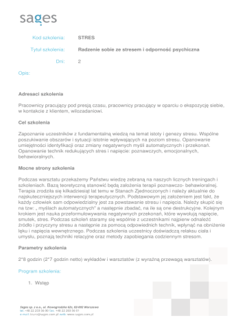 Kod szkolenia: Tytuł szkolenia: Dni: STRES Radzenie sobie ze stresem i odporność psychiczna 2 Opis: Adresaci szkolenia Pracownicy pracujący pod presją czasu, pracownicy pracujący w oparciu o ekspozycję siebie, w kontakcie z klientem, wilozadaniowi. Cel szkolenia Zapoznanie uczestników z fundamentalną wiedzą na temat istoty i genezy stresu. Wspólne poszukiwanie obszarów i sytuacji istotnie wpływających na poziom stresu. Opanowanie umiejętności identyfikacji oraz zmiany negatywnych myśli automatycznych i przekonań. Opanowanie technik redukujących stres i napięcie: poznawczych, emocjonalnych, behawioralnych. Mocne strony szkolenia Podczas warsztatu przekażemy Państwu wiedzę zebraną na naszych licznych treningach i szkoleniach. Bazą teoretyczną stanowić będą założenia terapii poznawczo- behawioralnej. Terapia zrodziła się kilkadziesiąt lat temu w Stanach Zjednoczonych i należy aktualnie do najskuteczniejszych interwencji terapeutycznych. Podstawowym jej założeniem jest fakt, że każdy człowiek sam odpowiedzialny jest za powstawanie stresu i napięcia. Należy skupić się na tzw: „ myślach automatycznych" a następnie zbadać, na ile są one destrukcyjne. Kolejnym krokiem jest nauka przeformułowywania negatywnych przekonań, które wywołują napięcie, smutek, stres. Podczas szkoleń staramy się wspólnie z uczestnikami najpierw odnaleźć źródło i przyczyny stresu a następnie za pomocą odpowiednich technik, wpłynąć na obniżenie lęku i napięcia wewnętrznego. Podczas szkolenia uczestnicy doświadczą relaksu ciała i umysłu, poznają techniki relacyjne oraz metody zapobiegania codziennym stresom. Parametry szkolenia 2*8 godzin (2*7 godzin netto) wykładów i warsztatów (z wyraźną przewagą warsztatów). Program szkolenia: 1. Wstęp Co to jest stres ? Funkcje stresu Obiegowa opinia o stresie Geneza stresu 2. Fazy stresu wg.Sely’ego Alarmowa Mobilizacji Przystosowania Wyczerpania 3. Transakcyjna teoria stresu R.S.Lazarusa i S. Folkmana Strategie :krzywdy, zagrożenia , wyzwania Transakcje: sprzyjająco –pozytywna, stresująca Model stresu GAS Lazarusa 4. Model behawioralno-poznawczy stresu Sytuacja Myśl Emocje Fizjologia Zachowanie 5. Autodiagnoza świadomości i własnego przeżywania stresu Praca z krytykiem wewnętrznym Test –poznanie przyczyn stresu związanego z pracą Test- Sprawdź, jak odpoczywasz 6. Poznawcze sposoby radzenia sobie ze stresem Osobisty wpływ na sytuacje wywołujące stres Pozytywne myślenie Pewność , a świadomość siebie 7. Praca z ciałem w kierunku neutralizacji stresu Pogłębianie świadomości własnego ciała Lokalizowanie miejsc kumulujących stres w naszym ciele Praca z naszymi zmysłami Praca z wykorzystaniem przezywanych emocji metodami teatralnymi 8. Doświadczanie relaksu Wizualizacje Progresywna relaksacja mięśni E. Jacobsona Trening autogenny J. H. Schulza Powered by TCPDF (www.tcpdf.org)