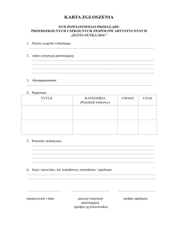 KARTA ZGŁOSZENIA XVII POWIATOWEGO PRZEGLĄDU PRZEDSZKOLNYCH I SZKOLNYCH ZESPOŁÓW ARTYSTYCZNYCH „ZŁOTA NUTKA 2016 ” 1. Nazwa zespołu wokalnego: …………………………………………………………………………………………… 2. Adres instytucji patronującej: ………………………………………………………………………………………… ………………………………………………………………………………………… ………………………………………………………………………………………… ………………………………………………………………………………………… 3. Akompaniament: ……………………………………………………………………………………………. 4. Repertuar: TYTUŁ KATEGORIA (Przedział wiekowy) UWAGI CZAS 5. Potrzeby techniczne: ………………………………………………………………………………………… ………………………………………………………………………………………… ………………………………………………………………………………………… ………………………………………………………………………………………… ………………………………………………………………………………………… 6. Imię i nazwisko, tel. kontaktowy instruktora / opiekuna: ……………………………………………………………………………………………… ……………………………………………………………………………………………… ……………………….. miejscowość i data ………………………….. pieczęć instytucji patronującej (podpis jej kierownika) ………………………….. podpis opiekuna