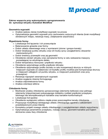 Zakres wsparcia przy wykorzystaniu oprogramowania do symulacji wtrysku Autodesk Moldflow Geometria wypraski • Analiza wpływu danej modyfikacji wypraski na proces • Optymalizacja geometrii wypraski przy zachowaniu wytycznych klienta (brak modyfikacji określonych miejsc, redukcja masy, zwiększenie sztywności) Wypełnianie formy • Lokalizacja linii łączenia i ich przesunięcie • Balansowanie gniazda oraz formy • Dobór układu wlewowego wraz z wymiarami (zimne i gorące kanały) • Dobór lokalizacji punktu wtrysku oraz ich liczby (przy uwzględnieniu obszarów niedozwolonych) • Dobór średnicy przewężki oraz jej geometrii • Określenie ciśnień wtrysku oraz zamykania formy w celu wskazania maszyny pozwalającej na wtryśnięcie detalu • Dobór temperatury tworzywa i prędkości wtrysku • Określenie optymalnego profilu prędkości ślimaka • Określenie optymalnego profilu docisku w celu kompensacji skurczu w różnych miejscach wypraski (w zależności od kształtu profilu możliwa jest kompensacja skurczy w miejscach odległych od punktu wtrysku, w miejscach pośrednich oraz przy przewężce) • Redukcja naprężeń wewnętrznych wypraski • Analiza wygięcia rdzenia formującego • Analiza odpowietrzenia formy • Analiza orientacji włókna Chłodzenie formy • Możliwość analizy chłodzenia uproszczonego (elementy belkowe) oraz pełnego (elementy trójwymiarowe) pokazującego dokładny rozkład prędkości przepływu, istotnego dla skomplikowanych kanałów oraz kanałów konformalnych • Lokalizacja hot-spotów • Określenie wydajności odbioru ciepła przez poszczególne kanały chłodzenia • Propozycja modyfikacji istniejącego układu chłodzącego zgodnie z założeniami przedstawionymi przez klienta • Kompletny projekt nowego układu chłodzącego z uwzględnieniem układu wypychaczy • Optymalizacja parametrów przepływu, rodzaju cieczy, geometrii kanałów pod kątem skrócenia czasu fazy chłodzenia Rozwiązywanie problemów • Dobór odpowiedniego tworzywa do wypraski (z dostępnego zakresu, zgodnie z wymaganiami klienta) • Analiza wypaczeń wypraski i korekta ich korekta za pomocą: o Zmiany profilu docisku o Zmiany lokalizacji punktu wtrysku o Zmiany układu chłodzącego o Zmiany geometrii wypraski o Poprzez wykorzystanie technik projektowania eksperymentu (Design of Experiment) • Analiza zapadnięć wraz ze wskazaniem przyczyn • Analiza problemów z niezbalansowaniem przepływu przy geometrycznie zbalansowanych formach • Analiza przepaleń oraz jettingu (związanych z dużymi szybkościami ścinania oraz naprężeniami ścinającymi) • Analiza niskiej wytrzymałości wyprasek (związanych z dużymi naprężeniami wewnętrznymi) • Zwiększenie sztywności przez odpowiednie ułożenie włókien w wyprasce • Rozwiązywanie problemu pułapek powietrznych • Rozwiązywanie problemów z niedolewaniem Analizy zaawansowane • Badanie stabilności procesu oraz wskazanie głównych źródeł niestabilności • Zaawansowana optymalizacja procesu • Analizy wytrzymałościowe z uwzględnieniem właściwości powtryskowych wyprasek • Analiza grzania gorących kanałów • Wykorzystanie planowania eksperymentu do rozwiązywania złożonych problemów • Techniki specjalne o Wtryskiwanie z gazem o Otryskiwanie wkładek (również wkładek z tworzywa) o Wtrysk dwu- i wielokomponentowy z formą obrotową o Wtrysk sekwencyjny o Wtrysk kaskadowy o Wtrysk dwu- i wielokomponentowy typu sandwich (różne tworzywa na zewnętrz i w rdzeniu) o Spienianie fizyczne i chemiczne tworzywa o Analiza technologii RTC o Grzanie indukcyjne formy o Wtryskiwanie z doprasowaniem o Prasowanie tworzyw o Techniki dedykowane dla tworzyw termoutwardzalnych oraz gum i silikonów o Etykietowanie w formie • Analiza krystalizacji tworzywa • Analiza właściwości optycznych