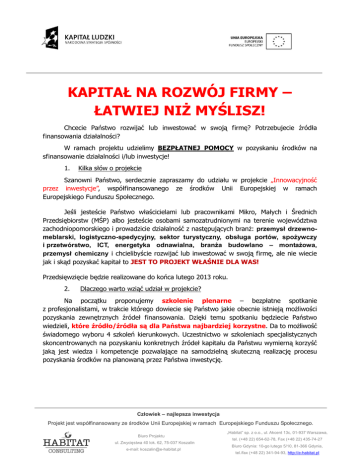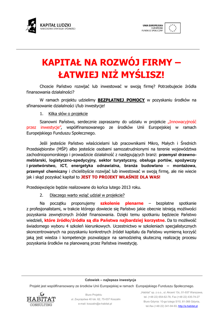 KAPITAŁ NA ROZWÓJ FIRMY – ŁATWIEJ NIŻ MYŚLISZ! Chcecie Państwo rozwijać lub inwestować w swoją firmę? Potrzebujecie źródła finansowania działalności? W ramach projektu udzielimy BEZPŁATNEJ POMOCY w pozyskaniu środków na sfinansowanie działalności i/lub inwestycje! 1. Kilka słów o projekcie Szanowni Państwo, serdecznie zapraszamy do udziału w projekcie „Innowacyjność przez inwestycje”, współfinansowanego ze środków Unii Europejskiej w ramach Europejskiego Funduszu Społecznego. Jeśli jesteście Państwo właścicielami lub pracownikami Mikro, Małych i Średnich Przedsiębiorstw (MŚP) albo jesteście osobami samozatrudnionymi na terenie województwa zachodniopomorskiego i prowadzicie działalność z następujących branż: przemysł drzewnomeblarski, logistyczno-spedycyjny, sektor turystyczny, obsługa portów, spożywczy i przetwórstwo, ICT, energetyka odnawialna, branża budowlano – montażowa, przemysł chemiczny i chcielibyście rozwijać lub inwestować w swoją firmę, ale nie wiecie jak i skąd pozyskać kapitał to JEST TO PROJEKT WŁAŚNIE DLA WAS! Przedsięwzięcie będzie realizowane do końca lutego 2013 roku. 2. Dlaczego warto wziąć udział w projekcie? Na początku proponujemy szkolenie plenarne – bezpłatne spotkanie z profesjonalistami, w trakcie którego dowiecie się Państwo jakie obecnie istnieją możliwości pozyskania zewnętrznych źródeł finansowania. Dzięki temu spotkaniu będziecie Państwo wiedzieli, które źródło/źródła są dla Państwa najbardziej korzystne. Da to możliwość świadomego wyboru 4 szkoleń kierunkowych. Uczestnictwo w szkoleniach specjalistycznych skoncentrowanych na pozyskaniu konkretnych źródeł kapitału da Państwu wymierną korzyść jaką jest wiedza i kompetencje pozwalające na samodzielną skuteczną realizację procesu pozyskania środków na planowaną przez Państwa inwestycję. Człowiek – najlepsza inwestycja Projekt jest współfinansowany ze środków Unii Europejskiej w ramach Europejskiego Funduszu Społecznego. Biuro Projektu ul. Zwycięstwa 40 lok. 62, 75-037 Koszalin e-mail: [email protected] „Habitat” sp. z o.o., ul. Akcent 13c, 01-937 Warszawa, tel. (+48 22) 654-62-78, Fax (+48 22) 435-74-27 Biuro Gdynia: 10-go lutego 5/10, 81-366 Gdynia, tel./fax (+48 22) 341-94-93, http://e-habitat.pl 3. Co oferujemy? W ramach projektu oferujemy szkolenie plenarne wprowadzające w tematykę i stanowiące ogólny przegląd możliwych źródeł finansowania działalności/inwestycji oraz 10 tematów w ramach szkoleń kierunkowych do wyboru: Źródła i sposoby pozyskiwania środków unijnych na projekty inwestycyjne dla MŚP Pozyskiwanie funduszy unijnych na programy rozwoju kadr przedsiębiorstw Zasady realizacji/rozliczeń projektów współfinansowanych ze środków EFRR/EFS Tworzenie biznes planów/studium wykonalności z uwzględnieniem specyfiki projektów unijnych Venture Capital, Fundusze Poręczeniowe i Pożyczkowe jako źródła pozyskiwania funduszy Pozadotacyjne źródła finansowania rozwoju działalności MŚP (kredyty i leasing) Emisja akcji, wejście na New Connect jako alternatywne metody pozyskiwania kapitału Pomoc publiczna Finansowe instrumenty wsparcia eksportu Zarządzanie projektem inwestycyjnym – podstawy Zarządzanie projektem inwestycyjnym – szkolenie rozszerzone Szkolenia prowadzone będą przez doświadczonych trenerów, będących ekspertami w danej dziedzinie. Na każdym szkoleniu otrzymacie Państwo komplet materiałów. W trakcie szkolenia plenarnego przewidziano także lunch oraz przerwy kawowe w trakcie których będziecie mieli Państwo okazję nawiązać kontakty biznesowe z pozostałymi uczestnikami projektu. Na szkoleniach kierunkowych uczestnikom zostaną zapewnione gorące napoje oraz słodki poczęstunek. 4. Jakie są koszty? Udział w projekcie jest całkowicie bezpłatny. 5. Kontakt Ada Stajewska – Kierownik Projektu: e-mail: [email protected] tel. 58 3419493; 604 374 040 Izabela Kwarcińska – Specjalista ds. organizacji szkoleń, Biuro Projektu e-mail: [email protected] tel.: 602 449 904 Strony Internetowe projektu: www.innowacjeprzezinwestycje.pl www.innowacje-przez-inwestycje.pl Człowiek – najlepsza inwestycja Projekt jest współfinansowany ze środków Unii Europejskiej w ramach Europejskiego Funduszu Społecznego. Biuro Projektu ul. Zwycięstwa 40 lok. 62, 75-037 Koszalin e-mail: [email protected] „Habitat” sp. z o.o., ul. Akcent 13c, 01-937 Warszawa, tel. (+48 22) 654-62-78, Fax (+48 22) 435-74-27 Biuro Gdynia: 10-go lutego 5/10, 81-366 Gdynia, tel./fax (+48 22) 341-94-93, http://e-habitat.pl