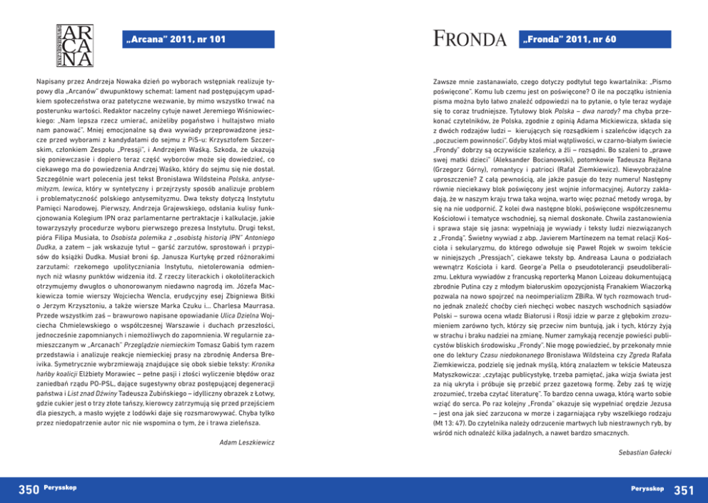 „Arcana” 2011, nr 101 Napisany przez Andrzeja Nowaka dzień po wyborach wstępniak realizuje typowy dla „Arcanów” dwupunktowy schemat: lament nad postępującym upadkiem społeczeństwa oraz patetyczne wezwanie, by mimo wszystko trwać na posterunku wartości. Redaktor naczelny cytuje nawet Jeremiego Wiśniowieckiego: „Nam lepsza rzecz umierać, aniżeliby pogaństwo i hultajstwo miało nam panować”. Mniej emocjonalne są dwa wywiady przeprowadzone jeszcze przed wyborami z kandydatami do sejmu z PiS-u: Krzysztofem Szczerskim, członkiem Zespołu „Pressji”, i Andrzejem Waśką. Szkoda, że ukazują się poniewczasie i dopiero teraz część wyborców może się dowiedzieć, co ciekawego ma do powiedzenia Andrzej Waśko, który do sejmu się nie dostał. Szczególnie wart polecenia jest tekst Bronisława Wildsteina Polska, antysemityzm, lewica, który w syntetyczny i przejrzysty sposób analizuje problem i problematyczność polskiego antysemityzmu. Dwa teksty dotyczą Instytutu Pamięci Narodowej. Pierwszy, Andrzeja Grajewskiego, odsłania kulisy funkcjonowania Kolegium IPN oraz parlamentarne pertraktacje i kalkulacje, jakie towarzyszyły procedurze wyboru pierwszego prezesa Instytutu. Drugi tekst, pióra Filipa Musiała, to Osobista polemika z „osobistą historią IPN” Antoniego Dudka, a zatem – jak wskazuje tytuł – garść zarzutów, sprostowań i przypisów do książki Dudka. Musiał broni śp. Janusza Kurtykę przed różnorakimi zarzutami: rzekomego upolityczniania Instytutu, nietolerowania odmiennych niż własny punktów widzenia itd. Z rzeczy literackich i okołoliterackich otrzymujemy dwugłos o uhonorowanym niedawno nagrodą im. Józefa Mackiewicza tomie wierszy Wojciecha Wencla, erudycyjny esej Zbigniewa Bitki o Jerzym Krzysztoniu, a także wiersze Marka Czuku i… Charlesa Maurrasa. Przede wszystkim zaś – brawurowo napisane opowiadanie Ulica Dzielna Wojciecha Chmielewskiego o współczesnej Warszawie i duchach przeszłości, jednocześnie zapomnianych i niemożliwych do zapomnienia. W regularnie zamieszczanym w „Arcanach” Przeglądzie niemieckim Tomasz Gabiś tym razem przedstawia i analizuje reakcje niemieckiej prasy na zbrodnię Andersa Breivika. Symetrycznie wybrzmiewają znajdujące się obok siebie teksty: Kronika hańby koalicji Elżbiety Morawiec – pełne pasji i złości wyliczenie błędów oraz zaniedbań rządu PO-PSL, dające sugestywny obraz postępującej degeneracji państwa i List znad Dźwiny Tadeusza Zubińskiego – idylliczny obrazek z Łotwy, gdzie cukier jest o trzy złote tańszy, kierowcy zatrzymują się przed przejściem dla pieszych, a masło wyjęte z lodówki daje się rozsmarowywać. Chyba tylko przez niedopatrzenie autor nic nie wspomina o tym, że i trawa zieleńsza. „Fronda” 2011, nr 60 Zawsze mnie zastanawiało, czego dotyczy podtytuł tego kwartalnika: „Pismo poświęcone”. Komu lub czemu jest on poświęcone? O ile na początku istnienia pisma można było łatwo znaleźć odpowiedzi na to pytanie, o tyle teraz wydaje się to coraz trudniejsze. Tytułowy blok Polska – dwa narody? ma chyba przekonać czytelników, że Polska, zgodnie z opinią Adama Mickiewicza, składa się z dwóch rodzajów ludzi – kierujących się rozsądkiem i szaleńców idących za „poczuciem powinności”. Gdyby ktoś miał wątpliwości, w czarno-białym świecie „Frondy” dobrzy są oczywiście szaleńcy, a źli – rozsądni. Bo szaleni to „prawe swej matki dzieci” (Aleksander Bocianowski), potomkowie Tadeusza Rejtana (Grzegorz Górny), romantycy i patrioci (Rafał Ziemkiewicz). Niewyobrażalne uproszczenie? Z całą pewnością, ale jakże pasuje do tezy numeru! Następny równie nieciekawy blok poświęcony jest wojnie informacyjnej. Autorzy zakładają, że w naszym kraju trwa taka wojna, warto więc poznać metody wroga, by się na nie uodpornić. Z kolei dwa następne bloki, poświęcone współczesnemu Kościołowi i tematyce wschodniej, są niemal doskonałe. Chwila zastanowienia i sprawa staje się jasna: wypełniają je wywiady i teksty ludzi niezwiązanych z „Frondą”. Świetny wywiad z abp. Javierem Martínezem na temat relacji Kościoła i sekularyzmu, do którego odwołuje się Paweł Rojek w swoim tekście w niniejszych „Pressjach”, ciekawe teksty bp. Andreasa Launa o podziałach wewnątrz Kościoła i kard. George’a Pella o pseudotolerancji pseudoliberalizmu. Lektura wywiadów z francuską reporterką Manon Loizeau dokumentującą zbrodnie Putina czy z młodym białoruskim opozycjonistą Franakiem Wiaczorką pozwala na nowo spojrzeć na neoimperializm ZBiRa. W tych rozmowach trudno jednak znaleźć choćby cień niechęci wobec naszych wschodnich sąsiadów Polski – surowa ocena władz Białorusi i Rosji idzie w parze z głębokim zrozumieniem zarówno tych, którzy się przeciw nim buntują, jak i tych, którzy żyją w strachu i braku nadziei na zmianę. Numer zamykają recenzje powieści publicystów bliskich środowisku „Frondy”. Nie mogę powiedzieć, by przekonały mnie one do lektury Czasu niedokonanego Bronisława Wildsteina czy Zgreda Rafała Ziemkiewicza, podzielę się jednak myślą, którą znalazłem w tekście Mateusza Matyszkowicza: „czytając publicystykę, trzeba pamiętać, jaka wizja świata jest za nią ukryta i próbuje się przebić przez gazetową formę. Żeby zaś tę wizję zrozumieć, trzeba czytać literaturę”. To bardzo cenna uwaga, którą warto sobie wziąć do serca. Po raz kolejny „Fronda” okazuje się wypełniać orędzie Jezusa – jest ona jak sieć zarzucona w morze i zagarniająca ryby wszelkiego rodzaju (Mt 13: 47). Do czytelnika należy odrzucenie martwych lub niestrawnych ryb, by wśród nich odnaleźć kilka jadalnych, a nawet bardzo smacznych. Adam Leszkiewicz Sebastian Gałecki 350 Perysskop Perysskop 351