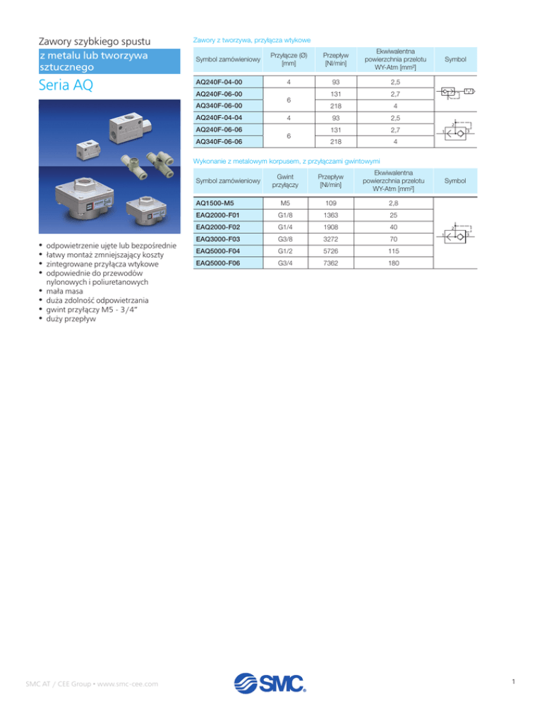 Zawory szybkiego spustu z metalu lub tworzywa sztucznego Seria AQ Zawory z tworzywa, przyłącza wtykowe Symbol zamówieniowy AQ240F-04-00 AQ240F-06-00 AQ340F-06-00 AQ240F-04-04 AQ240F-06-06 AQ340F-06-06 Przyłącze (Ø) [mm] 4 6 4 6 Przepływ [Nl/min] Ekwiwalentna powierzchnia przelotu WY-Atm [mm²] 93 2,5 131 2,7 218 4 93 2,5 131 2,7 218 4 Symbol 2 3 1 Wykonanie z metalowym korpusem, z przyłączami gwintowymi Gwint przyłączy Przepływ [Nl/min] Ekwiwalentna powierzchnia przelotu WY-Atm [mm²] M5 109 2,8 EAQ2000-F01 G1/8 1363 25 EAQ2000-F02 G1/4 1908 40 EAQ3000-F03 G3/8 3272 70 EAQ5000-F04 G1/2 5726 115 EAQ5000-F06 G3/4 7362 180 Symbol zamówieniowy AQ1500-M5 • odpowietrzenie ujęte lub bezpośrednie • łatwy montaż zmniejszający koszty • zintegrowane przyłącza wtykowe • odpowiednie do przewodów Symbol 2 1 3 nylonowych i poliuretanowych • mała masa • duża zdolność odpowietrzania • gwint przyłączy M5 - 3/4” • duży przepływ SMC AT / CEE Group • www.smc-cee.com 1