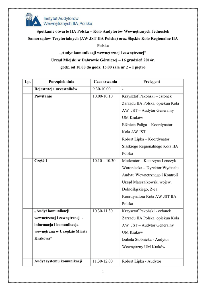 Spotkanie otwarte IIA Polska – Koło Audytorów Wewnętrznych Jednostek Samorządów Terytorialnych (AW JST IIA Polska) oraz Śląskie Koło Regionalne IIA Polska ,,Audyt komunikacji wewnętrznej i zewnętrznej” Urząd Miejski w Dąbrowie Górniczej – 16 grudzień 2014r. godz. od 10.00 do godz. 15.00 sala nr 2 – I piętro Porządek dnia Lp. Czas trwania Prelegent Rejestracja uczestników 9.30-10.00 - Powitanie 10.00-10.10 Krzysztof Pakoński – członek Zarządu IIA Polska, opiekun Koła AW JST – Audytor Generalny UM Kraków Elżbieta Paliga – Koordynator Koła AW JST Robert Lipka – Koordynator Śląskiego Regionalnego Koła IIA Polska Część I 10.10 – 10.30 Moderator – Katarzyna Lenczyk Woroniecka – Dyrektor Wydziału Audytu Wewnętrznego i Kontroli Urząd Marszałkowski wojew. Dolnośląskiego, Z-ca Koordynatora Koła AW JST IIA Polska „Audyt komunikacji 10.30-11.30 Krzysztof Pakoński - członek wewnętrznej i zewnętrznej - Zarządu IIA Polska, opiekun Koła informacja i komunikacja AW JST – Audytor Generalny wewnętrzna w Urzędzie Miasta UM Kraków Krakowa” Izabela Stobnicka - Audytor Wewnętrzny UM Kraków Audyt systemu komunikacji 11.30-12.00 1 Robert Lipka - Audytor wewnętrznej i zewnętrznej Wewnętrzny Urząd Marszałkowski przy zastosowaniu badania wojew. Śląskiego, Koordynator ankietowego” Śląskiego Koła Regionalnego IIA Polska Komunikacja w audycie - 12.00-12.30 Elżbieta Paliga – Kierownik Biura audytu Wewnętrznego UM wybrane metody i techniki Dąbrowa Górnicza, Koordynator Koła AW JST IIA Polska Przerwa 12.30-13.00 Część II Moderator – Robert Lipka – Audytor Wewnętrzny – Urząd Marszałkowski wojew. Śląskiego – Koordynator Śląskiego Koła Regionalnego IIA Polska „Audyt komunikacji 13.00-13.30 Katarzyna Lenczyk – Woroniecka wewnętrznej i zewnętrznej - Dyrektor Wydziału Audytu prowadzenie stron Wewnętrznego i Kontroli Urząd internetowych i domen Marszałkowski wojew. jednostki” Dolnośląskiego, Z-ca Koordynatora Koła AW JST IIA Polska Audyt Komunikacji 13.30-14.00 Wewnętrzny - UM Libiąż wewnętrznej i zewnętrznej Podsumowanie - pytania Joanna Czarnota – Audytor 14.30 – 15.00 Krzysztof Pakoński - członek Zarządu IIA Polska, opiekun Koła AW JST – Audytor Generalny UM Kraków. Uczestnik spotkania otrzyma 5 godzin CPE. 2