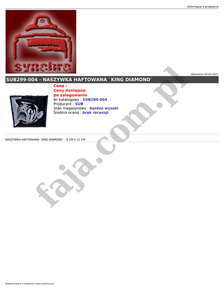 Informacje o produkcie Utworzono 04-03-2017 Cena : Ceny dostępne po zalogowaniu fa ja .c o m Nr katalogowy : SUB299-004 Producent : SUB Stan magazynowy : bardzo wysoki Średnia ocena : brak recenzji .p l SUB299-004 - NASZYWKA HAFTOWANA `KING DIAMOND` NASZYWKA HAFTOWANA `KING DIAMOND` - 9 CM X 11 CM Wygenerowano w programie www.oscGold.com