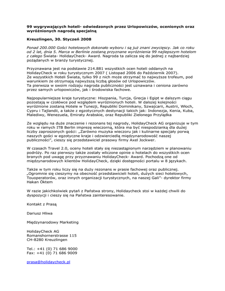 99 wygrywających hoteli- odwiedzonych przez Urlopowiczów, ocenionych oraz wyróŜnionych nagrodą specjalną Kreuzlingen, 30. Styczeń 2008 Ponad 200.000 Gości hotelowych dokonało wyboru i są juŜ znani zwycięscy. Jak co roku od 2 lat, dnia 5. Marca w Berlinie zostaną przyznane wyróŜnienia 99 najlepszym hotelom z całego Świata- HolidayCheck- Award. Nagroda ta zalicza się do jednej z najbardziej poŜądanych w branŜy turystycznej. Przyznawana jest na podstawie 214.881 wszystkich ocen hoteli oddanych na HolidayCheck w roku turystycznym 2007 ( Listopad 2006 do Październik 2007). Ze wszystkich Hoteli Świata, tylko 99 z nich moŜe otrzymać to najwyŜsze trofeum, pod warunkiem Ŝe otrzymają najwyŜszą liczbą głosów od Urlopowiczów. Ta pierwsza w swoim rodzaju nagroda publiczności jest uznawana i ceniona zarówno przez samych urlopowiczów, jak i środowiska fachowe. Najpopularniejsze kraje turystyczne: Hiszpania, Turcja, Grecja i Egipt w dalszym ciągu pozostają w czołówce pod względem wyróŜnionych hoteli. W dalszej kolejności wyróŜnione zostaną Hotele w Tunezji, Republiki Dominikany, Szwajcarii, Austrii, Włoch, Cypru i Tajlandii, a takŜe z egzotycznych destynacji takich jak: Indonezja, Kenia, Kuba, Malediwy, Wenezuela, Emiraty Arabskie, oraz Republiki Zielonego Przylądka Ze względu na duŜe znaczenie i rezonans tej nagrody, HolidayCheck AG organizuje w tym roku w ramych ITB Berlin imprezę wieczorną, która ma być niespodzianką dla duŜej liczby zaproszonych gości: „Zarówno muzyka wieczoru jak i kulinarne specjały porwą naszych gości w egzotyczne kraje i odzwierciedlą międzynarodowość naszej publiczności”, cieszy się przedstawiciel prasowy firmy Axel Jockwer. W czasach Travel 2.0, oceny hoteli stały się niezastąpionym narzędziem w planowaniu podróŜy. Po raz pierwszy takŜe zostały wliczone opinie o hotelach do wszystkich ocen branych pod uwagę przy przyznawaniu HolidayCheck- Award. Pochodzą one od międzynarodowych klientów HolidayCheck, dzięki dostępności portalu w 8 językach. TakŜe w tym roku liczy się na duŜy rezonans w prasie fachowej oraz publicznej. „Ogromnie się cieszymy na obecność przedstawicieli hoteli, duŜych sieci hotelowych, Touoperatorów, oraz innych organizacji turystycznych, na naszej Gali”- dyrektor firmy Hakan Öktem W razie jakichkolwiek pytań z Państwa strony, Holidaycheck stoi w kaŜdej chwili do dyspozycji i cieszy się na Państwa zainteresowanie. Kontakt z Prasą Dariusz Hliwa Międzynarodowy Marketing HolidayCheck AG Romanshornerstrasse 115 CH-8280 Kreuzlingen Tel.: +41 (0) 71 686 9000 Fax: +41 (0) 71 686 9009 [email protected]
