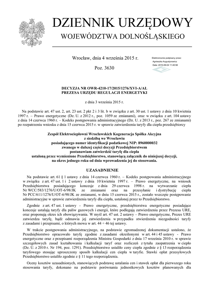 DZIENNIK URZĘDOWY WOJEWÓDZTWA DOLNOŚLĄSKIEGO Wrocław, dnia 4 września 2015 r. Elektronicznie podpisany przez: Agnieszka Augustynowicz Poz. 3630 Data: 2015-09-04 11:40:58 DECYZJA NR OWR-4210-17/2015/1276/XVI-A/AŁ PREZESA URZĘDU REGULACJI ENERGETYKI z dnia 3 września 2015 r. Na podstawie art. 47 ust. 2, art. 23 ust. 2 pkt 2 i 3 lit. b w związku z art. 30 ust. 1 ustawy z dnia 10 kwietnia 1997 r. – Prawo energetyczne (Dz. U. z 2012 r., poz. 1059 ze zmianami), oraz w związku z art. 104 ustawy z dnia 14 czerwca 1960 r. – Kodeks postępowania administracyjnego (Dz. U. z 2013 r., poz. 267 ze zmianami) po rozpatrzeniu wniosku z dnia 15 czerwca 2015 r. w sprawie zatwierdzenia taryfy dla ciepła przedsiębiorcy Zespół Elektrociepłowni Wrocławskich Kogeneracja Spółka Akcyjna z siedzibą we Wrocławiu posiadającego numer identyfikacji podatkowej NIP: 8960000032 zwanego w dalszej części decyzji Przedsiębiorstwem postanawiam zatwierdzić taryfę dla ciepła ustaloną przez wymienione Przedsiębiorstwo, stanowiącą załącznik do niniejszej decyzji, na okres jednego roku od dnia wprowadzenia jej do stosowania. UZASADNIENIE Na podstawie art. 61 § 1 ustawy z dnia 14 czerwca 1960 r. – Kodeks postępowania administracyjnego w związku z art. 47 ust. 1 i 2 ustawy z dnia 10 kwietnia 1997 r. – Prawo energetyczne, na wniosek Przedsiębiorstwa posiadającego koncesje z dnia 29 czerwca 1998 r. na wytwarzanie ciepła Nr WCC/583/1276/U/OT-6/98/JK ze zmianami oraz na przesyłanie i dystrybucję ciepła Nr PCC/611/1276/U/OT-6/98/JK ze zmianami, w dniu 15 czerwca 2015 r., zostało wszczęte postępowanie administracyjne w sprawie zatwierdzenia taryfy dla ciepła, ustalonej przez to Przedsiębiorstwo. Zgodnie z art. 47 ust. 1 ustawy - Prawo energetyczne, przedsiębiorstwa energetyczne posiadające koncesje ustalają taryfy dla paliw gazowych i energii, które podlegają zatwierdzeniu przez Prezesa URE, oraz proponują okres ich obowiązywania. W myśl art. 47 ust. 2 ustawy – Prawo energetyczne, Prezes URE zatwierdza taryfę, bądź odmawia jej zatwierdzenia w przypadku stwierdzenia niezgodności taryfy z zasadami i przepisami, o których mowa w art. 44 ÷ 46 tej ustawy. W trakcie postępowania administracyjnego, na podstawie zgromadzonej dokumentacji ustalono, że Przedsiębiorstwo opracowało taryfę zgodnie z zasadami określonymi w art. 44 i 45 ustawy - Prawo energetyczne oraz z przepisami rozporządzenia Ministra Gospodarki z dnia 17 września 2010 r. w sprawie szczegółowych zasad kształtowania i kalkulacji taryf oraz rozliczeń z tytułu zaopatrzenia w ciepło (Dz. U. z 2010 r. Nr 194, poz. 1291). Przedsiębiorstwo ustaliło ceny ciepła zgodnie z § 13 rozporządzenia taryfowego stosując uproszczony sposób kalkulacji cen ciepła w taryfie. Stawki opłat przesyłowych Przedsiębiorstwo ustaliło zgodnie z § 11 tego rozporządzenia. Oceny kosztów uzasadnionych, stanowiących podstawę ustalania cen i stawek opłat dla pierwszego roku stosowania taryfy, dokonano na podstawie porównania jednostkowych kosztów planowanych dla Dziennik Urzędowy Województwa Dolnośląskiego –2– Poz. 3630 _______________________________________________________________________________________________________________ pierwszego roku stosowania taryfy z jednostkowymi kosztami wynikającymi z kosztów poniesionych w roku kalendarzowym poprzedzającym pierwszy rok stosowania taryfy. Udział opłat stałych, w łącznych opłatach za świadczenie usług w zakresie przesyłania i dystrybucji ciepła, o których mowa w art. 45 ust. 5 ustawy - Prawo energetyczne został przyjęty zgodnie z wnioskiem Przedsiębiorstwa, ponieważ zapewnia ochronę interesów odbiorców. W cenach i stawkach opłat ustalonych zgodnie z § 11 rozporządzenia taryfowego uwzględniono uzasadnioną wysokość zwrotu z kapitału, o którym mowa w art. 45 ust. 1 pkt 1 ustawy – Prawo energetyczne. Okres obowiązywania taryfy dla ciepła, zgodnie z § 13 ust. 8 rozporządzenia taryfowego, wynosi jeden rok od dnia wprowadzenia taryfy do stosowania. W tym stanie rzeczy postanowiłem orzec, jak w rozstrzygnięciu. POUCZENIE 1. Od niniejszej decyzji przysługuje odwołanie do Sądu Okręgowego w Warszawie – Sądu Ochrony Konkurencji i Konsumentów – za moim pośrednictwem, w terminie dwutygodniowym od dnia jej doręczenia (art. 30 ust. 2 i 3 ustawy z dnia 10 kwietnia 1997 r. - Prawo energetyczne oraz art. 47946 pkt 1 i art. 47947 § 1 Kodeksu postępowania cywilnego). 2. Odwołanie od decyzji powinno czynić zadość wymaganiom przepisanym dla pisma procesowego oraz zawierać oznaczenie zaskarżonej decyzji i wartości przedmiotu sporu, przytoczenie zarzutów, zwięzłe ich uzasadnienie, wskazanie dowodów, a także zawierać wniosek o uchylenie albo o zmianę decyzji w całości lub w części (art. 47949 Kodeksu postępowania cywilnego). Odwołanie należy przesłać na adres PołudniowoZachodniego Oddziału Terenowego Urzędu Regulacji Energetyki – ul. Marszałka Józefa Piłsudskiego 49-57, 50-032 Wrocław. 3. Stosownie do art. 31 ust. 4 i art. 47 ust. 3 pkt 2 ustawy – Prawo energetyczne, taryfa zostanie skierowana do ogłoszenia w Dzienniku Urzędowym Województwa Dolnośląskiego. 4. Stosownie do art. 47 ust. 4 ustawy – Prawo energetyczne, Przedsiębiorstwo wprowadza taryfę do stosowania nie wcześniej niż po upływie 14 dni i nie później niż do 45 dnia od daty jej opublikowania w Dzienniku Urzędowym Województwa Dolnośląskiego. Dyrektor Południowo-Zachodniego Oddziału Terenowego Urzędu Regulacji Energetyki z siedzibą we Wrocławiu: J. Dolata Otrzymują: 1) ZEW Kogeneracja SA, ul. Łowiecka 24, 50-220 Wrocław 2) Wojewoda Dolnośląski Uiszczono opłatę skarbową w wysokości 10,00 zł w dniu 8 czerwca 2015 r. na rachunek 95 1030 1508 0000 0005 5002 4055 - Radca Prezesa URE Andrzej Łukasiewicz Dziennik Urzędowy Województwa Dolnośląskiego –3– Poz. 3630 __________________________________________