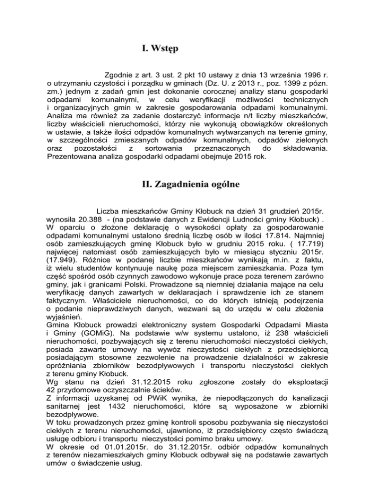 I. Wstęp Zgodnie z art. 3 ust. 2 pkt 10 ustawy z dnia 13 września 1996 r. o utrzymaniu czystości i porządku w gminach (Dz. U. z 2013 r., poz. 1399 z pózn. zm.) jednym z zadań gmin jest dokonanie corocznej analizy stanu gospodarki odpadami komunalnymi, w celu weryfikacji możliwości technicznych i organizacyjnych gmin w zakresie gospodarowania odpadami komunalnymi. Analiza ma również za zadanie dostarczyć informacje n/t liczby mieszkańców, liczby właścicieli nieruchomości, którzy nie wykonują obowiązków określonych w ustawie, a także ilości odpadów komunalnych wytwarzanych na terenie gminy, w szczególności zmieszanych odpadów komunalnych, odpadów zielonych oraz pozostałości z sortowania przeznaczonych do składowania. Prezentowana analiza gospodarki odpadami obejmuje 2015 rok. II. Zagadnienia ogólne Liczba mieszkańców Gminy Kłobuck na dzień 31 grudzień 2015r. wynosiła 20.388 - (na podstawie danych z Ewidencji Ludności gminy Kłobuck) . W oparciu o złożone deklarację o wysokości opłaty za gospodarowanie odpadami komunalnymi ustalono średnią liczbę osób w ilości 17.814. Najmniej osób zamieszkujących gminę Kłobuck było w grudniu 2015 roku. ( 17.719) najwięcej natomiast osób zamieszkujących było w miesiącu styczniu 2015r. (17.949). Różnice w podanej liczbie mieszkańców wynikają m.in. z faktu, iż wielu studentów kontynuuje naukę poza miejscem zamieszkania. Poza tym część spośród osób czynnych zawodowo wykonuje prace poza terenem zarówno gminy, jak i granicami Polski. Prowadzone są niemniej działania mające na celu weryfikację danych zawartych w deklaracjach i sprawdzenie ich ze stanem faktycznym. Właściciele nieruchomości, co do których istnieją podejrzenia o podanie nieprawdziwych danych, wezwani są do urzędu w celu złożenia wyjaśnień. Gmina Kłobuck prowadzi elektroniczny system Gospodarki Odpadami Miasta i Gminy (GOMiG). Na podstawie w/w systemu ustalono, iż 238 właścicieli nieruchomości, pozbywających się z terenu nieruchomości nieczystości ciekłych, posiada zawarte umowy na wywóz nieczystości ciekłych z przedsiębiorcą posiadającym stosowne zezwolenie na prowadzenie działalności w zakresie opróżniania zbiorników bezodpływowych i transportu nieczystości ciekłych z terenu gminy Kłobuck. Wg stanu na dzień 31.12.2015 roku zgłoszone zostały do eksploatacji 42 przydomowe oczyszczalnie ścieków. Z informacji uzyskanej od PWiK wynika, że niepodłączonych do kanalizacji sanitarnej jest 1432 nieruchomości, które są wyposażone w zbiorniki bezodpływowe. W toku prowadzonych przez gminę kontroli sposobu pozbywania się nieczystości ciekłych z terenu nieruchomości, ujawniono, iż przedsiębiorcy często świadczą usługę odbioru i transportu nieczystości pomimo braku umowy. W okresie od 01.01.2015r. do 31.12.2015r. odbiór odpadów komunalnych z terenów niezamieszkałych gminy Kłobuck odbywał się na podstawie zawartych umów o świadczenie usług. Zadania realizowane były przez: – Strach i Synowie Sp. z o .o ul. Bór 169 42-202 Częstochowa – „PROFESSIONAL” S. C. Wiesław Strach i Elżbieta Strach Wywóz nieczystości stałych i płynnych ul. Bór 169 42-202 Częstochowa – Wywóz Nieczystości oraz Przewóz Ładunków Wiesław Strach ul. Kosmowskiej 6 m. 94 42-224 Częstochowa – SITA POŁUDNIE Sp. z o. o. ul. Dębowa 26/28 42-200 Częstochowa – ZAKŁAD OCZYSZCZANIA MIASTA Zbigniew Strach Korzonek 98 42-274 Konopiska – Przedsiębiorstwo Komunalne „DARPOL” Korzonek 98 42-274 Konopiska – EKO- SYSTEM BIS Spółka z ograniczona odpowiedzialnością Spółka komandytowa ul. Przemysłowa 7 42-274 Konopiska – PZOM STRACH Spółka z ograniczona odpowiedzialnością Sp.k. ul. Przemysłowa 7 42-274 Konopiska – Remondis Sp z o. o. Oddział w Częstochowie ul. Radomska 12 42-200 Częstochowa – Firma Handlowo- Usługowa Andrzej Bajor ul. Sadowa 10 Wancerzów 42-244 Mstów Oddział Częstochowa Zakład Przetwarzania Zużytego Sprzętu Elektrycznego i Elektronicznego ul. Ogrodowa 64a 42-202 Częstochowa – Ochrona Środowiska Sp z o. o. ul. Konopnickiej 378 42-260 Kamienica Polska – A.S.A. Eko Polska Sp z o. o. ul. Lecha 10 41-800 Zabrze – PBI Sp.j. Aleja Pokoju 48 25-622 Kielce – PZOM STRACH SP. z o.o. ul. Przemysłowa 7 42-274 Konopiska Od 01.01.2015 r. w wyniku przeprowadzonego - zgodnie z ustawą o utrzymaniu czystości i porządku w gminach - nieograniczonego przetargu na odbiór i zagospodarowania odpadów komunalnych z terenu gminy Kłobuck usługa odbioru odpadów komunalnych i ich zagospodarowania od właścicieli nieruchomości zamieszkałych realizowana była przez EKO- SYSTEM BIS Spółka z ograniczoną odpowiedzialnością Spółka komandytowa. Umowa została zawarta na okres od 01.01.2015r. do 31.12.2015r. Odpady komunalne na terenie gminy Kłobuck odbierane są w postaci zmieszanej i selektywnej. Zgodnie z regulaminem utrzymania czystości i porządku na terenie Gminy Kłobuck prowadzona jest zbiórka selektywna, w ramach której wydzielono następujące frakcje: - meble i inne odpady wielkogabarytowe, - zużyty sprzęt elektryczny i elektroniczny, - przeterminowane leki i chemikalia, - zużyte baterie i akumulatory - odpady budowlano- remontowe z wyłączeniem odpadów pochodzących z budowy, rozbudowy, rozbiórki lub innych robót budowlanych wymagających uzyskania pozwolenia na budowę lub zgłoszenia zgodnie z przepisami Prawa budowlanego oraz odpadów zawierających azbest (dopuszcza się również zagospodarowanie tego odpadu we własnym zakresie) - zużyte opony, - odpady zielone, - tekstylia, - papier i tektura, - szkło, - tworzywa sztuczne, - opakowania wielomateriałowe, - metale, - odpady komunalne ulegające biodegradacji, w tym odpady opakowaniowe ulegające biodegradacji, - popiół z palenisk. W workach kolorowych gromadzone są frakcje: - szkło kolorowe i bezbarwne oraz papier i tektura – worek niebieski - tworzywa szt