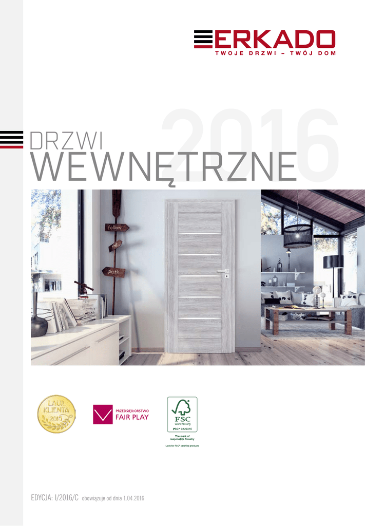 DRZWI 2016 WEWNĘTRZNE EDYCJA: I/2016/C obowiązuje od dnia 1.04.2016 Naszym atutem jest doświadczenie Jesteśmy rodzinną firmą, która swój prężny rozwój oraz dzisiejszy status zawdzięcza prawdziwym pasjonatom i najlepszym fachowcom - własnym przodkom. Nasza działalność w zakresie produkcji drzwi trwa z sukcesem nieprzerwanie już prawie 40 lat. W początkowych latach funkcjonowania firmy (rok 1976), naszą specjalizacją były różnorodne usługi stolarskie dla każdego rodzaju Klientów. Z czasem działalność naszą zawęziliśmy do drewnianych drzwi oraz okien, by w późniejszych latach wyspecjalizować się typowo w produkcji drzwi. Dzięki wyraźnemu ukierunkowaniu mogliśmy skupić się na konkretnym produkcie, zakupić coraz bardziej nowoczesny sprzęt do produkcji, podejmować coraz to nowe wyzwania związane z tym określonym profilem działalności. Ta odważna decyzja pozwoliła nam również na stałą poprawę jakości naszego produktu, dzięki czemu mogliśmy dołączyć do grona niekwestionowanych liderów w produkcji drzwi. Bogata oferta, ale i skupienie na indywidualnych potrzebach Nasza firma od wielu, wielu lat specjalizuje się w szczególnej i wymagającej profesji, jaką jest wszechstronna produkcja drzwi. Przez wiele lat ciężkiej pracy i doskonalenia fachowych umiejętności doszliśmy niemal do perfekcji w kwestii nie tylko technicznego wykonania i wykończenia naszych wyrobów, ale i na płaszczyźnie oferowanego wyboru. ERKADO oferuje Państwu bogaty wybór zarówno drzwi wewnętrznych jak i zewnętrznych, które charakteryzują się niepowtarzalnym stylem, dopracowanymi detalami oraz najwyższą jakością wykonania. Wszystkie nasze produkty są zawsze aktualne z trendami i nowoczesne. Jednocześnie proponujemy modele zupełnie klasyczne i ponadczasowe. Stawiamy na szeroki wybór, bo dobrze wiemy, że gustów jest wiele, a my pragniemy sprostać nawet tym najbardziej wymagającym. SPIS TREŚCI DRZWI RAMIAKOWE STILE..........................................................................................4 DAGLEZJA NOWOŚĆ ................................................8 DEBECJA NOWOŚĆ ................................................ 10 FORSYCJA NOWOŚĆ .............................................12 LAWENDA NOWOŚĆ .............................................. 14 JUKA................................................................. 16 FREZJA NOWOŚĆ .................................................. 18 NEMEZJA ..........................................................20 MAGNOLIA.........................................................22 BERBERYS ....................................................... 24 FLOKS................................................................26 KROKUS ...........................................................28 DALIA ................................................................30 KAMELIA............................................................32 PETUNIA............................................................34 MALWA..............................................................36 IRYS...................................................................38 AZALIA...............................................................40 HIACYNT............................................................42 FRAGI................................................................44 DRZWI SZKLANE GRAF..............................................................................................48 DRZWI PŁYTOWE......................................................................................................54 ALEJA LUX NOWOŚĆ ..............................................57 BRAND..............................................................58 CETRA...............................................................58 SAMUN..............................................................58 DORA.................................................................59 EKA...................................................................59 MANHATTAN......................................................60 TOP...................................................................60 GAMA................................................................60 DRZWI WEWNĘTRZNE WEJŚCIOWE DŹWIĘKOCHŁONNOŚĆ 32dB HERSE SET ........................................................70 HERSE LUX SET ................................................. 71 HERSE MAX SET ................................................ 74 TOLEDO............................................................. 61 BROADWAY........................................................ 61 GALERIA............................................................62 ALEJA ..............................................................62 UNO...................................................................62 ZEFIR.................................................................63 CORTINA ...........................................................63 UNO LUX ...........................................................64 CLASIC...............................................................65 .............................................................66 OŚCIEŻNICA STAŁA I REGULOWANA DO SERII HERSE SET..........................................78 DRZWI WEWNĘTRZNE WEJŚCIOWE PRZECIWPOŻAROWE LEDA EI30 .........................................................79 DŹWIĘKOCHŁONNOŚĆ 32dB ............................79 LEDA EI60 .........................................................79 DRZWI HYBRYDOWE.................................................................................................81 BOSTON ...........................................................82 MESA ...............................................................83 NEVADA ...........................................................84 MONTANA ........................................................85 OMAHA ...................