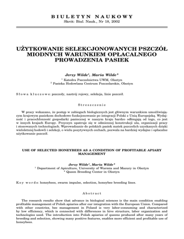 BIULETYN NAUKOWY Skrót: Biul. Nauk., Nr 18, 2002 UŻYTKOWANIE SELEKCJONOWANYCH PSZCZÓŁ MIODNYCH WARUNKIEM OPŁACALNEGO PROWADZENIA PASIEK Jerzy Wilde1, Maria Wilde 2 1 2 Katedra Pszczelnictwa UWM, Olsztyn Pasieka Hodowlana Centrum Pszczelarskie, Olsztyn S ł o w a k l u c z o w e: pszczoły, nastrój rojowy, selekcja, linie pszczół. Streszczenie W pracy wskazano, że postęp w zabiegach biologicznych jest głównym warunkiem umożliwiającym krajowym pasiekom dochodowe funkcjonowanie po integracji Polski z Unią Europejską. Wydajność i pracochłonność gospodarki pasiecznej w naszym kraju bardzo odbiegają od tego, co jest w innych krajach Europy. Przyczyn upatruje się w odmiennej konstrukcji ula, organizacji pracy i stosowanych technologiach. Wprowadzanie do polskich pasiek matek pszczelich uzyskanych dzięki wieloletniej hodowli i selekcji, o wielu pozytywnych cechach, pozwala na bardziej wydajne i opłacalne użytkowanie pszczół. USE OF SELECTED HONEYBEES AS A CONDITION OF PROFITABLE APIARY MANAGEMENT 1 Jerzy Wilde1, Maria Wilde 2 Department of Apiculture, University of Warmia and Mazury in Olsztyn 2 Queen Breeding Center in Olsztyn K e y w o r d s: honeybees, swarm impulse, selection, honeybee breeding lines. Abstract The research results show that advance in biological sciences is the main condition enabling profitable management of Polish apiaries after our integration with the European Union. Compared with other countries, bee management in Poland is very labor-consuming and characterized by low efficiency, which is connected with differences in hive structure, labor organization and technologies used. The introduction into Polish apiaries of queens produced after many years of breeding and selection, showing many positive features, enables more efficient and profitable use of honeybees. 62 Jerzy Wilde, Maria Wilde Wprowadzenie Pszczelarstwo jest bardzo ważnym elementem rozwoju gospodarczego Polski. Pasieki, oprócz bezpośredniej produkcji miodu, wosku, obnóży pyłkowych, mleczka i jadu pszczelego, wpływają na zapylenie upraw entomofilnych. Szacuje się że 1/3 produkcji wytwarzanej w rolnictwie jest zasługą zapylającej pracy pszczół i dziko żyjących owadów zapylających. Zwiększają one plony owoców i nasion roślin owadopylnych średnio o 30%, stanowiąc przy tym jedno z ważnych ogniw równowagi ekologicznej. Zajmowanie się pszczołami stwarza możliwość dodatkowego zarobku osobom pracującym w innych zawodach, jak również szansę zatrudnienia bezrobotnym. Ważnym, choć niewymiernym elementem jest działanie inspiracyjne i kulturotwórcze pszczelarstwa. Kryzys gospodarczy w końcu lat osiemdziesiątych spowodował załamanie się wielu kierunków gospodarki rolnej, w tym również pszczelarstwa. Niekorzystne relacje cenowe odbiły się głównie spadkiem liczby pni pszczelich (z 2,5 miliona do ok. 800 000) oraz liczby pasiek (PIDEK 1996). Najwięcej ubyło pasiek liczących od kilkunastu do kilkudziesięciu rodzin pszczelich. Były to z reguły pasieki przydomowe, stanowiące źródło dodatkowego dochodu. Przeciwdziałając tym niekorzystnym zjawiskom, podjęto wiele działań chroniących polskie pszczelarstwo. Wprowadzono wysokie cła na miód, sięgające w niektórych przypadkach przeszło 130%, subwencjonuje się cukier dla pszczół i zakupy matek pszczelich. Wynikiem tych działań jest wyraźne ożywienie się rynku produktów pszczelich w ostatnich 2 – 3 latach (1995 – 1997). Interwencjonizm państwowy sprawił, że sytuacja stała się bardziej korzystna dla pszczelarzy. Stosunek ceny cukru do miodu wynosi obecnie 1:4 – przy cenach hurtowych miodu, a 1:7 – 9 – przy cenach detalicznych. W pszczelarstwie polskim obserwujemy także przemiany strukturalno-organizacyjne, objawiające się głównie wzrostem liczy rodzin pszczelich w pasiekach towarowych, wzrostem liczby pszczelarzy samodzielnie sprzedających produkty oraz podejmujących wielokierunkową produkcję. Pobudzeniu zachodzących zmian służą również preferencyjne kredyty dla pszczelarzy. W najbliższych kilku latach Polska wejdzie do struktur Unii Europejskiej, a pszczelarstwo polskie będzie musiało konkurować z importowanymi i tanimi produktami. Będzie to miało mniejszy wpływ na małe pasieki, prowadzone hobbystycznie, które są nieopłacalne. Przed poważnym problemem staną pszczelarze posiadający pasieki stanowiące dodatkowe źródło dochodu oraz ci, dla których pasieka jest jedynym źródłem utrzymania (BRATKOWSKI, WILDE 1998, WILDE 2001). Perspektywa integracji Polski z Unią Europejską stwarza konieczność oceny pszczelarstwa w kategoriach ekonomicznej konkurencyjności z innymi krajami. Na świecie znajduje się 50 mln rodzin pszczelich w warunkach kontrolowanych przez człowieka i drugie tyle żyjących dziko. Rezerwy świato- Użytkowanie selekcjonowanych pszczół ... 63 we zasobów pożytkowych są szacowane na 140 mln rodzin pszczelich. Liczbowy udział pszczelarstwa Polski w pszczelarstwie światowym stanowi ok. 2%, a w pszczelarstwie Unii Europejskiej ok. 13% (PIDEK 1997). Czy istnieje zatem możliwość takiego prowadzenia produkcji pasiecznej w warunkach klimatyczno-pożytkowych Polski, aby z pszczół uzyskiwać dochód umożliwiający utrzymanie rodziny, który przewyższałby średnią płacę w gospodarce narodowej i zapewnił wystarczający standard życia? Na to pytanie można odpowiedzieć twierdząco. Niezbędne jest jednak spełnienie wielu warunków. W niniejszym artykule zwrócono uwagę na postęp biologiczny (WILDE, CICHOŃ 1999). Celem pracy jest wskazanie na możliwości, jakie daje w racjonalnie prowadzonej pasiece wykorzystanie postępu biologicznego i nowoczesnych technologii. Odmienny model gospodarowania i wydajność pracy W odmiennym modelu gospodarowania, którego pierwowzór stanowią pasieki w Austrii i Niemczech, są notowane znacznie mniejsze nakłady, przy znacznie większej wydajności pracy (pasieki lic