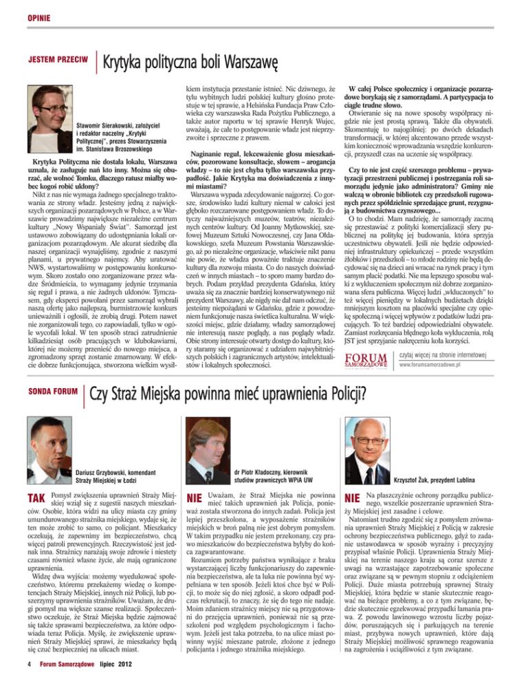 opinie Krytyka polityczna boli Warszawę Krytyka Polityczna nie dostała lokalu, Warszawa uznała,żezasługujenańktoinny.Możnasięoburzać,alewolnoćTomku,dlaczegoratuszmiałbywobeckogośrobićukłony? Nikt z nas nie wymaga żadnego specjalnego traktowania ze strony władz. Jesteśmy jedną z największych organizacji pozarządowych w Polsce, a w Warszawie prowadzimy największe niezależne centrum kultury „Nowy Wspaniały Świat”. Samorząd jest ustawowo zobowiązany do udostępniania lokali organizacjom pozarządowym. Ale akurat siedzibę dla naszej organizacji wynajęliśmy, zgodnie z naszymi planami, u prywatnego najemcy. Aby uratować NWS, wystartowaliśmy w postępowaniu konkursowym. Skoro zostało ono zorganizowane przez władze Śródmieścia, to wymagamy jedynie trzymania się reguł i prawa, a nie żadnych ukłonów. Tymczasem, gdy eksperci powołani przez samorząd wybrali naszą ofertę jako najlepszą, burmistrzowie konkurs unieważnili i ogłosili, że zrobią drugi. Potem nawet nie zorganizowali tego, co zapowiadali, tylko w ogóle wycofali lokal. W ten sposób straci zatrudnienie kilkadziesiąt osób pracujących w klubokawiarni, której nie możemy przenieść do nowego miejsca, a zgromadzony sprzęt zostanie zmarnowany. W efekcie dobrze funkcjonująca, stworzona wielkim wysił- fot.StrażMiejskaŁódź sonda FoRum Czytoniejestczęśćszerszegoproblemu–prywatyzacjiprzestrzenipublicznejipostrzeganiarolisamorządu jedynie jako administratora? Gminy nie walcząwobroniebibliotekczyprzedszkolirugowanychprzezspółdzielniesprzedającegrunt,rezygnujązbudownictwaczynszowego... O to chodzi. Mam nadzieję, że samorządy zaczną się przestawiać z polityki komercjalizacji sfery publicznej na politykę jej budowania, która sprzyja uczestnictwu obywateli. Jeśli nie będzie odpowiedniej infrastruktury opiekuńczej – przede wszystkim żłobków i przedszkoli – to młode rodziny nie będą decydować się na dzieci ani wracać na rynek pracy i tym samym płacić podatki. Nie ma lepszego sposobu walki z wykluczeniem społecznym niż dobrze zorganizowana sfera publiczna. Więcej ludzi „wkluczonych” to też więcej pieniędzy w lokalnych budżetach dzięki mniejszym kosztom na placówki specjalne czy opiekę społeczną i więcej wpływów z podatków ludzi pracujących. To też bardziej odpowiedzialni obywatele. Zamiast rozkręcania błędnego koła wykluczenia, rolą JST jest sprzyjanie nakręceniu koła korzyści. czytajwięcejnastronieinternetowej www.forumsamorzadowe.pl Czy Straż Miejska powinna mieć uprawnienia Policji? Dariusz Grzybowski, komendant Straży Miejskiej w Łodzi Pomysł zwiększenia uprawnień Straży Miejskiej wziął się z sugestii naszych mieszkańców. Osobie, która widzi na ulicy miasta czy gminy umundurowanego strażnika miejskiego, wydaje się, że ten może zrobić to samo, co policjant. Mieszkańcy oczekują, że zapewnimy im bezpieczeństwo, chcą więcej patroli prewencyjnych. Rzeczywistość jest jednak inna. Strażnicy narażają swoje zdrowie i niestety czasami również własne życie, ale mają ograniczone uprawnienia. Widzę dwa wyjścia: możemy wyedukować społeczeństwo, któremu przekażemy wiedzę o kompetencjach Straży Miejskiej, innych niż Policji, lub poszerzymy uprawnienia strażników. Uważam, że drugi pomysł ma większe szanse realizacji. Społeczeństwo oczekuje, że Straż Miejska będzie zajmować się także sprawami bezpieczeństwa, za które odpowiada teraz Policja. Myślę, że zwiększenie uprawnień Straży Miejskiej sprawi, że mieszkańcy będą się czuć bezpieczniej na ulicach miast. tak 4 Naginanie reguł, lekceważenie głosu mieszkańców,pozorowanekonsultacje,słowem–arogancja władzy–toniejestchybatylkowarszawskaprzypadłość.JakieKrytykamadoświadczeniazinnymimiastami? Warszawa wypada zdecydowanie najgorzej. Co gorsze, środowisko ludzi kultury niemal w całości jest głęboko rozczarowane postępowaniem władz. To dotyczy najważniejszych muzeów, teatrów, niezależnych centrów kultury. Od Joanny Mytkowskiej, szefowej Muzeum Sztuki Nowoczesnej, czy Jana Ołdakowskiego, szefa Muzeum Powstania Warszawskiego, aż po niezależne organizacje, właściwie nikt panu nie powie, że władza poważnie traktuje znaczenie kultury dla rozwoju miasta. Co do naszych doświadczeń w innych miastach – to sporo mamy bardzo dobrych. Podam przykład prezydenta Gdańska, który uważa się za znacznie bardziej konserwatywnego niż prezydent Warszawy, ale nigdy nie dał nam odczuć, że jesteśmy niepożądani w Gdańsku, gdzie z powodzeniem funkcjonuje nasza świetlica kulturalna. W większości miejsc, gdzie działamy, władzy samorządowej nie interesują nasze poglądy, a nas poglądy władz. Obie strony interesuje otwarty dostęp do kultury, który staramy się organizować z udziałem najwybitniejszych polskich i zagranicznych artystów, intelektualistów i lokalnych społeczności. WcałejPolscespołecznicyiorganizacjepozarządoweborykająsięzsamorządami.Apartycypacjato ciągletrudnesłowo. Otwieranie się na nowe sposoby współpracy nigdzie nie jest prostą sprawą. Także dla obywateli. Skomentuję to najogólniej: po dwóch dekadach transformacji, w której akcentowano przede wszystkim konieczność wprowadzania wszędzie konkurencji, przyszedł czas na uczenie się współpracy. Forum samorządowe lipiec 2012 dr Piotr Kładoczny, kierownik studiów prawniczych WPiA UW Uważam, że Straż Miejska nie powinna mieć takich uprawnień jak Policja, ponieważ została stworzona do innych zadań. Policja jest lepiej przeszkolona, a wyposażenie strażników miejskich w broń palną nie jest dobrym pomysłem. W takim przypadku nie jestem przekonany, czy prawo mieszkańców do bezpieczeństwa byłyby do końca zagwarantowane. Rozumiem potrzeby państwa wynikające z braku wystarczającej liczby funkcjonariuszy do zapewnienia bezpieczeństwa, ale ta luka nie powinna być wypełniana w ten sposób. 