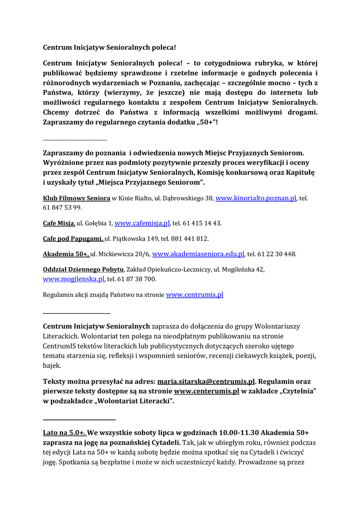 Centrum Inicjatyw Senioralnych poleca! Centrum Inicjatyw Senioralnych poleca! – to cotygodniowa rubryka, w której publikować będziemy sprawdzone i rzetelne informacje o godnych polecenia i różnorodnych wydarzeniach w Poznaniu, zachęcając – szczególnie mocno – tych z Państwa, którzy (wierzymy, że jeszcze) nie mają dostępu do internetu lub możliwości regularnego kontaktu z zespołem Centrum Inicjatyw Senioralnych. Chcemy dotrzeć do Państwa z informacją wszelkimi możliwymi drogami. Zapraszamy do regularnego czytania dodatku „50+”! __________________________ Zapraszamy do poznania i odwiedzenia nowych Miejsc Przyjaznych Seniorom. Wyróżnione przez nas podmioty pozytywnie przeszły proces weryfikacji i oceny przez zespół Centrum Inicjatyw Senioralnych, Komisję konkursową oraz Kapitułę i uzyskały tytuł „Miejsca Przyjaznego Seniorom”. Klub Filmowy Seniora w Kinie Rialto, ul. Dąbrowskiego 38, www.kinorialto.poznan.pl, tel. 61 847 53 99. Cafe Misja, ul. Gołębia 1, www.cafemisja.pl, tel. 61 415 14 43. Cafe pod Papugami, ul. Piątkowska 149, tel. 881 441 812. Akademia 50+, ul. Mickiewicza 20/6, www.akademiaseniora.edu.pl, tel. 61 22 30 448. Oddział Dziennego Pobytu, Zakład Opiekuńczo-Leczniczy, ul. Mogileńska 42, www.mogilenska.pl, tel. 61 87 38 700. Regulamin akcji znajdą Państwo na stronie www.centrumis.pl _________________________ Centrum Inicjatyw Senioralnych zaprasza do dołączenia do grupy Wolontariuszy Literackich. Wolontariat ten polega na nieodpłatnym publikowaniu na stronie CentrumIS tekstów literackich lub publicystycznych dotyczących szeroko ujętego tematu starzenia się, refleksji i wspomnień seniorów, recenzji ciekawych książek, poezji, bajek. Teksty można przesyłać na adres: [email protected]. Regulamin oraz pierwsze teksty dostępne są na stronie www.centerumis.pl w zakładce „Czytelnia” w podzakładce „Wolontariat Literacki”. ___________________________ Lato na 5.0+. We wszystkie soboty lipca w godzinach 10.00-11.30 Akademia 50+ zaprasza na jogę na poznańskiej Cytadeli. Tak, jak w ubiegłym roku, również podczas tej edycji Lata na 50+ w każdą sobotę będzie można spotkać się na Cytadeli i ćwiczyć jogę. Spotkania są bezpłatne i może w nich uczestniczyć każdy. Prowadzone są przez doświadczoną instruktorkę, a zestaw ćwiczeń dostosowany jest do osób 50+. Spotkania odbędą się jedynie w sprzyjających warunkach pogodowych. Prosimy przyjść ze swoją matą. Miejsce: Cytadela, Dzwon Pokoju. Zapisy w sekretariacie Akadamii 50+, ul. Mickiewicza 20/6, tel. 61 223 04 48. ____________________________ Pro-aktywni 50+. W poniedziałek 23 lipca o godzinie 17.30 w ramach projektu Pro-aktywni 50+ Fundacja SIC! zaprasza na spacer z nordic walking. Przewodnikiem będzie Marcin Szulc (Marsz po Zdrowie)., znany Państwu m.in. z treningu NW organizowanego cyklicznie podczas targów Aktywni 50+. Kontakt: Fundacja SIC!, tel. _________________ Filmowy Klub Seniora to seanse, na których szczególnie mile widziani są seniorzy. Odbywają się one w każdy wtorek o godz. 15.30. Kino Rialto jest miejscem, w którym można zarówno obejrzeć filmy , jak i spotkać się i miło spędzić czas, podyskutować lub porozmawiać z zaproszonym gościem specjalnym przy filiżance kawy. Program jest realizowany wspólnie z Filmoteką Narodową. W programie lipcowym Klubu znalazły się: 24.07. „Rzecz o mych smutnych dziwkach”; „Kop głębiej”. Bilet ulgowy: 10 zł (w cenie filiżanka kawy). Kontakt: tel. 61 847 53 99 lub e-mail: [email protected]. ____________________ Lato na 5.0+. Akademia 50+ 18 lipca o godz. 17.00 zaprasza na otwarty wykład My po 50-tcerola koenzymu Q10 w życiu seniora oraz Akcja Zdrowie Stawy. Wykład organizowany jest przez Biopharma Polska, uczestnika targów Aktywni 50+. Każdy uczestnik wykładu otrzyma w prezencie maść na stawy i kręgosłup, a ponadto będzie miał możliwość otrzymania specjalistycznej 30-dniowej kuracji kolagenowej o wartości 850 zł. Specjalnie dla par małżeńskich, które wspólnie będą uczestniczyć w wykładzie Biopharma Polska przygotowała prezent w postaci kremu zawierającego koenzym Q10. Wykład jest otwarty. Bezpłatne zaproszenia można odbierać w sekretariacie Akademii 50+, ul. Mickiewicza 20/6, tel. 61 223 04 48. _______________________ Stowarzyszenie European Centre of Citizens’ Partnership (Europejskie Centrum Współpracy Obywatelskiej) zaprasza do udziału w konkursie fotograficznym Okiem Seniora. Serdecznie zachęcamy do udziału. Konkurs fotograficzny Okiem Seniora organizowany przez stowarzyszenie European Centre of Citizens’ Partnership (Europejskie Centrum Współpracy Obywatelskiej) jest odpowiedzią na coraz częściej dostrzeganą potrzebę aktywizowania osób starszych i włączania ich w działania obywatelskie. Wpisując się w politykę Europejskiego Roku Aktywności Osób Starszych i Solidarności Międzypokoleniowej wychodzimy naprzeciw potrzebom starszych ludzi do włączenia się w życie społeczne, realizacji i rozwoju swoich zainteresowań oraz podejmowania ciekawych inicjatyw w ich wolnym czasie. Konkurs fotograficzny Okiem Seniora opiera się na następujących głównych zasadach. Konkurs skierowany jest do osób powyżej 55 roku życia i realizowany jest na lokalnej przestrzeni Powiatu Poznańskiego. Konkurs przewiduje 4 kategorie, w ramach których uczestnicy mogą wykonywać swoje prace: moje miasto, moje hobby, ludzie i natura. Udział w konkursie jest bezpłatny, a sam konkurs organizowany jest przez organizację nonprofit, która nie czerpie żadnych materialnych korzyści z jego realizacji. Konkurs został ogłoszony 28 czerwca br. Uczestnicy mogą przesyłać swoje prace do 28 sierpnia br. Projekt zakończy gala finałowa z ogłoszeniem wyników, połączona z częścią kulturalną 5 września br. Przewidziane są nagrody dla najlepszych prac w każdej z kategorii oraz jedna nagroda główna dla najlepsz
