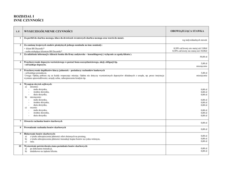 ROZDZIAŁ I INNE CZYNNOŚCI L.P. 1 WYSZCZEGÓLNIENIE CZYNNOŚCI OBOWIĄZUJĄCA STAWKA Za portfel do skarbca nocnego, klucz do drzwiczek wrzutowych skarbca nocnego oraz worek do monet. wg indywidualnych stawek 2 Za zamianę krajowych znaków pieniężnych jednego nominału na inne nominały: - klient BS Duszniki* 3 - osoba niebędąca klientem BS Duszniki* Za udzielenie informacji o kliencie banku dla firmy audytorsko – konsultingowej ( wyłącznie za zgodą klienta ). 4 Przechowywanie depozytu wartościowego w postaci bonu oszczędnościowego, akcji, obligacji itp. - od każdego depozytu. 5 Przechowywanie duplikatów kluczy jednostek – posiadaczy rachunków bankowych - od każdego posiadacza. Uwaga: Opłatę pobiera się za każdy rozpoczęty miesiąc. Opłata nie dotyczy wymienionych depozytów składanych z urzędu, np. przez instytucje wymiaru sprawiedliwości, urzędy celne, zabezpieczenie kredytu itp. 6 Wynajem skrytek sejfowych: a) dziennie: mała skrzynka, średnia skrzynka, duża skrzynka, b) miesięcznie: mała skrzynka, średnia skrzynka, duża skrzynka, c) rocznie: mała skrzynka, średnia skrzynka, duża skrzynka. 0,20% od kwoty nie mniej niż 5,00zł 0,50% od kwoty nie mniej niż 10,00zł 50,00 zł 5,00 zł miesięcznie 5,00 zł miesięcznie 0,00 zł 0,00 zł 0,00 zł 0,00 zł 0,00 zł 0,00 zł 0,00 zł 0,00 zł 0,00 zł 7 Otwarcie rachunku bonów skarbowych 8 Prowadzenie rachunku bonów skarbowych 9 Blokowanie bonów skarbowych: a) z tytułu zabezpieczenia płatności ofert złożonych na przetarg, b) z tytułu zabezpieczenia płatności transakcji kupna bonów na rynku wtórnym, c) inne. 0,00 zł 0,00 zł 0,00 zł Wystawienie potwierdzenia stanu posiadania bonów skarbowych: a) po dokonaniu transakcji, b) dodatkowo na żądanie klienta. 0,00 zł 0,00 zł 10 0,00 zł 0,00 zł L.P. 11 WYSZCZEGÓLNIENIE CZYNNOŚCI OBOWIĄZUJACA STAWKA Przechowywanie bonów skarbowych. 0,00 zł 12 Zakup bonów skarbowych na rynku wtórnym: a) prowizja zależna od wartości oferty, a) transakcja niezrealizowana. 0,00 zł 0,00 zł 13 Rynek wtórny kupno / sprzedaż: a) opłata za rejestrację transakcji ( jeśli stroną transakcji nie jest BS ), b) opłata za rejestrację transakcji ( jeśli stroną jest BS ), c) transakcja niezrealizowana. 0,00 zł 0,00 zł 0,00 zł 14 Odkup bonów skarbowych przez Emitenta: a) transakcja zrealizowana b) transakcja niezrealizowana. 0,00 zł 0,00 zł 15 Wykup bonów skarbowych. 16 Transfer bonów skarbowych: a) z BS na konto innego uczestnika CRBS, b) do BS z konta innego uczestnika CRBS. 17 18 Za przygotowanie, sporządzenie i przekazanie informacji stanowiących tajemnicę bankową uprawnionym przez Ustawę Prawo bankowe osobom, organom i instytucjom Uwaga: „Opłaty nie pobiera się w przypadku wystąpienia żądania udzielenia informacji na rzecz podmiotów lub organów wyszczególnionych w art.110 Ustawy Prawo bankowe” Za zastrzeżenie: a) dokumentu tożsamości klienta BS Duszniki* b) dokumentu tożsamości osoby nie będącej klientem BS Duszniki* * Klient BS Duszniki to osoba fizyczna, która posiada w BS Duszniki rachunek bankowy lub kredyt. Bank mając na uwadze jeden lub kilka z niżej wymienionych czynników: -pozyskanie nowego klienta, - kwotę kredytu, -inne warunki określone indywidualnie wobec klienta -poziom ryzyka kredytowego - współpracę z dotychczasowym klientem, - ofertę innych banków może ustalić w umowie z klientem niższą prowizję lub opłatę od określonej w taryfie albo odstąpić od pobrania prowizji lub opłaty. 0,00 zł 0,00 zł 0,00 zł 100,00 zł 10,00 zł 20,00 zł
