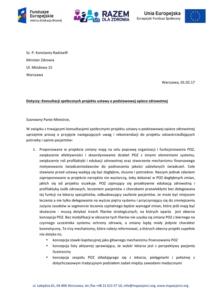Sz.P.KonstantyRadziwiłł MinisterZdrowia Ul.Miodowa15 Warszawa Warszawa,01.02.17 Dotyczy:Konsultacjispołecznychprojektuustawyopodstawowejopiecezdrowotnej SzanownyPanieMinistrze, Wzwiązkuztrwającymikonsultacjamispołecznymiprojektuustawyopodstawowejopiecezdrowotnej uprzejmie proszę o przyjęcie następujących uwag i rekomendacji do projektu odzwierciedlających potrzebyiopiniepacjentów: 1. Proponowane w projekcie zmiany mają na celu poprawę organizacji i funkcjonowania POZ, zwiększenie efektywności i skoordynowanie działań POZ z innymi elementami systemu, zwiększenie roli profilaktyki i edukacji zdrowotnej oraz stworzenie mechanizmu finansowego motywowania świadczeniodawców do podnoszenia jakości udzielanych świadczeń. Cele stawianeprzedustawąwydająsiębyćdogłębne,słuszneipotrzebne.Naszymjednakzdaniem zaproponowanewprojekcienarzędzianiewystarczą,żebydokonaćwPOZdogłębnychzmian, jakich się od projektu oczekuje. POZ zajmujący się proaktywnie edukacją zdrowotną i profilaktykąosóbzdrowych,leczeniempacjentówzchorobamiprzewlekłymibezdelegowana tejfunkcjinalekarzyspecjalistów,odbudowującyzaufaniepacjentów,żemożebyćmiejscem leczeniaanietylkodelegowanianawyższepiętrasystemuiprzyczyniającysiędozmniejszenia zużyciazasobówwsegmencieleczeniaszpitalnegobędziewymagałzmian,którejeślimająbyć skuteczne - muszą dotykać trzech filarów strategicznych, na których oparta jest obecna koncepcjaPOZ.BezmodyfikacjiwobszarzetychfilarównieuzyskasięzmianyPOZzbiernegona czynnego uczestnika systemu ochrony zdrowia, a zmiany będą miały jedynie charakter kosmetyczny.Tetrzymechanizmy,którenależyreformować,aktórychobecnyprojektzupełnie niedotykato; • koncepcjastawkikapitacyjnejjakogłównegomechanizmufinansowaniaPOZ • koncepcja listy aktywnej sprawiająca, że wybór lekarza jest z perspektywy pacjenta iluzoryczny • koncepcja zespołu POZ składającego się z lekarza, pielęgniarki i położnej z dotychczasowymtradycyjnympodziałemzadańmiędzyzawodamimedycznymi ul.Łabędzia61,04-806Warszawa,tel./fax+48226155710,[email protected],www.mypacjenci.org 2. Stawka kapitacyjna pozostaje w świetle projektu ustawy o POZ podstawowym mechanizmem finansowaniategosegmentuopieki.Zostajewzbogaconaobudżetpowierzonynadiagnostykęileczenie specjalistyczneorazdodatkizadaniowezaedukacjęiprofilaktykęzdrowotnąorazopiekąnadprzewlekle chorymi.Niezmienitofaktu,żenadalmotywacjądlaPOZpozostaniegłowniezapisaniepacjentaapotem minimalizowanie okazji do korzystania przez pacjenta z usług POZ. POZ nie stanie się bardziej zmotywowany do realizacji coraz liczniejszych i ambitniejszych zadań, stanie się natomiast dużo droższym segmentem opieki. Jego koszty sięgają w 2017 roku 10 mld pln a po wdrożeniu projektu istotniewzrosną.TenwzrostwydatkówniebędziejednaktowarzyszyłpoprawiejakościpracyPOZ. Zmianynależyprojektowaćtak,żebyPOZmiałmotywacjędoproaktywnegokontaktuzeswoimi pacjentami, przypominania im o terminach badań profilaktycznych, prowadzenia edukacji zdrowotnejidbaniaotakieistotneparametryzdrowiapublicznegojak: • ponadprzeciętnywspółczynnikdzieciszczepionychzgodniezkalendarzemszczepień • ponadprzeciętnywspółczynnikosóbbeznadwagiiotyłości • niskiwspółczynnikpacjentówwymagającychhospitalizacji • ponadprzeciętnywspółczynnikosóbpoddającychsiębadaniomprofilaktycznym • ponadprzeciętnywspółczynnikpacjentówpozytywieoceniającychjakośćopiekiwPOZ SystemfinansowaniaPOZpowinienodejśćodstawkikapitacyjnejizostaćzastąpionysystemem opłatzawizytęadocelowoopłatzauzyskanyefektzdrowotny. 3. Fundacjaprowadziobecniebadaniamającenaceluustaleniejakiodsetekpacjentówleczysięu wybranych przez siebie lekarzy rodzinnych. W świetle zebranych opinii wielu pacjentów nie może zapisać się na listę do lekarza swojego wyboru z uwagi na zamkniętą listę aktywną. Są kierowani do innych lekarzy, którzy listy pacjentów nie mają kompletnej. W przypadku koniecznościkontaktupacjencisąkierowanijeszczedoinnychlekarzy.Takwięcmożnauznać, że prawo wyboru lekarza w POZ jest z perspektywy pacjentów iluzoryczne. Należy dążyć do wprowadzeniasystemu,wktórymtowybranyprzezpacjentalekarzorganizujepracęswojego zespołu w sposób, który zapewni pacjentom dobra jakość opieki. To lekarz dobiera, szkoli i nadzorujepracęswojegozespołuiodpowiadazajegojakość..Wtakimmechanizmielekarzjest motywowany do przejmowania odpowiedzialności za zapewnienie swoim pacjentom bezpieczeństwazdrowotnegoTakichzmianustawaoPOZjednakniewprowadza. 4. ZespółPOZzłożonyzlekarza,pielęgniarkiipołożnejniezrealizujeambitnychinowoczesnych zadań stojących przed nim w zakresie opieki nad chorymi i zdrowymi pacjentami. Zadania związanezedukacjązdrowotnąiprofilaktykąpowinnybyćrealizowaneprzezznacznieszersze gronoprzedstawicielizawodówmedycznychtakichjakdietetycy,psycholodzy,fizjoterapeuciczy edukatorzyzdrowia.Niesprostawyzwaniomrozwijającejsięmedycynyprewencyjnejtradycyjny zespół POZ, z tradycyjnym podziałem zadań w którym lekarz robi wszystko – zajmuje się zdrowymi i chorymi a pielęgniarka asystuje i pomaga lekarzowi. Lekarz w nowym POZ nie powinien zajmować się edukacją i profilaktyką zdrowotną, te zadania w całości powinny spoczywaćnabarkachpersonelumedycznego.Czydodatekzadaniowyzaprofilaktykętrafito tych zawodów? Na te pytania projekt nie udziela odpowiedzi. Nie wskazuje tez jak miałaby wyglądaćwspółpracaPOZzzawodamimedycznymiumieszczonyminainnychpiętrachsystemu – AOS i w lecznictwie zamkniętym. Proponowane zmiany nie gwarantują, że w POZ nastąpi zapowiadanezwiększenieroliedukacjiiprofilaktykizdrowotnej,pomimozwiększenianakładów natencel. ul.Łabędzia61,04-806Warszawa,tel./fax+48226155710,[email protected],www.mypacjenci.org 5. Ubolewamy, ze z zespołu POZ prezentowanego w 2016 roku w ramach założeń Narodowej Służby Zdrowia zniknął dietetyk. Jesteśmy przekonani, że lekarze POZ, nawet najbardziej pracow