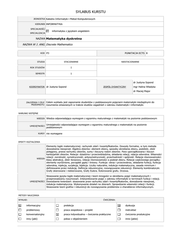SYLABUS KURSTU JEDNOSTKA Katedra Informatyki i Metod Komputerowych KIERUNEK INFORMATYKA SPECJALNOŚĆ/ informatyka z językiem angielskim SPECJALIZACJA NAZWA Matematyka dyskretna NAZWA W J. ANG. Discrete Mathematics KOD P3 STUDIA PUNKTACJA ECTS 8 STACJONARNE ROK STUDIÓW I SEMESTR 1 NIESTACJONARNE dr Justyna Szpond KOORDYNATOR dr Justyna Szpond ZESPÓŁ DYDAKTYCZNY mgr Halina Władyka dr Maciej Major ZAŁOŻENIA I CELE Celem wykładu jest zapoznanie studentów z podstawowymi pojęciami matematyki niezbędnymi do PRZEDMIOTU rozumienia omawianych w trakcie studiów zagadnień z zakresu matematyki i informatyki. WARUNKI WSTĘPNE WIEDZA Wiedza odpowiadająca wymogom z egzaminu maturalnego z matematyki na poziomie podstawowym UMIEJĘTNOŚCI Umiejętności odpowiadające wymogom z egzaminu maturalnego z matematyki na poziomie podstawowym KURSY nie wymagane EFEKTY KSZTAŁCENIA Elementy logiki matematycznej: rachunek zdań i kwantyfikatorów. Dowody formalne, w tym metoda dowodzenia niewprost. Algebra zbiorów: element zbioru, sposoby określania zbioru, podzbiór, zbiór potęgowy, prawa rachunku zbiorów, sumy i iloczyny rodzin zbiorów. Para uporządkowana i iloczyn kartezjański zbiorów. Relacje: dziedzina i przeciwdziedzina, składanie relacji, relacja odwrotna. Własności relacji: zwrotność, symetryczność, antysymetryczność, przechodniość i spójność. Relacje równoważności: WIEDZA klasy abstrakcji, zbiór ilorazowy, relacja równoważności a podział zbioru. Relacje częściowego porządku: elementy wyróżnione, porządek gęsty i liniowy. Funkcje: obraz i przeciwobraz, składanie funkcji, funkcja odwrotna, injekcja, surjekcja, bijekcja. Liczby naturalne, indukcja matematyczna, zasada minimum i definiowanie przez indukcję. Definicje rekurencyjne, rozwiązywanie rekurencji. Elementy kombinatoryki. Grafy skierowane i niekierowane, Grafy Eulera. Kolorowanie grafu. Drzewa. Stosowanie języka logiki matematycznej i teorii mnogości w określaniu pojęć matematycznych i przeprowadzaniu rozumowań. Interpretowanie pojęć z zakresu informatyki w terminach funkcji i relacji. UMIEJĘTNOŚCI Dowodzenie twierdzeń: stosowanie praw rachunku zdań i kwantyfikatorów, dowodzenie niewprost, indukcja matematyczna. Wykonywanie działań na zbiorach. Sprawdzanie własności relacji i funkcji. Stosowanie teorii grafów i rekurencji do rozwiązywania problemów o charakterze informatycznym. METODY NAUCZANIA WYKŁAD: ĆWICZENIA: informacyjny prelekcja dyskusja problemowy praca zespołowa – projekt instruktaż konwersatoryjny praca indywidualna – ćwiczenia praktyczne ćwiczenia produkcyjne inny (jaki) pokaz z objaśnieniem inne (jakie) platforma Moodle Elementy kształcenia zdalnego: inne (jakie) ORGANIZACJA FORMA ZAJĘĆ ĆWICZENIA W GRUPACH WYKŁAD (W) A LICZBA GODZIN STUDIA STACJONARNE 30 30 STUDIA NIESTACJONARNE 30 30 K L S P FORMY SPRAWDZANIA EFEKTÓW KSZTAŁCENIA W A zaliczenie na podstawie prac pisemnych (minimum dwie), odpowiedzi ustnych i aktywnego uczestnictwa w zajęciach K L S P FORMA ZALICZENIA egzamin zaliczenie z oceną zaliczenie OCENA zaliczenie z oceną UWAGI PODSTAWOWA Witold Lipski, Kombinatoryka dla programistów, Wydawnictwo Naukowo-Techniczne, Warszawa 1982. W. Marek, J. Onyszkiewicz, Elementy logiki i teorii mnogości w zadaniach, Wydawnictwo PWN, LITERATURA Warszawa 2006 H. Rasiowa, Wstęp do matematyki współczesnej, Wydawnictwo Naukowe PWN, Warszawa 2007. K. A. Ross, Ch. R. B. Wright, Matematyka dyskretna, WN PWN, W-wa 2001 R. J. Wilson, Wstęp do teorii grafów, WN PWN, Wwa 1998 ZMIANY: UZUPEŁNIAJĄCA A. Chronowski, Elementy teorii mnogości, Wydawnictwo Naukowe WSP, Kraków 2000. A. Chronowski, Zadania z elementów teorii mnogości i logiki matematycznej, Wydawnictwo ,,Dla szkoły'', Wilkowice 1999.