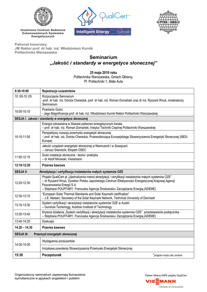Uczelniane Centrum Badawcze Zrównoważonych Systemów Energetycznych Patronat honorowy: JM Rektor prof. dr hab. inż. Włodzimierz Kurnik Politechnika Warszawska Seminarium „Jakość i standardy w energetyce słonecznej” 25 maja 2010 roku Politechnika Warszawska, Gmach Główny, Pl. Politechniki 1, Mała Aula 9:30-10:00 Rejestracja uczestników 10 :00-10 :05 Rozpoczęcie Semnarium -prof. dr hab. inż. Dorota Chwieduk, prof. dr hab. inż. Roman Domański oraz dr inż. Ryszard Wnuk, moderatorzy Seminarium Powitanie Gości 10:05-10:10 - Jego Magnificencja prof. dr hab. inż. Włodzimierz Kurnik Rektor Politechniki Warszawskiej SESJA I: Jakość i standardy w energetyce słonecznej Energia odnawialna w bilansie paliwowo energetycznym świata – prof. dr hab. inż. Roman Domański, Instytut Techniki Cieplnej Politechniki Warszawskiej Perspektywy rozwoju przemysłu energetyki słonecznej 10:10-11:50 – prof. dr hab. inż. Dorota Chwieduk, Przewodnicząca Europejskiego Stowarzyszenia Energetyki Słonecznej (ISESEurope) Jakość urządzeń energetyki słonecznej w Niemczech i w Szwajcarii – Janusz Starościk, Ekspert OSEC Duże instalacje słoneczne - teoria i praktyka 11:50-12:10 – dr Adolf Mirowski, Viessmann 12:10-12:20 SESJA II: Przerwa kawowa Akredytacja i certyfikacja instalatorów małych systemów OZE 13:40-14:20 Projekt QualiCert pt „Ujednolicenie metod akredytacji i certyfikacji instalatorów małych systemów OZE” – dr Ryszard Wnuk, Dyrektor Polsko Japońskiego Centrum Efektywności Energetycznej Krajowej Agencji Poszanowania Energii S.A. – Stéphane POUFFARY, Francuska Agencja Środowiska i Zarządzania Energią (ADEME) “European Solar Thermal Standards and Solar Keymark certification” – J.E. Nielsen, Secretary of the Solar Keymark Network, Technical University of Denmark System certyfikacji i akredytacji instalatorów systemów OZE w Austrii – Gundula Tschernigg, Austrian Institute of Technology Kryteria działania „System certyfikacji i akredytacji instalatorów systemów OZE” przedstawienie podręcznika – Stéphane POUFFARY, Francuska Agencja Środowiska i Zarządzania Energią (ADEME) Dyskusja 14.20 – 14.30 Przerwa kawowa 12:20-12:30 12:30-13:10 13:10-13:30 13:30-13:40 SESJA III: Przemysł energetyki słonecznej Wystąpienia producentów 14:30-15:30 Inicjatywa powołania Stowarzyszenia Przemysłu Energetyki Słonecznej 15:30 Poczęstunek Organizatorzy seminarium zapewniają tłumaczenie symultaniczne w językach angielskim i polskim *program może ulec zmianie Partner Główny KAPE projektu QualiCert: