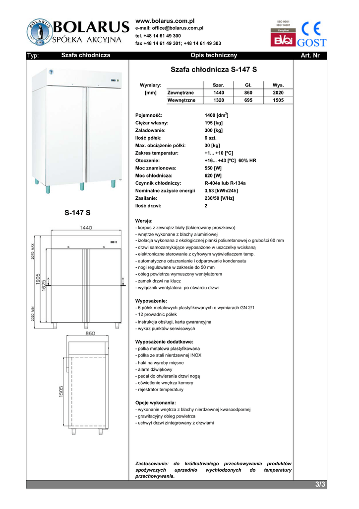 www.bolarus.com.pl e-mail: [email protected] tel. +48 14 61 49 300 fax +48 14 61 49 301; +48 14 61 49 303 Typ: Szafa chłodnicza Opis techniczny Art. Nr Szafa chłodnicza S-147 S Wymiary: [mm] Szer. Gł. Wys. Zewnętrzne 1440 860 2020 Wewnętrzne 1320 695 1505 Pojemność: 1400 [dm3] Ciężar własny: 195 [kg] Załadowanie: 300 [kg] Ilość półek: 6 szt. Max. obciążenie półki: 30 [kg] Zakres temperatur: +1... +10 [ºC] Otoczenie: +16... +43 [ºC] 60% HR Moc znamionowa: 550 [W] Moc chłodnicza: 620 [W] Czynnik chłodniczy: R-404a lub R-134a Nominalne zużycie energii 3,53 [kWh/24h] Zasilanie: 230/50 [V/Hz] Ilość drzwi: 2 S-147 S Wersja: - korpus z zewnątrz biały (lakierowany proszkowo) - wnętrze wykonane z blachy aluminiowej - izolacja wykonana z ekologicznej pianki poliuretanowej o grubości 60 mm - drzwi samozamykające wyposażone w uszczelkę wciskaną - elektroniczne sterowanie z cyfrowym wyświetlaczem temp. - automatyczne odszranianie i odparowanie kondensatu - nogi regulowane w zakresie do 50 mm - obieg powietrza wymuszony wentylatorem - zamek drzwi na klucz - wyłącznik wentylatora po otwarciu drzwi Wyposażenie: - 6 półek metalowych plastyfikowanych o wymiarach GN 2/1 - 12 prowadnic półek - instrukcja obsługi, karta gwarancyjna - wykaz punktów serwisowych Wyposażenie dodatkowe: - półka metalowa plastyfikowana - półka ze stali nierdzewnej INOX - haki na wyroby mięsne - alarm dźwiękowy - pedał do otwierania drzwi nogą - oświetlenie wnętrza komory - rejestrator temperatury Opcje wykonania: - wykonanie wnętrza z blachy nierdzewnej kwasoodpornej - grawitacyjny obieg powietrza - uchwyt drzwi zintegrowany z drzwiami Zastosowanie: do krótkotrwałego przechowywania produktów spożywczych uprzednio wychłodzonych do temperatury przechowywania. 3/3