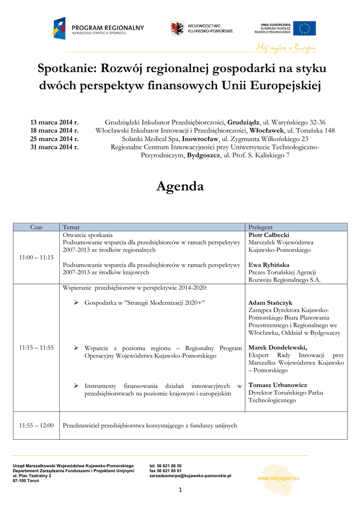 Spotkanie: Rozwój regionalnej gospodarki na styku dwóch perspektyw finansowych Unii Europejskiej 13 marca 2014 r. 18 marca 2014 r. 25 marca 2014 r. 31 marca 2014 r. Grudziądzki Inkubator Przedsiębiorczości, Grudziądz, ul. Waryńskiego 32-36 Włocławski Inkubator Innowacji i Przedsiębiorczości, Włocławek, ul. Toruńska 148 Solanki Medical Spa, Inowrocław, ul. Zygmunta Wilkońskiego 23 Regionalne Centrum Innowacyjności przy Uniwersytecie TechnologicznoPrzyrodniczym, Bydgoszcz, ul. Prof. S. Kaliskiego 7 Agenda Czas 11:00 – 11:15 Temat Otwarcie spotkania Podsumowanie wsparcia dla przedsiębiorców w ramach perspektywy 2007-2013 ze środków regionalnych Prelegent Piotr Całbecki Marszałek Województwa Kujawsko-Pomorskiego Podsumowanie wsparcia dla przedsiębiorców w ramach perspektywy 2007-2013 ze środków krajowych Ewa Rybińska Prezes Toruńskiej Agencji Rozwoju Regionalnego S.A. Wspieranie przedsiębiorstw w perspektywie 2014-2020: Gospodarka w ”Strategii Modernizacji 2020+” 11:15 – 11:55 Adam Stańczyk Zastępca Dyrektora KujawskoPomorskiego Biura Planowania Przestrzennego i Regionalnego we Włocławku, Oddział w Bydgoszczy Wsparcie z poziomu regionu – Regionalny Program Marek Dondelewski, Ekspert Rady Innowacji przy Operacyjny Województwa Kujawsko-Pomorskiego Marszałku Województwa Kujawsko – Pomorskiego Instrumenty finansowania działań innowacyjnych w Tomasz Urbanowicz Dyrektor Toruńskiego Parku przedsiębiorstwach na poziomie krajowym i europejskim Technologicznego 11:55 – 12:00 Przedstawiciel przedsiębiorstwa korzystającego z funduszy unijnych Urząd Marszałkowski Województwa Kujawsko-Pomorskiego Departament Zarządzania Funduszami i Projektami Unijnymi ul. Plac Teatralny 2 87-100 Toruń tel. 56 621 86 50 fax 56 621 85 01 [email protected] 1 12:00 – 12:15 Przerwa kawowa Mechanizmy i narzędzia wspierania przedsiębiorców: Instrumenty finansowe Poręczeniowe – Fundusze Pożyczkowe 12:15 – 12:45 i Przemysław Woliński Prezes Kujawsko-Pomorskiego Funduszu Pożyczkowy Sp. z o.o. Oferta instytucji otoczenia biznesu i tereny inwestycyjne dla Tomasz Urbanowicz Dyrektor Toruńskiego Parku przedsiębiorstw Technologicznego 12:45 – 12:50 Przedstawiciel przedsiębiorstwa korzystającego z oferty instytucji otoczenia biznesu Obsługa przedsiębiorstw w nowej perspektywie 2014-2020: 12:50 – 13:15 System obsługi przedsiębiorstw z wykorzystaniem ewaluacji Iwona Pietruszewska-Cetkowska Dyrektor Toruńskiej Agencji okresu 2007-2013 i badania przedsiębiorstw Rozwoju Regionalnego S.A. Ewa Rybińska Prezes Toruńskiej Agencji Rozwoju Regionalnego S.A. Dyskusja, wnioski, podsumowanie 13:15 Poczęstunek SERDECZNIE ZAPRASZAMY! Urząd Marszałkowski Województwa Kujawsko-Pomorskiego Departament Zarządzania Funduszami i Projektami Unijnymi ul. Plac Teatralny 2 87-100 Toruń tel. 56 621 86 50 fax 56 621 85 01 [email protected] 2