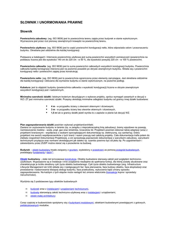SŁOWNIK I UNORMOWANIA PRAWNE Słownik Powierzchnia zabudowy: (wg. ISO 9836) jest to powierzchnia terenu zajęta przez budynek w stanie wykończonym. Wyznaczona jest przez rzut pionowy zewnętrznych krawędzi na powierzchnię terenu. Powierzchnia użytkowa: (wg. ISO 9836) jest to część powierzchni kondygnacji netto, która odpowiada celom i przeznaczeniu budynku. Określana jest oddzielnie dla każdej kondygnacji. Podawana w katalogach i Internecie powierzchnia użytkowa jest sumą powierzchni wszystkich pomieszczeń (powierzchnia na poddaszu liczona jest dla wysokości 140 cm do 220 cm - w 50 %, dla wysokości powyżej 220 cm - w 100 % powierzchni. Powierzchnia całkowita: (wg. ISO 9836) jest to suma powierzchni całkowitych wszystkich kondygnacji budynku. Powierzchnia całkowita każdej kondygnacji mierzona jest na poziomie posadzki po obrysie zewnętrznym budynku. Składa się z powierzchni kondygnacji netto i powierzchni zajętej przez konstrukcję. Powierzchnia netto: (wg. ISO 9836) jest to powierzchnia ograniczona przez elementy zamykające. Jest określana oddzielnie dla każdej kondygnacji i obliczana dla wymiarów budynku w stanie wykończonym, na poziomie podłogi. Kubatura: jest to objętość budynku (powierzchnia całkowita x wysokość kondygnacji) liczona w obrysie zewnętrznym wszystkich kondygnacji pod i nadziemnych. Minimalna szerokość działki: Istotnym kryterium decydującym o wyborze projektu, oprócz wymagań zawartych w decyzji o WZ i ZT jest minimalna szerokość działki. Przepisy określają minimalne odległości budynku od granicy innej działki budowlane: 4 m - w przypadku ściany z otworami okiennymi i drzwiowymi, 3 m - w przypadku ściany bez otworów okiennych i drzwiowych, 1,5 m lub w granicy działki jeżeli wynika to z zapisów w planie lub decyzji WZ. Plan zagospodarowania działki powinien wykonać projektant/architekt. Zawiera on usytuowanie budynku w terenie (np. w związku z nieprzekraczalną linią zabudowy), bramy wjazdowe na posesję, rozmieszczenie mediów - woda, prąd, gaz oraz śmietnika, krzaczków itd. Projektant powinien dokonać takiej adaptacji (wraz z projektami branżowymi - współpraca z osobami sporządzającymi dokumentację np. elektryczną, czy sanitarną). Dobry projektant ma swoich współpracowników z tych branż i razem pracują nad całością projektu. Cała dokumentacja trafia potem do Zakładu Uzgodnień Dokumentacji Projektowej, a oni sprawdzają poprawność dokumentacji z warunkami zabudowy, warunkami technicznymi przyłącza oraz normami określającymi jak daleko np. szambo powinno być od płotu itp. Po uzgodnieniach i zatwierdzeniu przez ZUDP można starać się o pozwolenie na budowę. Budynek – obiekt budowlany trwale związany z gruntem, wydzielony z przestrzeni za pomocą przegród budowlanych, posiadający fundamenty i dach[1]. Obiekt budowlany – stała lub tymczasowa konstrukcja. Obiekty budowlane stanowią całość pod względem technicznoużytkowym. Wyposażone są w instalacje i inne urządzenia niezbędne do spełniania funkcji, dla której zostały zbudowane oraz charakteryzuje je ściśle określony cykl życia obiektu budowlanego. Cykl życia obiektu budowlanego (ang. Infrastructure Lifecycle Management lub ILM) składa się z następujących faz: faza planowania, faza budowy obiektu, faza eksploatacji oraz prowadzenia i nadzorowania bieżącej obsługi budynku, faza przebudowy, wyburzenia bądź zmiany sposobu zagospodarowania. Na każdym z tych etapów może nastąpić też zmiana właściciela (transakcja kupna i sprzedaży nieruchomości). Wyróżnia się 3 podstawowe typy obiektów budowlanych • • • budynek wraz z instalacjami i urządzeniami technicznymi, budowlę stanowiącą całość techniczno-użytkową wraz z instalacjami i urządzeniami, obiekt małej architektury; Coraz częściej w budownictwie spotykamy się z budynkami modułowymi, obiektami budowlanymi powstającymi z gotowych, prefabrykowanych modułów. Unormowania prawne 1. Prawo wodne. Ustawa z dnia 18.07.2001r. 2. Prawo budowlane. Ustawa z dnia 07.07.1994r. (tekst jedn.: Dz. U. z 2006 r. Nr 156, poz. 1118 z późn. zm.). 3. Prawo ochrony środowiska. Ustawa z dnia 27.04.2001r. 4. Rozporządzenie Ministra Gospodarki Przestrzennej i Budownictwa z dnia 21.02.1995 r. w sprawie rodzaju i zakresu opracowań geodezyjno – kartograficznych oraz czynności geodezyjnych obowiązujących w budownictwie. 5. Rozporządzenie Ministra Rozwoju Regionalnego i Budownictwa z dnia 2.04.2001r. w sprawie geodezyjnej ewidencji sieci uzbrojenia terenu oraz zespołów uzgadniania dokumentacji projektowej. 6. Rozporządzenie Rady Ministrów z dnia 4 lipca 2000 r. w sprawie warunków i trybu udzielania kredytów i pożyczek ze środków KFM oraz niektórych wymagań dotyczących lokali i budynków finansowanych przy udziale tych środków ( Dz. U. Nr 62, poz. 719 oraz z 2001 r. Nr 116, poz. 1234 i Nr 154, poz. 1806 oraz Dz. U. Nr 86 poz. 803 z 2004 r.) 7. Ustawa z dnia 3.02.1995r. o ochronie gruntów rolnych i leśnych. 8. Ustawa z dnia 16 kwietnia 2004 r. o ochronie przyrody. 9. Rozporządzenie Ministra Gospodarki z dnia 30.07.2001r. w sprawie warunków technicznych, jakim powinny odpowiadać sieci gazowe. 10. Zarządzenie Ministra Łączności z dnia 2.09.1997r.w sprawie warunków, jakim powinny odpowiadać linie i urządzenia telekomunikacyjne oraz urządzenia do przesyłania płynów lub gazów w razie ich skrzyżowania się lub zbliżenia. 11. Rozporządzenie Ministra Infrastruktury z dnia 12.04.2002 r. w sprawie warunków technicznych, jakim powinny odpowiadać budynki i ich usytuowanie. (Dz. U. z 2002 r. Nr 75, poz. 690, z późn. zm.) 12. Rozporządzenie Ministra Infrastruktury z dnia 26.06.2003 r. w sprawie warunków i trybu postępowania dotyczącego rozbiórek oraz zmiany sposobu użytkowania obiektu budowlanego. 13. Rozporządzenie Ministra Transportu i Gospodarki Morskiej z dnia 2 marca 1999 r. technicznych sprawie warunków