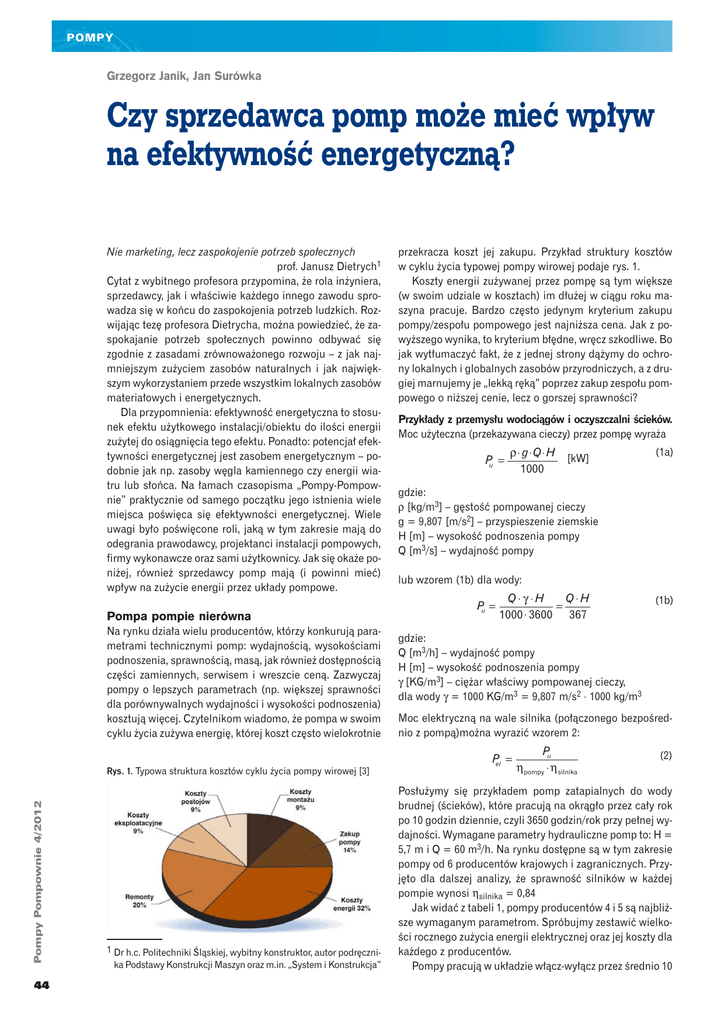 POMPY Grzegorz Janik, Jan Surówka Czy sprzedawca pomp mo˝e mieç wp∏yw na efektywnoÊç energetycznà? Nie marketing, lecz zaspokojenie potrzeb spo∏ecznych prof. Janusz Dietrych1 Cytat z wybitnego profesora przypomina, ˝e rola in˝yniera, sprzedawcy, jak i w∏aÊciwie ka˝dego innego zawodu sprowadza si´ w koƒcu do zaspokojenia potrzeb ludzkich. Rozwijajàc tez´ profesora Dietrycha, mo˝na powiedzieç, ˝e zaspokajanie potrzeb spo∏ecznych powinno odbywaç si´ zgodnie z zasadami zrównowa˝onego rozwoju – z jak najmniejszym zu˝yciem zasobów naturalnych i jak najwi´kszym wykorzystaniem przede wszystkim lokalnych zasobów materia∏owych i energetycznych. Dla przypomnienia: efektywnoÊç energetyczna to stosunek efektu u˝ytkowego instalacji/obiektu do iloÊci energii zu˝ytej do osiàgni´cia tego efektu. Ponadto: potencja∏ efektywnoÊci energetycznej jest zasobem energetycznym – podobnie jak np. zasoby w´gla kamiennego czy energii wiatru lub s∏oƒca. Na ∏amach czasopisma „Pompy-Pompownie” praktycznie od samego poczàtku jego istnienia wiele miejsca poÊwi´ca si´ efektywnoÊci energetycznej. Wiele uwagi by∏o poÊwi´cone roli, jakà w tym zakresie majà do odegrania prawodawcy, projektanci instalacji pompowych, firmy wykonawcze oraz sami u˝ytkownicy. Jak si´ oka˝e poni˝ej, równie˝ sprzedawcy pomp majà (i powinni mieç) wp∏yw na zu˝ycie energii przez uk∏ady pompowe. Pompa pompie nierówna Na rynku dzia∏a wielu producentów, którzy konkurujà parametrami technicznymi pomp: wydajnoÊcià, wysokoÊciami podnoszenia, sprawnoÊcià, masà, jak równie˝ dost´pnoÊcià cz´Êci zamiennych, serwisem i wreszcie cenà. Zazwyczaj pompy o lepszych parametrach (np. wi´kszej sprawnoÊci dla porównywalnych wydajnoÊci i wysokoÊci podnoszenia) kosztujà wi´cej. Czytelnikom wiadomo, ˝e pompa w swoim cyklu ˝ycia zu˝ywa energi´, której koszt cz´sto wielokrotnie Pompy Pompownie 4/2012 Rys. 1. Typowa struktura kosztów cyklu ˝ycia pompy wirowej [3] 44 1 Dr h.c. Politechniki Âlàskiej, wybitny konstruktor, autor podr´cznika Podstawy Konstrukcji Maszyn oraz m.in. „System i Konstrukcja” przekracza koszt jej zakupu. Przyk∏ad struktury kosztów w cyklu ˝ycia typowej pompy wirowej podaje rys. 1. Koszty energii zu˝ywanej przez pomp´ sà tym wi´ksze (w swoim udziale w kosztach) im d∏u˝ej w ciàgu roku maszyna pracuje. Bardzo cz´sto jedynym kryterium zakupu pompy/zespo∏u pompowego jest najni˝sza cena. Jak z powy˝szego wynika, to kryterium b∏´dne, wr´cz szkodliwe. Bo jak wyt∏umaczyç fakt, ˝e z jednej strony dà˝ymy do ochrony lokalnych i globalnych zasobów przyrodniczych, a z drugiej marnujemy je „lekkà r´kà” poprzez zakup zespo∏u pompowego o ni˝szej cenie, lecz o gorszej sprawnoÊci? Przyk∏ady z przemys∏u wodociàgów i oczyszczalni Êcieków. Moc u˝yteczna (przekazywana cieczy) przez pomp´ wyra˝a Pu = ρ ⋅ g⋅ Q⋅ H [kW] 1000 (1a) gdzie: ρ [kg/m3] – g´stoÊç pompowanej cieczy g = 9,807 [m/s2] – przyspieszenie ziemskie H [m] – wysokoÊç podnoszenia pompy Q [m3/s] – wydajnoÊç pompy lub wzorem (1b) dla wody: Pu = Q⋅γ ⋅H Q⋅H = 1000 ⋅ 3600 367 (1b) gdzie: Q [m3/h] – wydajnoÊç pompy H [m] – wysokoÊç podnoszenia pompy γ [KG/m3] – ci´˝ar w∏aÊciwy pompowanej cieczy, dla wody γ = 1000 KG/m3 = 9,807 m/s2 ⋅ 1000 kg/m3 Moc elektrycznà na wale silnika (po∏àczonego bezpoÊrednio z pompà)mo˝na wyraziç wzorem 2: Pel = Pu η pompy ⋅η silnika (2) Pos∏u˝ymy si´ przyk∏adem pomp zatapialnych do wody brudnej (Êcieków), które pracujà na okràg∏o przez ca∏y rok po 10 godzin dziennie, czyli 3650 godzin/rok przy pe∏nej wydajnoÊci. Wymagane parametry hydrauliczne pomp to: H = 5,7 m i Q = 60 m3/h. Na rynku dost´pne sà w tym zakresie pompy od 6 producentów krajowych i zagranicznych. Przyj´to dla dalszej analizy, ˝e sprawnoÊç silników w ka˝dej pompie wynosi ηsilnika = 0,84 Jak widaç z tabeli 1, pompy producentów 4 i 5 sà najbli˝sze wymaganym parametrom. Spróbujmy zestawiç wielkoÊci rocznego zu˝ycia energii elektrycznej oraz jej koszty dla ka˝dego z producentów. Pompy pracujà w uk∏adzie w∏àcz-wy∏àcz przez Êrednio 10 POMPY Tabela 1. Podstawowe dane techniczne i koszty zakupu pomp zatapialnych do Êcieków [2] Q m3/h H m ηpompy Pu kW Pel kW 1 2 3 4 5 6 64,00 66,60 68,85 62,00 62,28 64,00 6,00 6,52 6,94 5,67 5,99 6,30 0,587 0,544 0,439 0,6395 0,33 0,47 1,046 1,183 1,302 0,958 1,017 1,098 2,12 2,59 3,53 1,78 3,67 2,78 Koszt zakupu netto PLN 4.330 5.792 4.457 4.598 4.633 8.852 godzin dziennie, zatem nie wymagajà ˝adnej regulacji wydajnoÊci. U∏atwia to analiz´. Zu˝ycie energii elektrycznej w ciàgu roku Ea mo˝na wyraziç wzorem (3): Ea = Pel ⋅ τ [ kWh ] a (3) gdzie: τ = 3650 – iloÊç godzin pracy zespo∏u pompowego w roku oraz m3 Qa = Q ⋅ τ [ ] a (4) gdzie: Qa [m3/a] – iloÊç przepompowanej cieczy w ciàgu roku Wskaênik jednostkowego zu˝ycia energii na przepompowanie 1 m3 mo˝na wyraziç wzorem (5), [1]: el = Ea Qa [ kWh ] m3 (5) Tabela 2. Roczne koszty energii pompowania oraz wskaênik energoch∏onnoÊci dla ró˝nych producentów pomp zatapialnych do Êcieków o wybranych parametrach Produ- Qa cent m3/a numer Ea kWh/a 1 2 3 4 5 6 7.738 9.454 12.885 6.497 13.396 10.147 233.600 243.090 251.303 226.300 227.322 233.600 Roczne koszty energii PLN 4.256 5.200 7.087 3.573 7.368 5.581 % kosztów inwestycyjnych 98,29 89,78 159,01 77,71 159,03 63,05 Wskaênik energoch∏onnoÊci el kWh/m3 0,033 0,039 0,051 0,029 0,059 0,043 1 ηcałk1 − 1 ηcałk2 )⋅ τ [ kWh ] a 4 1 2 226.300 233.600 243.090 Ea Koszt % kWh/a energii kosztów PLN/rok inwestycyjnych 6.497 3.573 77,71 7.738 4.256 98,29 9.454 5.200 89,78 Wskaênik energoch∏onnoÊci eI kWh/m3 0,029 0,033 0,039 gdzie: ηca∏k1 = ηsilnika ◊ ηpompy1 – sprawnoÊç ca∏kowita zespo∏u pompowego przed wymianà pompy ηca∏k2 = ηsilnika ◊ ηpompy2 – sprawnoÊç ca∏kow