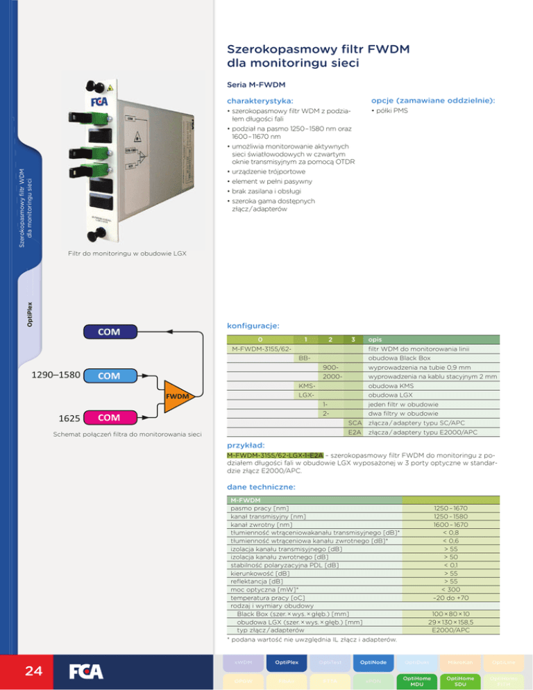 Szerokopasmowy filtr FWDM dla monitoringu sieci Seria M-FWDM charakterystyka: opcje (zamawiane oddzielnie): ĆŘszerokopasmowy filtr WDM z podziałem długości fali ĆŘpodział na pasmo 1250 – 1580 nm oraz 1600 – 11670 nm ĆŘpółki PMS Szerokopasmowy filtr WDM dla monitoringu sieci ĆŘumożliwia monitorowanie aktywnych sieci światłowodowych w czwartym oknie transmisyjnym za pomocą OTDR ĆŘurządzenie trójportowe ĆŘelement w pełni pasywny ĆŘbrak zasilana i obsługi ĆŘszeroka gama dostępnych złącz / adapterów OptiPlex OptiNode de Filtr do monitoringu w obudowie LGX konfiguracje: COM 0 1 2 3 opis M-FWDM-3155/62- filtr WDM do monitorowania linii BB- 1290–1580 obudowa Black Box wyprowadzenia na tubie 0,9 mm wyprowadzenia na kablu stacyjnym 2 mm 9002000- COM FWDM KMS- obudowa KMS LGX- obudowa LGX 1- 1625 jeden filtr w obudowie 2- COM dwa filtry w obudowie SCA złącza / adaptery typu SC/APC E2A Schemat połączeń filtra do monitorowania sieci złącza / adaptery typu E2000/APC przykład: M-FWDM-3155/62-LGX-1-E2A – szerokopasmowy filtr FWDM do monitoringu z podziałem długości fali w obudowie LGX wyposażonej w 3 porty optyczne w standardzie złącz E2000/APC. dane techniczne: M-FWDM pasmo pracy [nm] kanał transmisyjny [nm] kanał zwrotny [nm] tłumienność wtrąceniowakanału transmisyjnego [dB]* tłumienność wtrąceniowa kanału zwrotnego [dB]* izolacja kanału transmisyjnego [dB] izolacja kanału zwrotnego [dB] stabilność polaryzacyjna PDL [dB] kierunkowość [dB] reflektancja [dB] moc optyczna [mW]* temperatura pracy [oC] rodzaj i wymiary obudowy Black Box (szer. × wys. × głęb.) [mm] obudowa LGX (szer. × wys. × głęb.) [mm] typ złącz / adapterów 1250 – 1670 1250 – 1580 1600 – 1670 < 0,8 < 0,6 > 55 > 50 < 0,1 > 55 > 55 < 300 –20 do +70 100 × 80 × 10 29 × 130 × 158,5 E2000/APC * podana wartość nie uwzględnia IL złącz i adapterów. 24 xWDM OptiPlex OptiTest OptiNode OptiDukt MikroKan OptiLine OPGW FibAir FTTA xPON OptiHome MDU OptiHome SDU OptiHome FITH