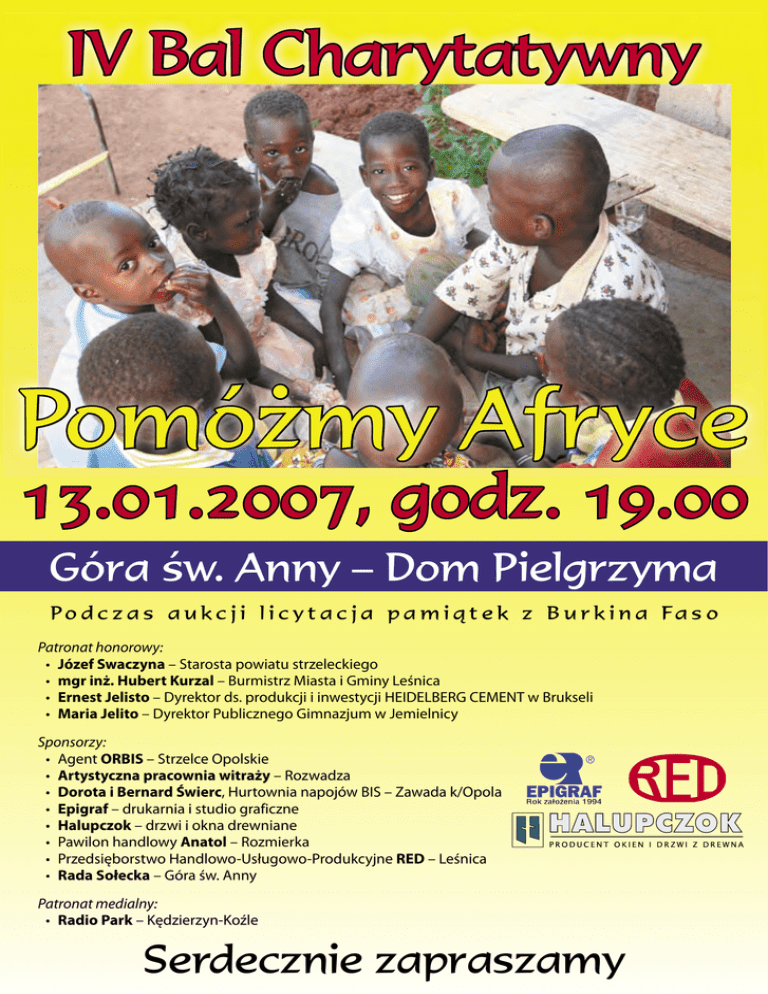IV Bal Charytatywny Pomóżmy Afryce 13.01.2007, godz. 19.00 Góra św. Anny – Dom Pielgrzyma Po d c z a s a u k c j i l i c y t a c j a p a m i ą t e k z B u r k i n a Fa s o Patronat honorowy: • Józef Swaczyna – Starosta powiatu strzeleckiego • mgr inż. Hubert Kurzal – Burmistrz Miasta i Gminy Leśnica • Ernest Jelisto – Dyrektor ds. produkcji i inwestycji HEIDELBERG CEMENT w Brukseli • Maria Jelito – Dyrektor Publicznego Gimnazjum w Jemielnicy Sponsorzy: • Agent ORBIS – Strzelce Opolskie • Artystyczna pracownia witraży – Rozwadza • Dorota i Bernard Świerc, Hurtownia napojów BIS – Zawada k/Opola • Epigraf – drukarnia i studio graficzne • Halupczok – drzwi i okna drewniane • Pawilon handlowy Anatol – Rozmierka • Przedsięborstwo Handlowo-Usługowo-Produkcyjne RED – Leśnica • Rada Sołecka – Góra św. Anny Patronat medialny: • Radio Park – Kędzierzyn-Koźle Serdecznie zapraszamy
