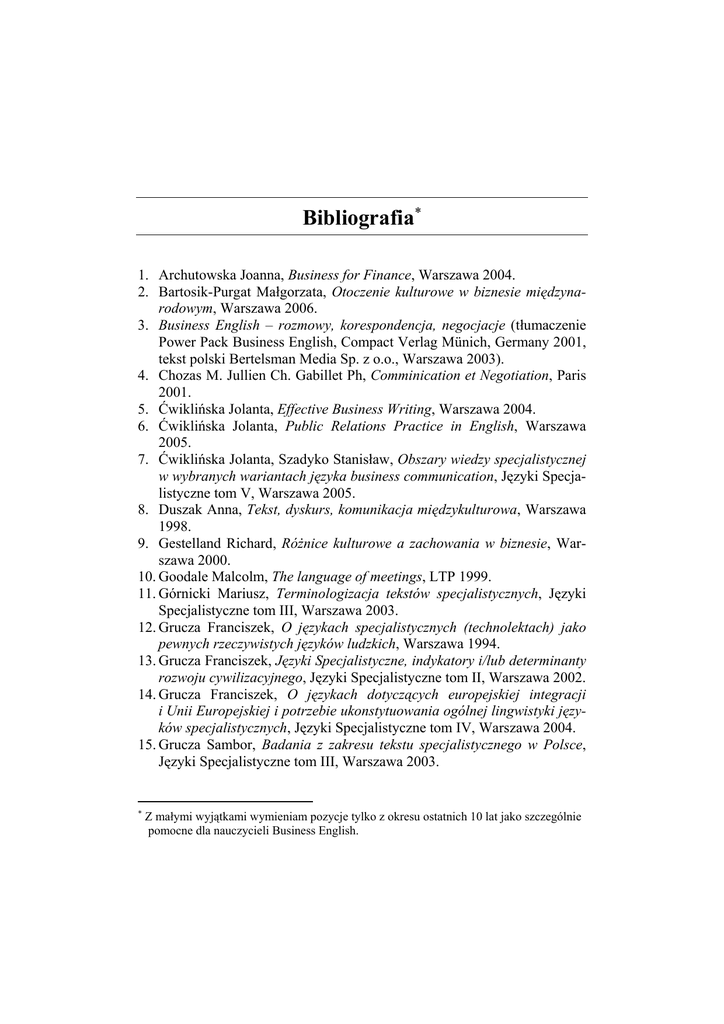 Bibliografia∗ 1. Archutowska Joanna, Business for Finance, Warszawa 2004. 2. Bartosik-Purgat Małgorzata, Otoczenie kulturowe w biznesie międzynarodowym, Warszawa 2006. 3. Business English – rozmowy, korespondencja, negocjacje (tłumaczenie Power Pack Business English, Compact Verlag Münich, Germany 2001, tekst polski Bertelsman Media Sp. z o.o., Warszawa 2003). 4. Chozas M. Jullien Ch. Gabillet Ph, Comminication et Negotiation, Paris 2001. 5. Ćwiklińska Jolanta, Effective Business Writing, Warszawa 2004. 6. Ćwiklińska Jolanta, Public Relations Practice in English, Warszawa 2005. 7. Ćwiklińska Jolanta, Szadyko Stanisław, Obszary wiedzy specjalistycznej w wybranych wariantach języka business communication, Języki Specjalistyczne tom V, Warszawa 2005. 8. Duszak Anna, Tekst, dyskurs, komunikacja międzykulturowa, Warszawa 1998. 9. Gestelland Richard, Różnice kulturowe a zachowania w biznesie, Warszawa 2000. 10. Goodale Malcolm, The language of meetings, LTP 1999. 11. Górnicki Mariusz, Terminologizacja tekstów specjalistycznych, Języki Specjalistyczne tom III, Warszawa 2003. 12. Grucza Franciszek, O językach specjalistycznych (technolektach) jako pewnych rzeczywistych języków ludzkich, Warszawa 1994. 13. Grucza Franciszek, Języki Specjalistyczne, indykatory i/lub determinanty rozwoju cywilizacyjnego, Języki Specjalistyczne tom II, Warszawa 2002. 14. Grucza Franciszek, O językach dotyczących europejskiej integracji i Unii Europejskiej i potrzebie ukonstytuowania ogólnej lingwistyki języków specjalistycznych, Języki Specjalistyczne tom IV, Warszawa 2004. 15. Grucza Sambor, Badania z zakresu tekstu specjalistycznego w Polsce, Języki Specjalistyczne tom III, Warszawa 2003. ∗ Z małymi wyjątkami wymieniam pozycje tylko z okresu ostatnich 10 lat jako szczególnie pomocne dla nauczycieli Business English. 16. Grucza Sambor, Od lingwistyki tekstu do lingwistyki tekstu specjalistycznego, Warszawa 2004. 17. Kornacka Małgorzata, Identyfikatory morfologiczne tekstów specjalistycznych, Języki Specjalistyczne tom III, Warszawa 2003. 18. Lewandowski Jan, Paratypologie i quazi-klasyfikacje polskich języków profesjonalnych, Języki Specjalistyczne tom II, Warszawa 2002. 19. Lukszyn Jerzy, Termin i system terminologiczny w świetle praktyki, Języki Specjalistyczne tom I, Warszawa 2001. 20. Lukszyn Jerzy, Uniwersalia tekstów specjalistycznych, Języki Specjalistyczne tom II, Warszawa 2002. 21. Lukszyn Jerzy, Parametry analizy tekstów specjalistycznych, Języki Specjalistyczne tom III, Warszawa 2003. 22. Lukszyn Jerzy, Zmarzer Wanda, Teoretyczne podstawy terminologii, Warszawa 2001. 23. Mamet Piotr, Relacja między kompetencją językową a kompetencją merytoryczną na przykładzie języka biznesu, Języki Specjalistyczne tom II, Warszawa 2002. 24. Marx Elisabeth, Przełamywanie szoku kulturowego, Warszawa 2000. 25. Michalik Urszula, Język Public Relations – kształtowanie pożądanych nawyków językowych w aspekcie poprawności językowej i skuteczności przekazu, Języki Specjalistyczne tom II, Warszawa 2002. 26. Mildner Piotr, Podstawy etykiety, czyli wiza do świata biznesu, Warszawa 2000. 27. Mullholland Joan, The Language of Negotiations, Sidney 1991. 28. Murdoch Anna, Prezentacje i wystąpienia, Warszawa 2000. 29. Murdoch Anna, Język Public Relations, 1998. 30. Neymann Monika, Ruhan Tom, Negocjujemy po angielsku – kultura, język, obyczaje, Warszawa 1995. 31. Neymann Monika, Bohdanowicz Janet, English for Promotion, Warszawa 2005. 32. Neymann Monika, Komunikacja werbalna i jej uwarunkowania kulturowe, w: Komunikacja i kultura biznesu w Europie, Zagadnienia wybrane, Warszawa 2005. 33. Pytel Waldemar, Identyfikatory semantyczne tekstów specjalistycznych, Języki Specjalistyczne tom III, Warszawa 2003. 34. Pytel Waldemar, Słownictwo fachowe jako identyfikator LSP, Języki Specjalistyczne tom IV, Warszawa 2004. 35. Słownik Terminologii Przedmiotowej, Warszawa 2005. 62 36. Zmarzer Wanda, Typologia tekstów specjalistycznych, Języki Specjalistyczne tom III, Warszawa 2003. Angielskie terminy biznesowe lub ich polskie odpowiedniki konsultowałam w razie potrzeby z następującymi słownikami z okresu ostatnich 10 lat: ◘ Niewiadoma Maria, Słownik menedżera część polsko-angielska i angielsko-polska, Wrocław 1996. ◘ Oxford Dictionary of Business English, 1996. ◘ Wróblewska Joanna, Dictionary of Finance and Insurance, Warszawa 2000. ◘ Słownik do podręcznika Power Pack Buisness English, Warszawa 2003. ◘ Słownik do podręcznika Archutowskiej Joanny English for Finance, Warszawa 2004. ◘ Neymann M., Bohdanowicz J. English for Promotion, Warszawa 2005 (przykłady metafor w Business English, np. “Clicks and Mortar”). 63