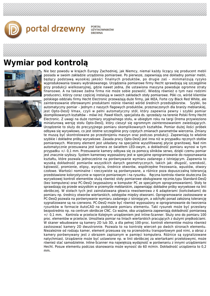 Wymiar pod kontrolą Nie bez powodu w krajach Europy Zachodniej, jak Niemcy, niemal każdy liczący się producent mebli posiada w swoim zakładzie urządzenia pomiarowe. Po pierwsze, zapewniają one dokładny pomiar mebli, będący podstawą wysokiej jakości finalnych produktów, po drugie zaś – minimalizują ryzyko wyprodukowania towaru wybrakowanego. Urządzenia pomiarowe firmy Hecht sprawdzają się szczególnie przy produkcji wielkoseryjnej, gdzie nawet jedna, źle ustawiona maszyna powoduje ogromne straty finansowe. A na takowe żadna firma nie może sobie pozwolić. Wiedzą również o tym nasi rodzimi producenci, którzy coraz częściej instalują w swoich zakładach stoły pomiarowe. Póki co, wśród klientów polskiego oddziału firmy Hecht Electronic przeważają duże firmy, jak IKEA, Forte czy Black Red White, ale zainteresowanie oferowanymi produktami rośnie również wśród średnich przedsiębiorstw. Szybki, bo automatyczny pomiar – Jednym z naszych flagowych produktów, przeznaczonych dla branży meblarskiej, jest Opto-DesQ Vmax, czyli w pełni automatyczny stół, który zapewnia pewny i szybki pomiar skomplikowanych kształtów – mówi inż. Paweł Kloch, specjalista ds. sprzedaży na terenie Polski firmy Hecht Electronic. Z uwagi na duże rozmiary oryginalnego stołu, w ubiegłym roku na targi Drema przywieziono miniaturową wersję stołu Opto-DesQ, który cieszył się ogromnym zainteresowaniem zwiedzających. Urządzenie to służy do precyzyjnego pomiaru skomplikowanych kształtów. Pomiar dużej ilości próbek odbywa się wyrywkowo, co jest istotne szczególnie przy częstych zmianach parametrów wiercenia. Zmiany te muszą być skontrolowane po przezbrojeniu maszyn oraz podczas produkcji. Zapewniają to właśnie szybkie i dokładne próby wyrywkowe. Zasada pracy Opto-DesQ jest inna niż w przypadku ręcznych stołów pomiarowych. Mierzony element jest układany na specjalnie wyszlifowanej płycie granitowej. Nad nim automatycznie przesuwana jest kamera ze światłem LED-owym, a dokładność pomiaru wynosi w tym przypadku +/- 0,1 mm. Przesuwanie kamery odbywa się za pomocą silników serwo, dzięki czemu pomiar jest znacznie szybszy. System kamerowy wyposażony jest w specjalne oprogramowanie do rozpoznawania kształtu, które pozwala jednocześnie na porównywanie wymiaru zadanego z istniejącym. Zapewnia to wysoką dokładność pomiarów wszystkich danych geometrycznych, takich jak: długość, szerokość, kątowość, promienie, elipsy, wycięcia, średnice otworów, współrzędne frezowania, wpustów, otwory czołowe. Wartości nominalne i rzeczywiste są porównywane, a różnice poza dopuszczalną tolerancją przedstawione kolorystycznie w raporcie pomiarowym i na rysunku. Ręczna kontrola równie skuteczna Do wyrywkowej kontroli elementów służą również stoły pomiarowe obsługiwane ręcznie,typu Standard-DesQ (bez komputera) oraz PC-DesQ (wyposażony w komputer PC ze specjalnym oprogramowaniem). Stoły te sprawdzają się przede wszystkim w przemyśle meblarskim, zapewniając dokładne próby wyrywkowe na linii obróbczej. W stołach tych jest zainstalowana głowica rewolwerowa z 6 adapterami (końcówkami) do pomiaru np. średnicy otworów wiertarskich, odstępów między otworami. Oprogramowanie zastosowane w PC-DesQ pozwala na porównywanie wymiaru zadanego z istniejącym, a odchyłki ponad założoną tolerancję sygnalizowane są na czerwono. PC-DesQ może być również wyposażony w oprogramowanie do tworzenia rysunków w formacie AutoCAD na podstawie pomiaru elementu. Taki rysunek może być przesłany bezpośrednio np. na centrum obróbcze CNC. Co ważne, oba urządzenia zapewniają dokładność pomiarową +/- 0,1 mm. Kontrola w przelocie Kolejnym urządzeniem jest Inline-Scanner. Służy ono do pomiaru 100 proc. elementów w przelocie. Umożliwia pomiar na liniach wiertarskich pracujących z dużymi prędkościami. W skaner wbudowane są kamery 2D lub 3D, a dla pełnej 100-proc. kontroli elementów można również zastosować kamery 2D dwustronnie. Pozwala to na kontrolę wierceń po dwóch stronach elementu. Niezależnie od rodzaju kamer, element przesuwa się na przenośniku transportowym pod nimi, a obraz z kamery porównywany jest z obrazem zapisanym w pamięci komputera. Różnice są sygnalizowane natychmiast. Urządzenie może być ustawione np. w linii obróbczej za wiertarkami przelotowymi, może również stać samodzielnie. Inline-Scanner ma największą wydajność w porównaniu z innymi urządzeniami Hecht. Posuw elementu podczas skanowania może wynosić do 60 m/min. Dokładność urządzenia to 0,2 mm.