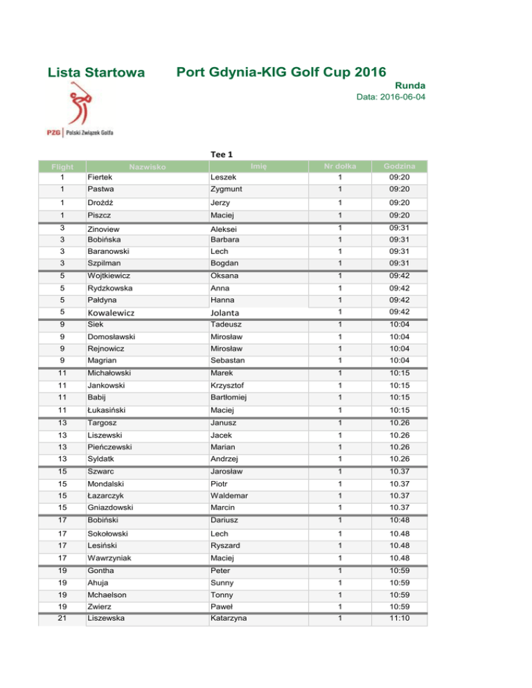 Lista Startowa Port Gdynia-KIG Golf Cup 2016 Runda Data: 2016-06-04 Tee 1 Imię Nr dołka 1 Godzina 09:20 Zygmunt 1 09:20 Drożdż Jerzy 1 09:20 1 Piszcz Maciej 1 09:20 3 Aleksei Barbara 1 09:31 3 Zinoview Bobińska 1 09:31 3 Baranowski Lech 1 09:31 3 Szpilman Bogdan 1 09:31 5 Wojtkiewicz Oksana 1 09:42 5 Rydzkowska Anna 1 09:42 5 Pałdyna Hanna 1 09:42 5 Kowalewicz Jolanta 1 09:42 9 Siek Tadeusz 1 10:04 9 Domosławski Mirosław 1 10:04 9 Rejnowicz Mirosław 1 10:04 Flight 1 Nazwisko Fiertek Leszek 1 Pastwa 1 9 Magrian Sebastan 1 10:04 11 Michałowski Marek 1 10:15 11 Jankowski Krzysztof 1 10:15 11 Babij Bartłomiej 1 10:15 11 Łukasiński Maciej 1 10:15 13 Targosz Janusz 1 10.26 13 Liszewski Jacek 1 10.26 13 Pieńczewski Marian 1 10.26 13 Syldatk Andrzej 1 10.26 15 Szwarc Jarosław 1 10.37 15 Mondalski Piotr 1 10.37 15 Łazarczyk Waldemar 1 10.37 15 Gniazdowski Marcin 1 10.37 17 Bobiński Dariusz 1 10:48 17 Sokołowski Lech 1 10.48 17 Lesiński Ryszard 1 10.48 17 Wawrzyniak Maciej 1 10.48 19 Gontha Peter 1 10:59 19 Ahuja Sunny 1 10:59 19 Mchaelson Tonny 1 10:59 19 Zwierz Paweł 1 10:59 21 Liszewska Katarzyna 1 11:10 21 Ciesiołkiewicz Jacek 1 11:10 21 Huniewicz Sławomir 1 11:10 23 Śmigielski Zygmunt 1 11:21 23 Czaplewski Dariusz 1 11:21 23 Szrubkowska Małgorzata 1 11:21 2 Koss Dariusz 10 09:20 2 Kisielewski Bogdan 10 09:20 2 Flont Maciej 10 09:20 2 Bagiński Andrzej 10 09:20 4 Wilski Marcin 10 09:31 4 Judycka-Muszyńska Anna 10 09:31 4 Jankowski Tymoteusz 10 09:31 4 Czajko Tomasz 10 09:31 6 Polh Leszek 10 09:42 6 Trzosiński Jacek 10 09:42 6 Wilski Krzysztof 10 09:42 6 Kamiński Marek 10 09:42 8 Czuczman Jerzy 10 10:53 8 Konopka Henryk 10 10:53 8 Niedziłóka Zbigniew 10 10:53 8 Gniadecki Sergiusz 10 10:53 10 Janik Andrzej 10 10:04 10 Domosławska Beata 10 10:04 10 Piszcz Halina 10 10:04 10 Krzysztof Kubów 10 10:04 12 Michałowska Bożena 10 10:15 12 Kisielewski Ute 10 10:15 12 Czuczman Elżbieta 10 10:15 12 Wróblewska Agnieszka 10 10:15 14 Więcek Marek 10 10:26 14 Polz Piotr 10 10:26 14 Kwiecień Sławomir 10 10:26 14 Wierciński Antoni 10 10:26