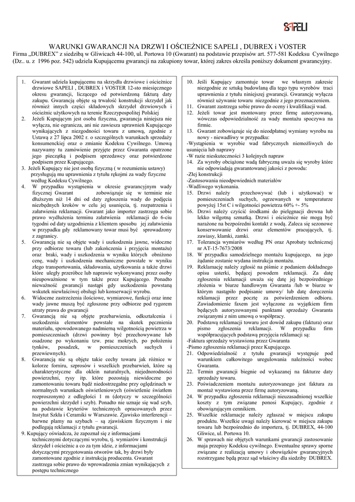WARUNKI GWARANCJI NA DRZWI I OŚCIEŻNICE SAPELI , DUBREX i VOSTER Firma „DUBREX” z siedzibą w Gliwicach 44-100, ul. Portowa 10 (Gwarant) na podstawie przepisów art. 577-581 Kodeksu Cywilnego (Dz.. u. z 1996 poz. 542) udziela Kupującemu gwarancji na zakupiony towar, której zakres określa poniższy dokument gwarancyjny. 1. Gwarant udziela kupującemu na skrzydła drzwiowe i ościeżnice drzwiowe SAPELI , DUBREX i VOSTER 12-sto miesięcznego okresu gwarancji, liczącego od potwierdzoną fakturą daty zakupu. Gwarancją objęte są trwałość konstrukcji skrzydeł jak również innych części składowych skrzydeł drzwiowych i ościeżnic użytkowych na terenie Rzeczypospolitej Polskiej 2. Jeżeli Kupującym jest osoba fizyczna, gwarancja niniejsza nie wyłącza, nie ogranicza, ani nie zawiesza uprawnień Kupującego wynikających z niezgodności towaru z umową, zgodnie z Ustawą z 27 lipca 2002 r. o szczególnych warunkach sprzedaży konsumenckiej oraz o zmianie Kodeksu Cywilnego. Umową nazywamy tu zamówienie przyjęte przez Gwaranta opatrzone jego pieczątką i podpisem sprzedawcy oraz potwierdzone podpisem przez Kupującego. 3. Jeżeli Kupujący nie jest osobą fizyczną ( w rozumieniu ustawy) przysługują mu uprawnienia z tytułu rękojmi za wady fizyczne według Kodeksu Cywilnego. 4. W przypadku wystąpienia w okresie gwarancyjnym wady fizycznej Gwarant zobowiązuje się w terminie nie dłuższym niż 14 dni od daty zgłoszenia wady do podjęcia niezbędnych kroków w celu jej usunięcia, tj. rozpatrzenia i załatwienia reklamacji. Gwarant jako importer zastrzega sobie prawo wydłużenia terminu załatwienia reklamacji do 6-ciu tygodni od daty uzgodnienia z klientem sposobu jej załatwienia w przypadku gdy reklamowany towar musi być sprowadzony z zagranicy. 5. Gwarancją nie są objęte wady i uszkodzenia jawne, widoczne przy odbiorze towaru (lub zakończenia i przyjęcia montażu) oraz braki, wady i uszkodzenia w wyniku których obniżono cenę, wady i uszkodzenia mechaniczne powstałe w wyniku złego transportowania, składowania, użytkowania a także drzwi które uległy przeróbce lub naprawie wykonywanej przez osoby nieupoważnione w tym także przez Kupującego. Ponadto nieważność gwarancji nastąpi gdy uszkodzenia powstaną wskutek niewłaściwej obsługi lub konserwacji wyrobu. 6. Widoczne zastrzeżenia ilościowe, wymiarowe, funkcji oraz inne wady jawne muszą być zgłoszone przy odbiorze pod rygorem utraty prawa do gwarancji 7. Gwarancją nie są objęte przebarwienia, odkształcenia i uszkodzenia elementów powstałe na skutek pęcznienia materiału, spowodowanego nadmierną wilgotnością powietrza w pomieszczeniach (drzwi powinny być przechowywane lub osadzone po wykonaniu tzw. prac mokrych, po położeniu tynków, posadzek, w pomieszczeniach suchych i przewiewnych). 8. Gwarancją nie są objęte takie cechy towaru jak różnice w kolorze forniru, szprosów i wszelkich przebarwień, które są charakterystyczne dla oklein naturalnych, niejednorodności powierzchni, rysy itp. które pozostają niewidoczne po zamontowaniu towaru bądź niedostrzegalne przy oględzinach w normalnych warunkach oświetleniowych (oświetlenie światłem rozproszonym) z odległości 1 m (dotyczy w szczególności powierzchni skrzydeł i szyb). Ponadto nie uznaje się wad szyb, na podstawie kryteriów technicznych opracowanych przez Instytut Szkła i Ceramiki w Warszawie. Zjawisko interferencji – barwne plamy na szybach – są zjawiskiem fizycznym i nie podlegają reklamacji z tytułu gwarancji. 9. Kupujący oświadcza, że zapoznał się z informacjami technicznymi dotyczącymi wyrobu, tj. wymiarów i konstrukcji skrzydeł i ościeżnic a co za tym idzie, z informacjami dotyczącymi przygotowania otworów tak, by drzwi były zamontowane zgodnie z instrukcją producenta. Gwarant zastrzega sobie prawo do wprowadzenia zmian wynikających z postępu technicznego 10. Jeśli Kupujący zamontuje towar we własnym zakresie niezgodnie ze sztuką budowlaną dla tego typu wyrobów traci uprawnienia z tytułu niniejszej gwarancji. Gwarancję wyłącza również używanie towaru niezgodnie z jego przeznaczeniem. 11. Gwarant zastrzega sobie prawo do oceny i kwalifikacji wad. 12. Jeżeli towar jest montowany przez firmę autoryzowaną, wówczas odpowiedzialność za wady montażu spoczywa na firmie. 13. Gwarant zobowiązuje się do nieodpłatnej wymiany wyrobu na nowy - niewadliwy w przypadku: -Wystąpienia w wyrobie wad fabrycznych niemożliwych do usunięcia lub naprawy -W razie nieskuteczności 3 kolejnych napraw 14. Za wyroby obciążone wadą fabryczną uważa się wyroby które nie odpowiadają gwarantowanej jakości z powodu: -Złej konstrukcji -Zastosowania nieodpowiednich materiałów -Wadliwego wykonania. 15. Drzwi należy przechowywać (lub i użytkować) w pomieszczeniach suchych, ogrzewanych w temperaturze powyżej 15st C i wilgotności powietrza 60% +- 5% 16. Drzwi należy czyścić środkami do pielęgnacji drewna lub lekko wilgotną szmatką. Drzwi i ościeżnice nie mogą być narażone na bezpośredni kontakt z wodą. Zaleca się sezonowe konserwowanie drzwi oraz elementów pracujących, tj. zawiasy, klamki, zamki. 17. Tolerancja wymiarów według PN oraz Aprobaty technicznej nr AT-15-7673/2008 18. W przypadku samodzielnego montażu kupującego, na jego żądanie zostanie wydana instrukcja montażu. 19. Reklamację należy zgłosić na piśmie z podaniem dokładnego opisu usterki, będącej powodem reklamacji. Za datę zgłoszenia reklamacji uważa się datę jej bezpośredniego złożenia w biurze handlowym Gwaranta /lub w biurze w którym nastąpiło podpisanie umowy/ lub datę doręczenia reklamacji przez pocztę za potwierdzeniem odbioru. Zawiadomienie faxem jest wyłączone za wyjątkiem firm będących autoryzowanymi punktami sprzedaży Gwaranta związanymi z nim umową o współpracy. 20. Podstawą reklamacji towaru jest dowód zakupu (faktura) oraz pismo zgłos