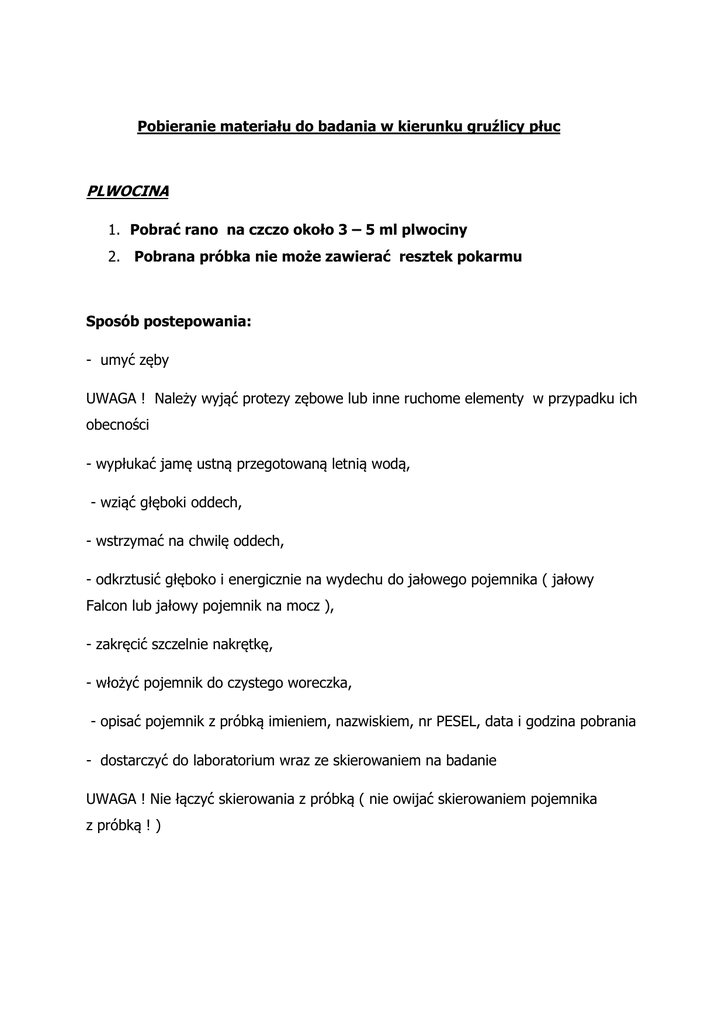 Pobieranie materiału do badania w kierunku gruźlicy płuc PLWOCINA 1. Pobrać rano na czczo około 3 – 5 ml plwociny 2. Pobrana próbka nie może zawierać resztek pokarmu Sposób postepowania: - umyć zęby UWAGA ! Należy wyjąć protezy zębowe lub inne ruchome elementy w przypadku ich obecności - wypłukać jamę ustną przegotowaną letnią wodą, - wziąć głęboki oddech, - wstrzymać na chwilę oddech, - odkrztusić głęboko i energicznie na wydechu do jałowego pojemnika ( jałowy Falcon lub jałowy pojemnik na mocz ), - zakręcić szczelnie nakrętkę, - włożyć pojemnik do czystego woreczka, - opisać pojemnik z próbką imieniem, nazwiskiem, nr PESEL, data i godzina pobrania - dostarczyć do laboratorium wraz ze skierowaniem na badanie UWAGA ! Nie łączyć skierowania z próbką ( nie owijać skierowaniem pojemnika z próbką ! )