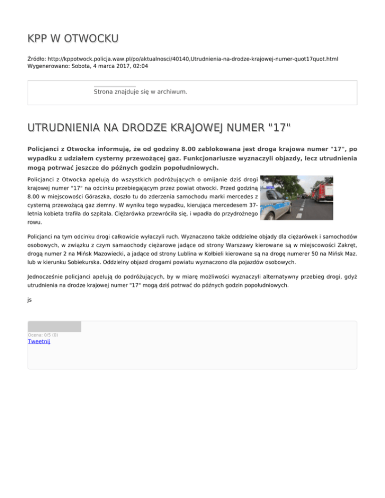 KPP W OTWOCKU Źródło: http://kppotwock.policja.waw.pl/po/aktualnosci/40140,Utrudnienia-na-drodze-krajowej-numer-quot17quot.html Wygenerowano: Sobota, 4 marca 2017, 02:04 Strona znajduje się w archiwum. UTRUDNIENIA NA DRODZE KRAJOWEJ NUMER "17" Policjanci z Otwocka informują, że od godziny 8.00 zablokowana jest droga krajowa numer "17", po wypadku z udziałem cysterny przewożącej gaz. Funkcjonariusze wyznaczyli objazdy, lecz utrudnienia mogą potrwać jeszcze do późnych godzin popołudniowych. Policjanci z Otwocka apelują do wszystkich podróżujących o omijanie dziś drogi krajowej numer "17" na odcinku przebiegającym przez powiat otwocki. Przed godziną 8.00 w miejscowości Góraszka, doszło tu do zderzenia samochodu marki mercedes z cysterną przewożącą gaz ziemny. W wyniku tego wypadku, kierująca mercedesem 37letnia kobieta trafiła do szpitala. Ciężarówka przewróciła się, i wpadła do przydrożnego rowu. Policjanci na tym odcinku drogi całkowicie wyłaczyli ruch. Wyznaczono także oddzielne objady dla ciężarówek i samochodów osobowych, w związku z czym samaochody ciężarowe jadące od strony Warszawy kierowane są w miejscowości Zakręt, drogą numer 2 na Mińsk Mazowiecki, a jadące od strony Lublina w Kołbieli kierowane są na drogę numerer 50 na Mińsk Maz. lub w kierunku Sobiekurska. Oddzielny objazd drogami powiatu wyznaczono dla pojazdów osobowych. Jednocześnie policjanci apelują do podróżujących, by w miarę możliwości wyznaczyli alternatywny przebieg drogi, gdyż utrudnienia na drodze krajowej numer "17" mogą dziś potrwać do późnych godzin popołudniowych. js Ocena: 0/5 (0) Tweetnij