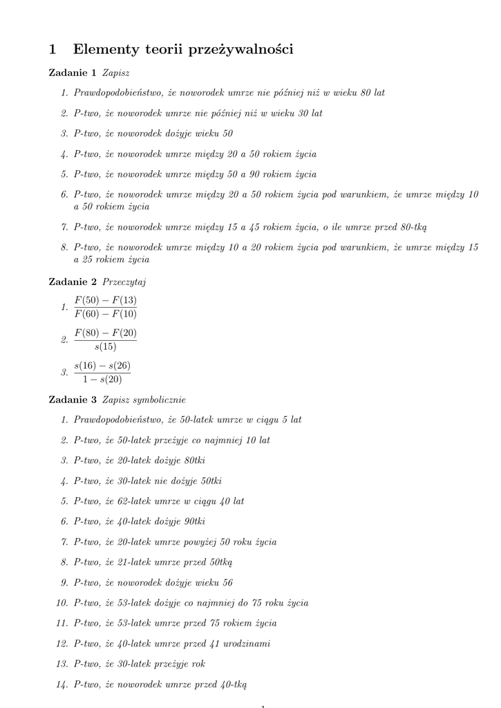 1 Elementy teorii przeżywalności Zadanie 1 Zapisz 1. Prawdopodobieństwo, że noworodek umrze nie później niż w wieku 80 lat 2. P-two, że noworodek umrze nie później niż w wieku 30 lat 3. P-two, że noworodek dożyje wieku 50 4. P-two, że noworodek umrze między 20 a 50 rokiem życia 5. P-two, że noworodek umrze między 50 a 90 rokiem życia 6. P-two, że noworodek umrze między 20 a 50 rokiem życia pod warunkiem, że umrze między 10 a 50 rokiem życia 7. P-two, że noworodek umrze między 15 a 45 rokiem życia, o ile umrze przed 80-tką 8. P-two, że noworodek umrze między 10 a 20 rokiem życia pod warunkiem, że umrze między 15 a 25 rokiem życia Zadanie 2 Przeczytaj 1. F (50) − F (13) F (60) − F (10) 2. F (80) − F (20) s(15) 3. s(16) − s(26) 1 − s(20) Zadanie 3 Zapisz symbolicznie 1. Prawdopodobieństwo, że 50-latek umrze w ciągu 5 lat 2. P-two, że 50-latek przeżyje co najmniej 10 lat 3. P-two, że 20-latek dożyje 80tki 4. P-two, że 30-latek nie dożyje 50tki 5. P-two, że 62-latek umrze w ciągu 40 lat 6. P-two, że 40-latek dożyje 90tki 7. P-two, że 20-latek umrze powyżej 50 roku życia 8. P-two, że 21-latek umrze przed 50tką 9. P-two, że noworodek dożyje wieku 56 10. P-two, że 53-latek dożyje co najmniej do 75 roku życia 11. P-two, że 53-latek umrze przed 75 rokiem życia 12. P-two, że 40-latek umrze przed 41 urodzinami 13. P-two, że 30-latek przeżyje rok 14. P-two, że noworodek umrze przed 40-tką 15. P-two, że 50-latek umrze w ciągu roku 16. P-two, że 4-latek dożyje 5-go roku życia 17. P-two, że 20-latek przeżyje 5 lat, ale umrze w ciągu następnych dwóch lat 18. P-two, że 50-latek przeżyje 10 lat, a następnie umrze w przeciągu 3 lat 19. P-two, że 30-latek przeżyje następnych 30 lat, ale nie przekroczy 80-tki 20. P-two, że 13-latek przeżyje 10 lat, ale umrze w ciągu roku Zadanie 4 Zapisz na trzy sposoby (przy użyciu p, s, F ) 1. P-two, że 60-latek przeżyje następnych 30 lat a następnie umrze w ciągu 3 lat 2. P-two, że 20-latek przeżyje 8 lat a następnie umrze w przeciągu 10 lat 3. P-two, że 16-latek przeżyje 60 lat a następnie umrze w ciągu roku 4. P-two, że 16-latek dożyje 60-tki a następnie umrze w ciągu roku √ 1 Zadanie 5 Funkcja przeżycia dana jest wzorem s(x) = 10 100 − x dla x ∈ [0, 100]. Oblicz 1. P-two, że noworodek umrze między 46 a 75 rokiem życia 2. P-two, że 20-latek nie dożyje 50-tki 3. P-two, że 46-latek nie przeżyje kolejnych pięciu lat 4. P-two, że 19-latek umrze przed 64 rokiem życia 5. P-two, że 46-latek dożyje wieku 75 lat 6. P-two, że 21-latek dożyje wieku 40 lat i umrze przed ukończeniem 57 roku życia. Hipoteza jednostajnej umieralności w ciągu roku (UDD) (w książce Błaszczyszyna Rolskiego (HU)). Zakładamy, że rozkład zgonów między całkowitymi liczbami lat jest równomierny. Zakładamy: s(x + t) = (1 − t) · s(x) + t · s(x + 1) gdzie t ∈ [0, 1) i x = 0, 1, 2.... Zadanie 6 Przy założeniu (UDD) wyznaczyć wzór na t qx oraz t px . Zadanie 7 Zakładając (UDD) obliczyć prawdopodobieństwo, że siedemdziesięciolatek umrze między 70,5 a 71,5 rokiem życia, jeżeli q70 = 0, 04, q71 = 0, 05. Zadanie 8 Niech qx = 0, 0559 oraz qx+1 = 0, 0602. Zakładając (UDD) obliczyć prawdopodobieństwo warunkowe, że (x)-latek przeżyje 1,2 roku pod warunkiem, że dożyje x + 0, 5 roku. Zadanie 9 Przyjmując założenie (UDD) wyznacz 0,5|0,3 qx+0,4 , gdy px = 0, 989, px+1 = 0, 986. Zadanie 10 Niech px = 0, 989 oraz px+1 = 0, 987. Przyjmując założenie (UDD) oblicz 1. 0,5|0,8 qx 2. 0,7|0,6 qx 3. 0,6 px+0,7 Zadanie 11 Niech qx = 0, 088 oraz px+1 = 0, 903. Przyjmując założenie (UDD) oblicz 1,5 qx+0,2 . Zadanie 12 Przyjmując hipotezę jednostajnej umieralności obliczyć prawdopodobieństwo, że osoba w wieku 85 lat umrze między 85,5 a 86,5 rokiem życia wiedząc, że q85 = 0, 14921 oraz q86 = 0, 16029. ◦ Funkcja intensywności wymierania µ, wskaźnik przyszłej długości życia ex (przeciętne dalsze trwanie życia) oraz przeciętne całkowite dalsze trwanie życia ex µx = f (x) F 0 (x) (1 − s(x))0 −s(x)0 = = = = (− ln s(x))0 s(x) s(x) s(x) s(x) x+t − t px = e ◦ ex = E(Tx ) = Z∞ R µy dy x t px dt = 0 ex = E(Kx ) = ∞ X ω−x Z t px dt 0 k+1 px = k=0 ω−x−1 X k+1 px k=0 Zadanie 13 Przyszły czas życia noworodka ma rozkład wykładniczy z parametrem 0,01. Obliczyć: 1. Prawdopodobieństwo śmierci nie później niż w 45 roku życia 2. P-two dożycia 80 lat a kolejno śmierci w ciągu roku 3. P-two śmierci między 45 a 80 rokiem życia Zadanie 14 Znaleźć lt , jeśli l0 = 1000 i µ = at. Zadanie 15 Funkcja przeżycia dana jest wzorem s(x) = 1. 17 p19 2. 15|13 q36 1 10 √ 100 − x dla x ∈ [0, 100]. Oblicz 3. f (36) 4. µ50 5. E(X) Zadanie 16 Funkcja intensywności wymierania dana jest wzorem µx+t = 1 85−t + 3 . 105−t Oblicz 1. P (Tx > 20) 2. 30 px Zadanie 17 Wiedząc, że dla danej populacji z wiekiem granicznym 100 funkcja intensywności wy2 1 mierania dana jest wzorem µx = 100−x − 240−x dla x ∈ (0, 100). Oblicz prawdopodobieństwo, że 40 letnia osoba umrze między 55 a 74 rokiem życia. Zadanie 18 W populacji z wiekiem granicznym 110 funkcja natężenia wymierania populacji dana 2 jest wzorem µx = 110−x dla x > 0. Wyznaczyć przeciętne trwanie życia 50-letniej osoby z tej populacji. 1 Zadanie 19 W populacji A intensywność zgonów jest dana wzorem µA z = 100−x dla x < 100, a w n populacji B wzorem µB x = 100−x dla x < 100, gdzie n jest parametrem. Wiadomo ponadto, że ludzie z populacji A mają przed sobą przeciętnie o 10% więcej życia, niż ludzie z B w tym samym wieku. Oblicz n. Zadanie 20 Funkcja µx = 0, 01x opisuje natężenie zgonów. Oblicz prawdopodobieństwo, że osoba obecnie w wieku 45 lat umrze między 55 a 75 rokiem życia. √ Zadanie 21 Wiadomo, że przeciętna liczba dożywających wieku x lx = 121 − x dla x ∈ [0, 121]. Obliczyć prawdopodobieństwo, że 21-latek dożyje 