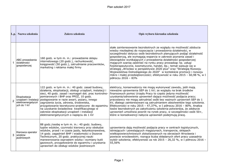 Plan szkoleń 2017 L.p. Nazwa szkolenia ABC prowadzenia 1 działalności gospodarczej Zakres szkolenia 160 godz. w tym m. in.: prowadzenie sklepu internetowego (20 godz.), rachunkowość, księgowość (50 godz.), zatrudnianie pracowników, marketing i reklama małej firmy 122 godz. w tym m. in.: 40 godz. zasad budowy, działania, eksploatacji, obsługi urządzeń, instalacji i sieci, 40 godz. zasad i wymagań dot. prac kontrolnopomiarowych i BHP oraz PPOŻ, 10 godz. Eksploatacja urządzeń i instalacji postępowanie w razie awarii, pożaru, innego 2 elektroenergetyczn zagrożenia życia, zdrowia, środowiska, ych do 1 kV przygotowanie teoretyczno-praktyczne do egzaminu na uzyskanie świadectwa kwalifikacyjnego w zakresie eksploatacji urządzeń i instalacji elektroenergetycznych o napięciu do 1 kV Kierowca operator 3 wózków jezdniowych 88 godz./osobę w tym m. in.: 40 godz. budowy, typów wózków, czynności kierowcy przy obsłudze wózków, przed i w czasie jazdy, ładunkoznawstwa, 14 godz. zagadnień BHP i wiadomości o Dozorze Technicznym, 20 godz. praktycznej nauki manewrowania osprzętem wózka i wymiany butli gazowych, przygotowanie do egzaminu i uzyskania uprawnień do obsługi wózków jezdniowych Opis wyboru kierunku szkolenia stałe zainteresowanie bezrobotnych ze względu na możliwość zdobycia wiedzy niezbędnej do rozpoczęcia i prowadzenia działalności, w szczególności dotyczy osób bezrobotnych planujących podjąć działalność gospodarczą, ale wymagają wsparcia w zakresie poznania zasad i obowiązków wynikających z prowadzenia działalności gospodarczej mających szansę zaistnieć na rynku pracy prowadząc np. usługi fizjoterapeutyczne, kosmetyczne, handel, itp.; temat wpisuje się w strategię „Wrocław w perspektywie 2020 plus” oraz "Strategię Rozwoju Województwa Dolnośląskiego do 2020" w kontekście promocji i rozwoju mikro i małej przedsiębiorczości; efektywność w roku 2015 – 60,98 %, w I półroczu 2016 – 83% elektrycy, konserwatorzy nie mogą wykonywać zawodu, jeśli mają nieważne uprawnienia SEP do 1 kV; ze względu na brak środków finansowych pomoc Urzędu Pracy to często jedyna możliwość uzyskania/odnowienia uprawnień dająca możliwość podjęcia pracy; pracodawcy nie mogą zatrudniać osób bez ważnych uprawnień SEP do 1 kV, dlatego zainteresowani są zatrudnianiem absolwentów tego szkolenia. Efektywności w roku 2015 – 47,37%, w I półroczu 2016 – 80%. Analiza losów bezrobotnych po zakończeniu szkolenia potwierdza, że zdobycie uprawnień umożliwia powrót na rynek pracy, w szczególności osób 50+, które w konsekwencji nabycia uprawnień podejmują pracę. uprawnienia dają możliwość podjęcia pracy w centrach logistycznych, istniejących i powstających magazynach, transporcie, sklepach wielkopowierzchniowych zlokalizowanych na obrzeżach Wrocławia i powiecie wrocławskim; rosnąca liczba składanych ofert pracy uzasadnia wybór szkolenia; efektywność za rok 2015 – 26,32 %, w I półroczu 2016 – 55,56% Page 1 Plan szkoleń 2017 Obsługa obrabiarek sterowanych numerycznie +4tygodniowa 4 praktyka u pracodawcy (w pełnym wymiarze czasu pracy) 384 godz. w tym m. in.: 80 godz. nauki obsługi komputera, 100 godz. obsługi obrabiarek sterowanych numerycznie, nauki czytania rys. technicznego, 40 godz. blok językowy – j. angielskiego, 160 godz. praktyki u pracodawcy operator obrabiarek sterowanych numerycznie to zawód, który od kilku lat cieszy się ogromnym powodzeniem wśród pracodawców i bezrobotnych, o czym świadczy wysoka efektywność szkolenia w 2015r. - 76,47 % nowoczesne technologie wymuszają przygotowanie osób do nowych 59 godzin szkolenia przygotowującego do egzaminu zawodów; najszybszą pozaszkolną formą przygotowania do zawodu są Tester 5 oprogramowania z (1 godzina) pozwalającego uzyskać międzynarodowy szkolenia specjalistyczne; na polskim rynku szkoleniowym są instytucje egzaminem ISTQB certyfikat ISTQB prowadzące profesjonalne szkolenia kończące się uzyskaniem uprawnień międzynarodowych honorowanych w branży IT 80 godzinne szkolenie kierowane jest do osób, które mają problem z autoprezentacją, umiejętnością przedstawienia swej kandydatury pracodawcy, Szkolenie z pomimo posiadanych kwalifikacji czy umiejętności; zakresu 6 umiejętności podczas zajęć z doradcą zawodowym Kursanci uczą poszukiwania pracy się rozmawiania z pracodawcami, przygotowywania dokumentów aplikacyjnych, wyszukiwania ofert pracy odpowiednich do swych możliwości i kwalifikacji szkolenie jest wpisane w zadania Powiatowego Urzędu Pracy, nie jest nastawione na uzyskiwanie efektywności lecz wspieranie Bezrobotnych chcących powrócić na rynek pracy Page 2