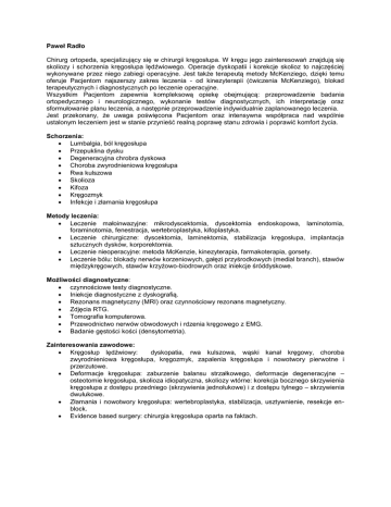 Paweł Radło Chirurg ortopeda, specjalizujący się w chirurgii kręgosłupa. W kręgu jego zainteresowań znajdują się skoliozy i schorzenia kręgosłupa lędźwiowego. Operacje dyskopatii i korekcje skolioz to najczęściej wykonywane przez niego zabiegi operacyjne. Jest także terapeutą metody McKenziego, dzięki temu oferuje Pacjentom najszerszy zakres leczenia - od kinezyterapii (ćwiczenia McKenziego), blokad terapeutycznych i diagnostycznych po leczenie operacyjne. Wszystkim Pacjentom zapewnia kompleksową opiekę obejmującą: przeprowadzenie badania ortopedycznego i neurologicznego, wykonanie testów diagnostycznych, ich interpretację oraz sformułowanie planu leczenia, a następnie przeprowadzenie indywidualnie zaplanowanego leczenia. Jest przekonany, że uwaga poświęcona Pacjentom oraz intensywna współpraca nad wspólnie ustalonym leczeniem jest w stanie przynieść realną poprawę stanu zdrowia i poprawić komfort życia. Schorzenia: Lumbalgia, ból kręgosłupa Przepuklina dysku Degeneracyjna chrobra dyskowa Choroba zwyrodnieniowa kręgosłupa Rwa kulszowa Skolioza Kifoza Kręgozmyk Infekcje i złamania kręgosłupa Metody leczenia: Leczenie małoinwazyjne: mikrodyscektomia, dyscektomia endoskopowa, laminotomia, foraminotomia, fenestracja, wertebroplastyka, kifoplastyka. Leczenie chirurgiczne: dyscektomia, laminektomia, stabilizacja kręgosłupa, implantacja sztucznych dysków, korporektomia. Leczenie nieoperacyjne: metoda McKenzie, kinezyterapia, farmakoterapia, gorsety. Leczenie bólu: blokady nerwów korzeniowych, gałęzi przyśrodkowych (medial branch), stawów międzykręgowych, stawów krzyżowo-biodrowych oraz iniekcje śróddyskowe. Możliwości diagnostyczne: czynnościowe testy diagnostyczne. Iniekcje diagnostyczne z dyskografią. Rezonans magnetyczny (MRI) oraz czynnościowy rezonans magnetyczny. Zdjęcia RTG. Tomografia komputerowa. Przewodnictwo nerwów obwodowych i rdzenia kręgowego z EMG. Badanie gęstości kości (densytometria). Zainteresowania zawodowe: Kręgosłup lędźwiowy: dyskopatia, rwa kulszowa, wąski kanał kręgowy, choroba zwyrodnieniowa kręgosłupa, kręgozmyk, zapalenia kręgosłupa i nowotwory pierwotne i przerzutowe. Deformacje kręgosłupa: zaburzenie balansu strzałkowego, deformacje degeneracyjne – osteotomie kręgosłupa, skolioza idiopatyczna, skoliozy wtórne: korekcja bocznego skrzywienia kręgosłupa z dostępu przedniego (skrzywienia jednołukowe) i z dostępu tylnego – skrzywienia dwułukowe. Złamania i nowotwory kręgosłupa: wertebroplastyka, stabilizacja, usztywnienie, resekcje enblock. Evidence based surgery: chirurgia kręgosłupa oparta na faktach.