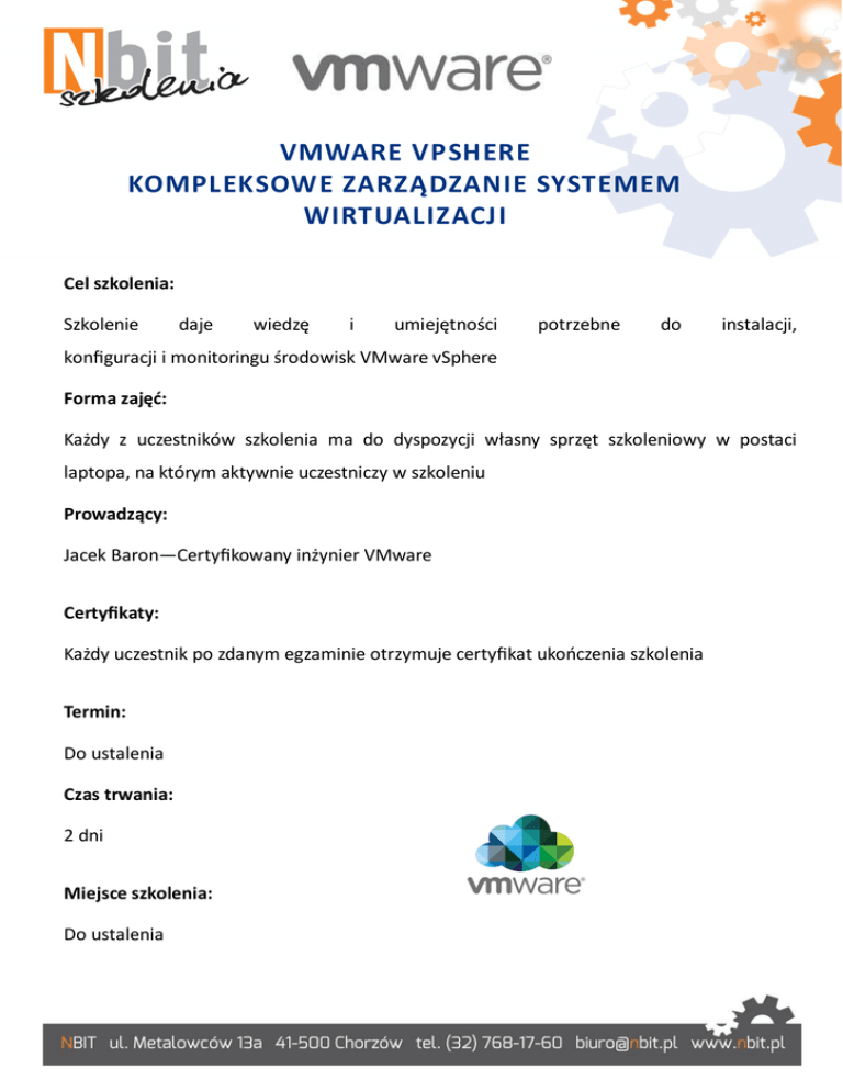 VMWARE VPSHERE KOMPLEKSOWE ZARZĄDZANIE SYSTEMEM WIRTUALIZACJI Cel szkolenia: Szkolenie daje wiedzę i umiejętności potrzebne do instalacji, konfiguracji i monitoringu środowisk VMware vSphere Forma zajęć: Każdy z uczestników szkolenia ma do dyspozycji własny sprzęt szkoleniowy w postaci laptopa, na którym aktywnie uczestniczy w szkoleniu Prowadzący: Jacek Baron—Certyfikowany inżynier VMware Certyfikaty: Każdy uczestnik po zdanym egzaminie otrzymuje certyfikat ukończenia szkolenia Termin: Do ustalenia Czas trwania: 2 dni Miejsce szkolenia: Do ustalenia AGENDA SZKOLENIA Dzień 1 Dzień 2 1. Wstęp do świata VMware 1. Instalacja serwera vCenter informacje dotyczące wirtualizacji instalacja vCenter Appliance opis komponentów vSphere 2. Konfiguracja serwera vCenter konfiguracja i zarządzanie wirtualnymi 2. Instalacja serwera ESXi wybór nośnika przechowywania danych serwera sieciami instalacja serwera z obrazu iso konfiguracja i zarządzanie zasobami dyskowymi vSphere 3. Konfiguracja podstawowa serwera ESXi konfiguracja ESXi z iSCSI, NFS i Fibre Channel ustawienia hasła / klawiatury konfiguracja i zarządzanie vSphere datastore ustawienia kart sieciowych 3. Zarządzanie maszynami wirtualnymi ustawienia troubleshootingu / ssh szablony i klonowanie maszyn wirtualnych zarządzanie i modyfikacje maszyn 4. Instalacja clienta vSphere 5. Zarządzanie serwerem ESXi poprzez clienta vSphere 6. Tworzenie wirtualnych maszyn wirtualnych tworzenie i zarządzanie migawkami maszyn 4. Konfiguracja i zarządzanie klastrem HA w 7. Migracja wirtualnych maszyn przenosiny maszyn fizycznych przenosiny maszyn wirtualnych vSphere konfiguracja i zarządzanie klastra VMware High Availability (HA) 5. Zarządzanie zasobami i ich monitorowanie obciążenie CPU i pamięci konfiguracja i zarządzanie polami zasobami alerty i monitoring